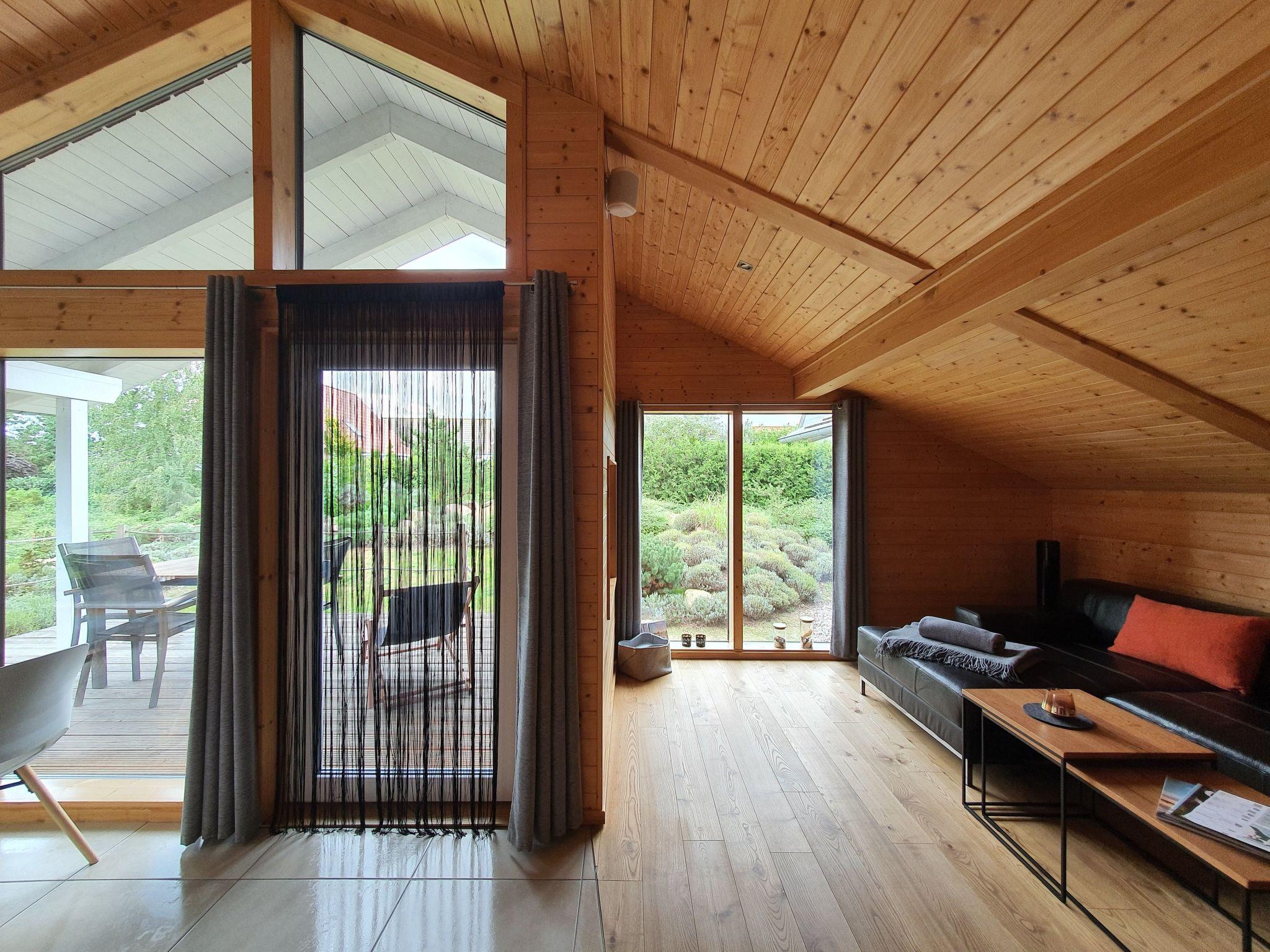 The outdoor area of each house is characterised by alcove-like, covered wooden terraces that invite you to socialise on long summer evenings. For children, a secure play area inside the house fulfils all dreams. Each holiday home also has a private parking space and a barbecue, perfect for cosy evenings. The communal experience is rounded off by a spacious sauna, which can be used by all guests of the holiday complex. Here you can sign up for private wellness times and enjoy the cold season to the full.