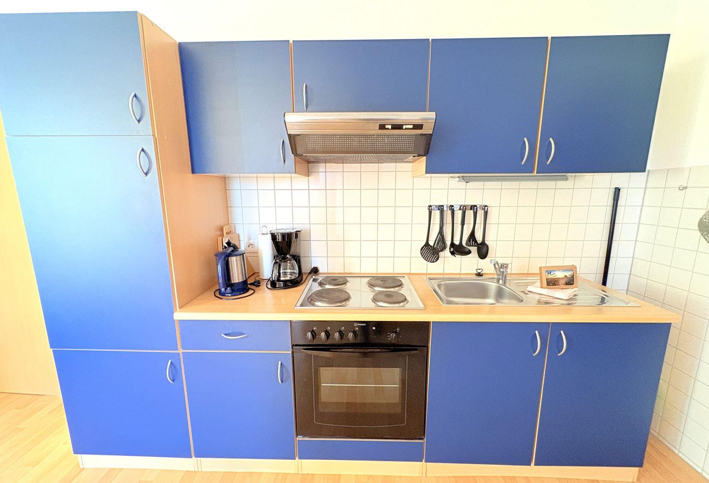 Die moderne Küche ist bestens ausgestattet und ideal für Selbstversorger: Neben einem Kühlschrank stehen Ihnen auch ein Backofen und eine Kaffeemaschine zur Verfügung – perfekt für kleine und große Genussmomente.