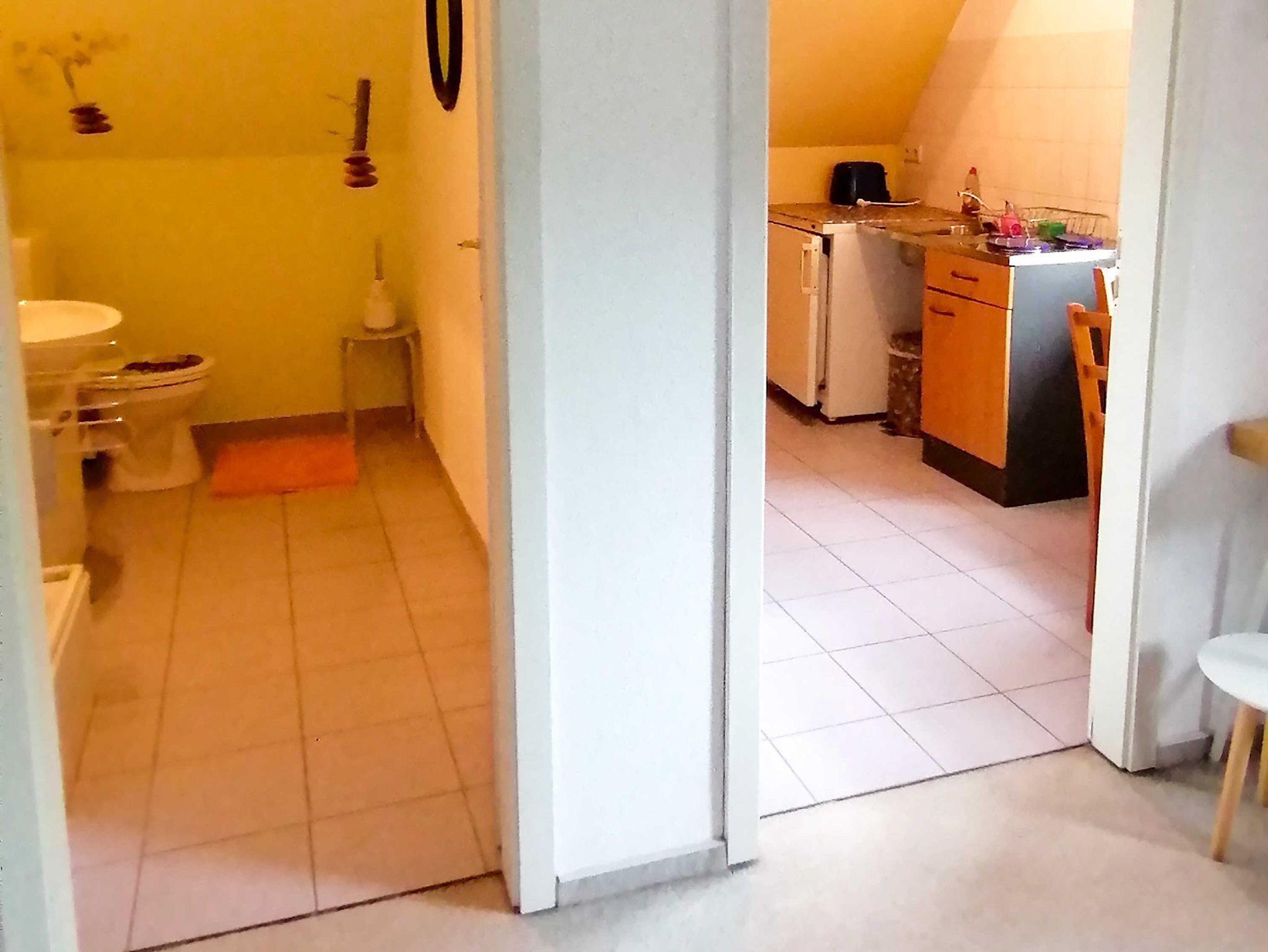 Die 29 m² große Ferienwohnung 2 befindet sich im Obergeschoss des mit Reet gedeckten Einfamilienhauses der Vermieter, klein, fein und ideal für Alleinreisende, Paare oder Kurzurlauber. Die 1-Raum-Wohnung verfügt über ein Duschbad mit WC, eine separaten Küche und einen Wohnraum mit französichem Bett (140x200), Schreibtisch, großem Kleiderschrank und Fernseher. In der separaten Küche befindet sich eine Pantryküche, mit 2 Herdplatten und Spüle, eine Küchenzeile mit Kaffeemaschine, Wasserkocher und Mikrowelle, Toaster und ausreichend Geschirr, sowie ein kleiner Kühlschrank. Der Essbereich in der Küche bietet dir Platz für zwei Personen. Die gemütliche, modern eingerichtete Unterkunft eignet sich hervorragend für Fahrradtouristen und Kurzurlauber. Für Fahrräder gibt es eine Unterstellmöglichkeit auf dem Hof mit E-Bike-Ladestation, die kostenfrei genutzt werden kann. Die Wohnung ist über den Haupteingang des Hauses erreichbar.
