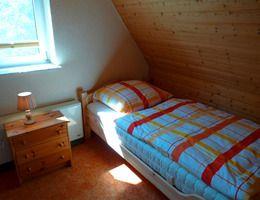 Die Schlafzimmer befinden sich im Dachgeschoss und sind über eine recht steile Treppe zu erreichen. Eines der Schlafzimmer ist eingerichtet mit einem Doppelbett, einer Kommode und einem Hocker. Das zweite Schlafzimmer hat zwei Einzelbetten, auch eine Kommode und einen Hocker. Zwischen den beiden Zimmern im kleinen Flur gibt es eine Kleiderstange.
