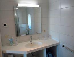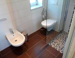 Das Bad ist ausgestattet mit einer ebenerdigen Dusche, einem Bidet, dem WC, einem Waschtisch mit Ablagen, sowie einem Spiegel und einer Handtuchheizung.