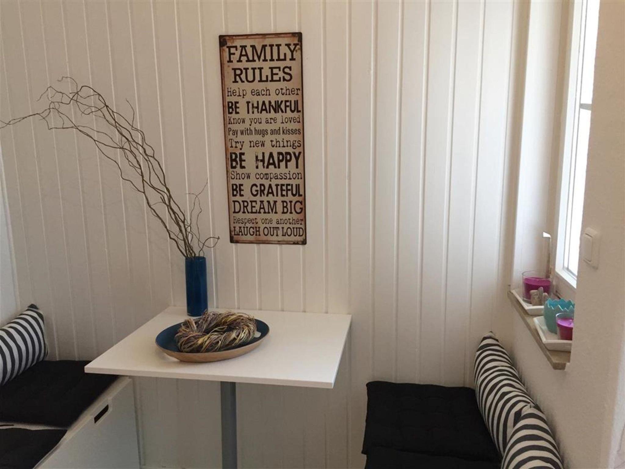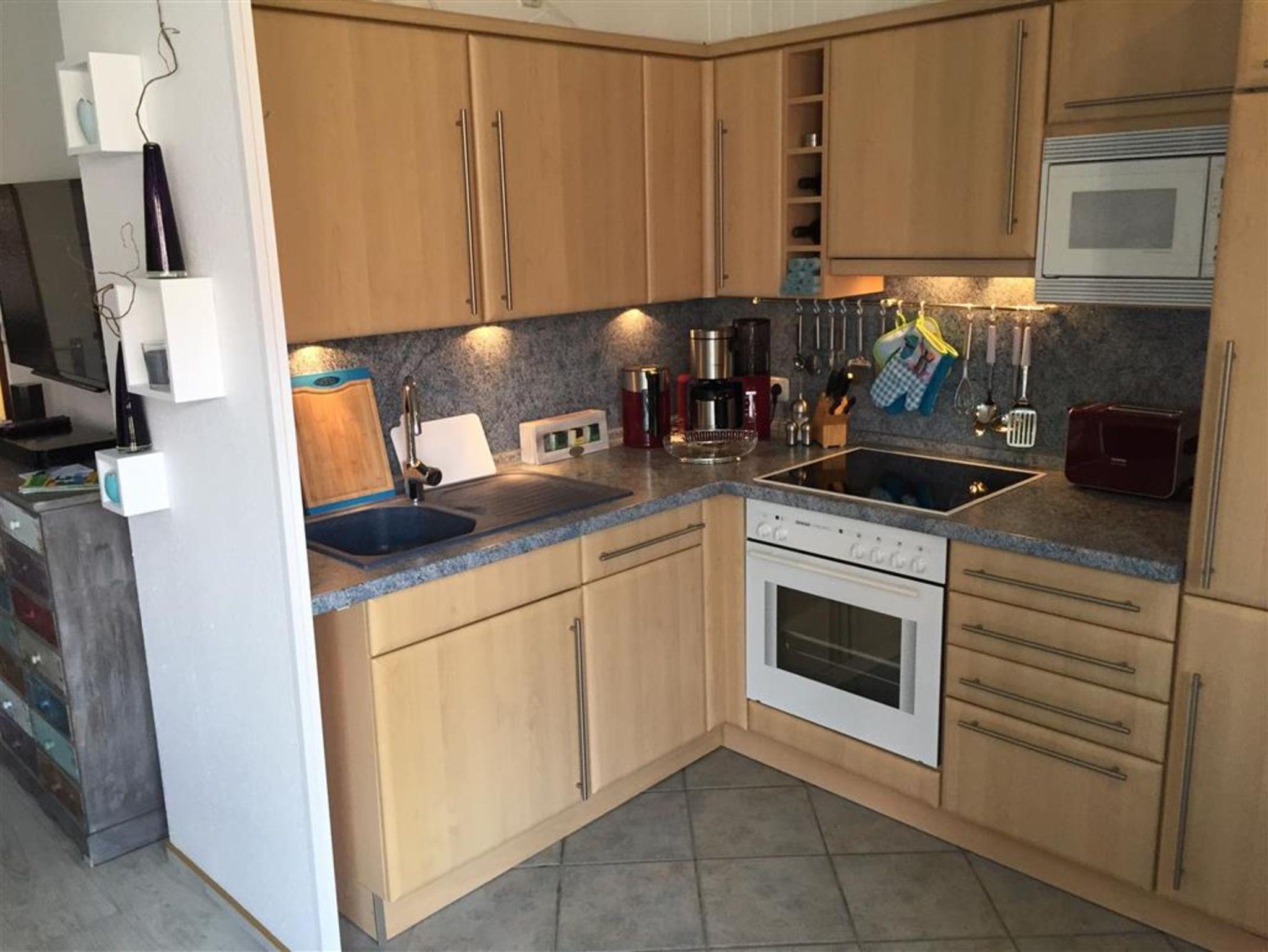 Die voll ausgestattete Küche verfügt über Ceranfeld, Backofen, großen Kühlschrank, Gefrierschrank, Spülmaschine, Mikrowelle und einen praktischen Apothekerschrank für Vorräte. Individuell ausgewähltes Geschirr und Besteck für Groß und Klein sorgt für eine angenehme Atmosphäre am liebevoll restaurierten Esstisch.