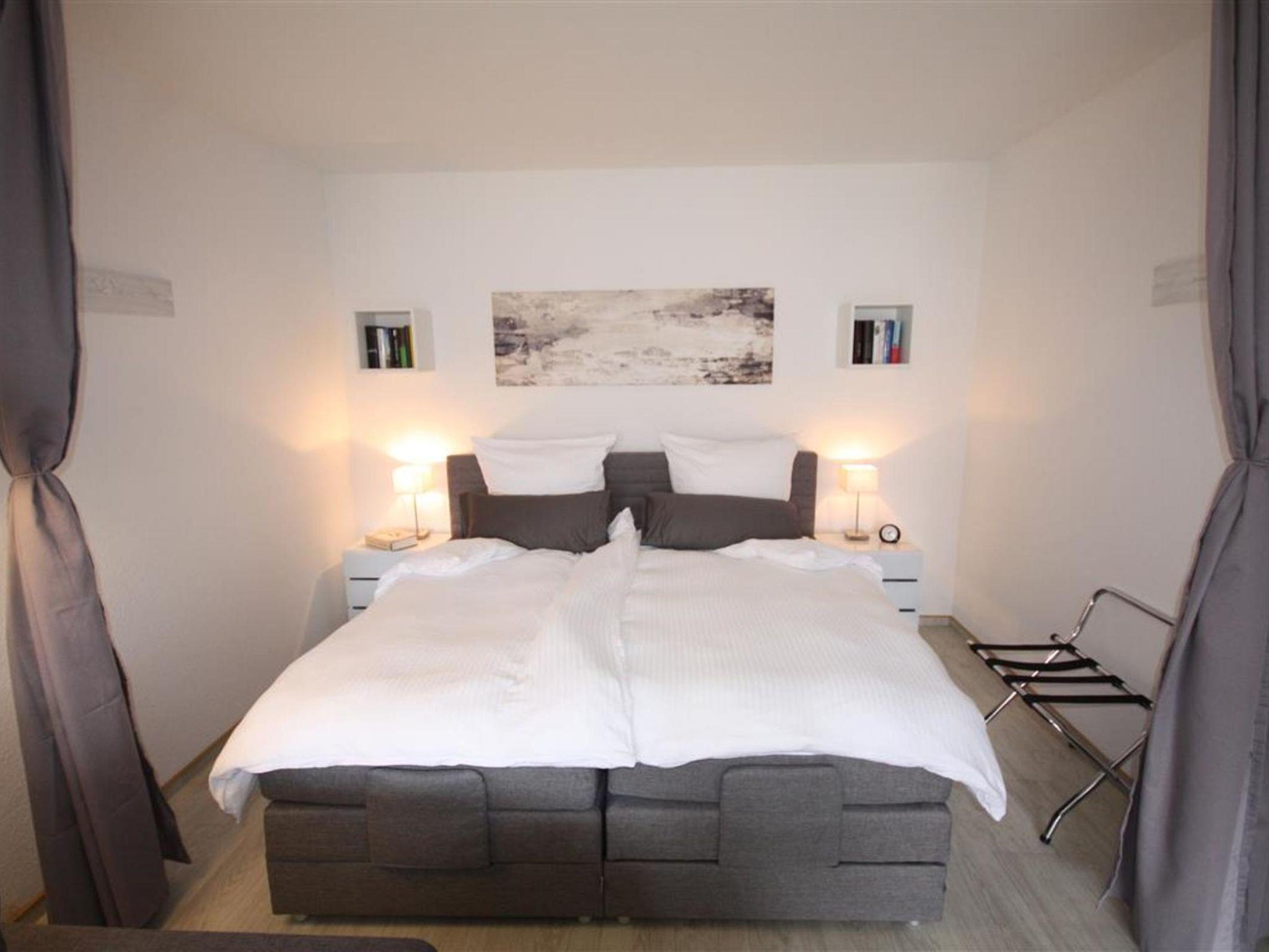 Die Schlafnische im Wohnbereich ist mit einem Boxspringbett (180×200 cm) ausgestattet und bietet erholsamen Komfort für zwei Erwachsene. Das separate Kinderzimmer verfügt über zwei großzügige Etagenbetten (je 90×200 cm) für bis zu vier Personen. Für die jüngsten Gäste stehen ein Beistellbett, ein Reisebett, eine Wickelkommode mit Babybadewannesowie ein Hochstuhl bereit.