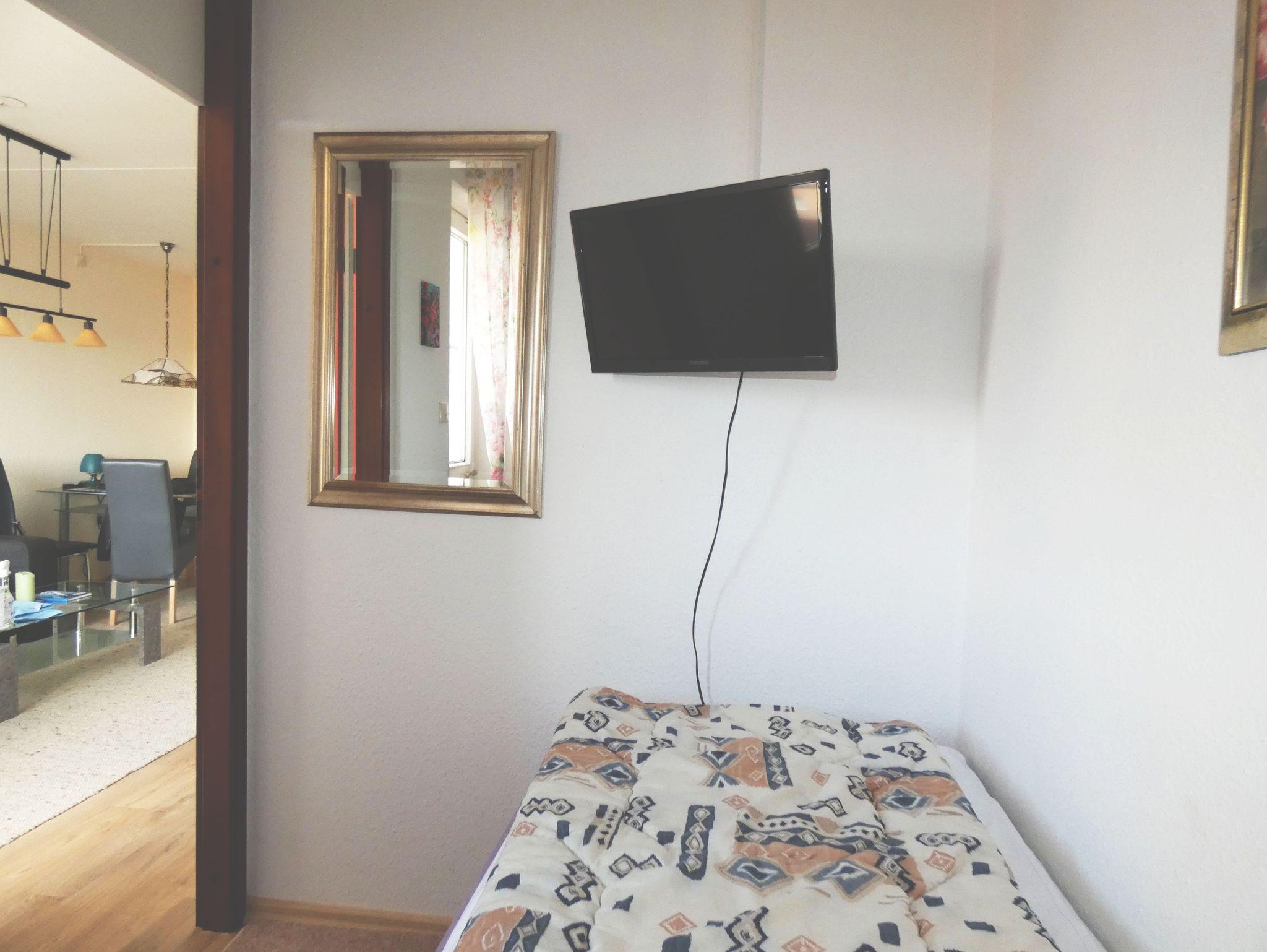 -Kleines Gästezimmer: Einzelbett 90x200cm, kleine Schubladenkommode, Fernseher.