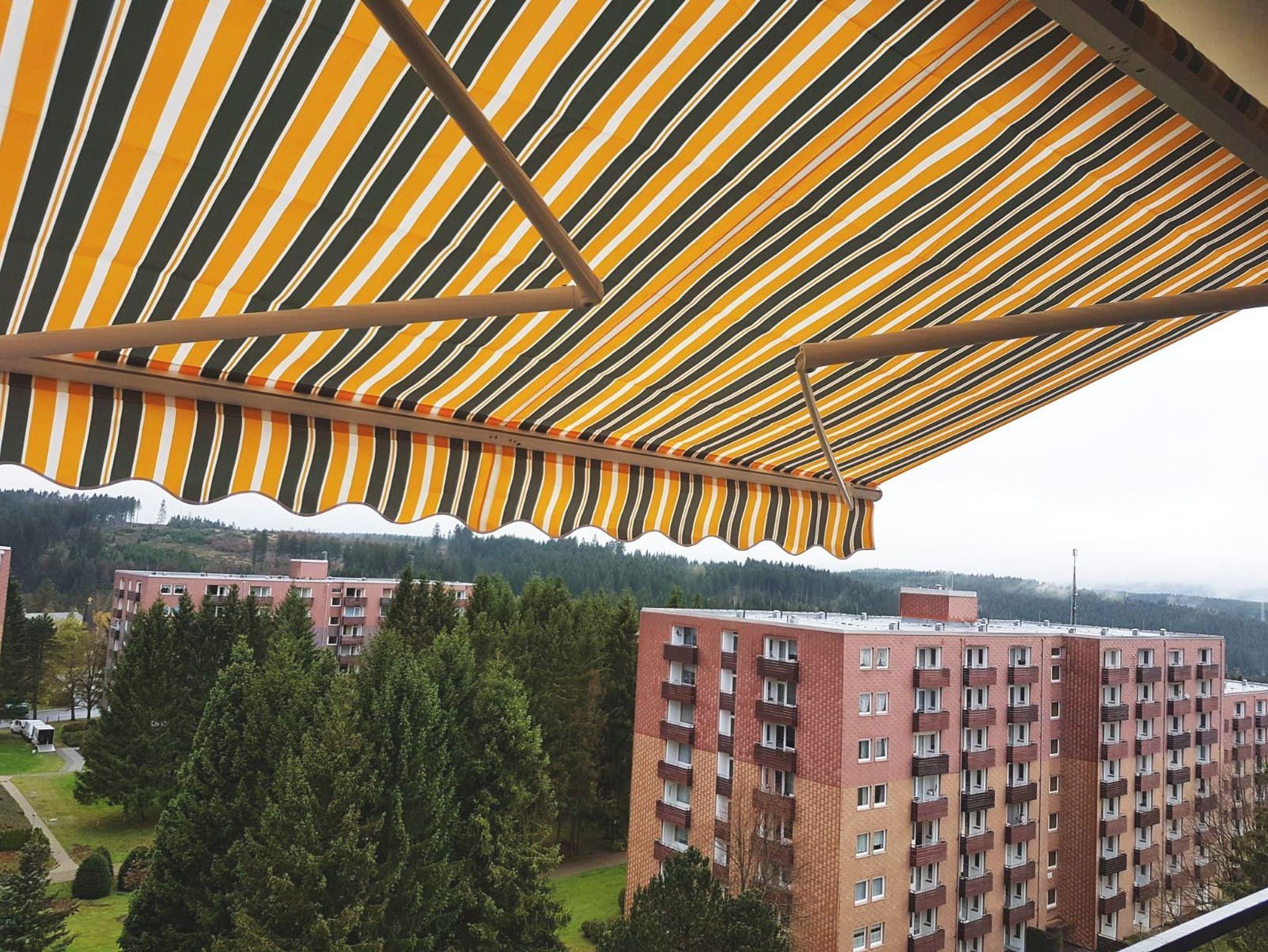 -Balkon: Gefliest, mit passenden Möbeln Balkontisch und zwei Klapp-Sitz-Liegestühlen; Markise.