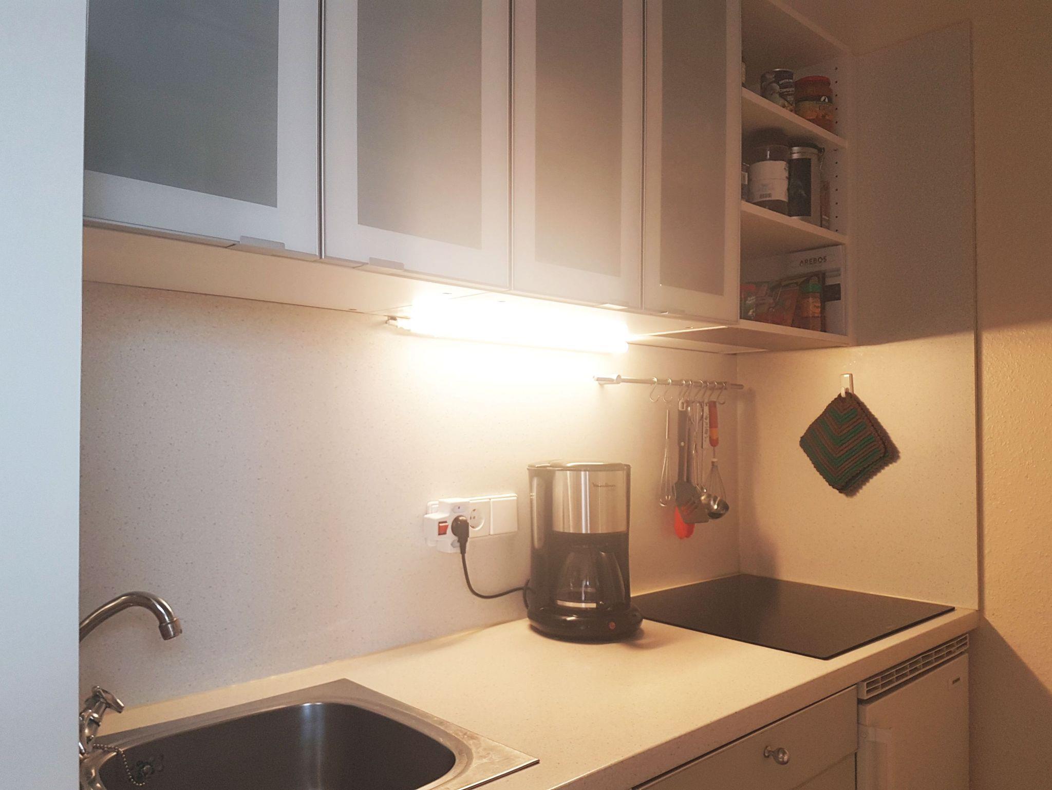 -Küche: verfügt über einen Backofen, Mikrowelle, Ceranfeld, Kühlschrank, Kaffeemaschine, Wasserkocher und Toaster. Küchenutensilien und Geschirr sind ebenfalls reichlich vorhanden.