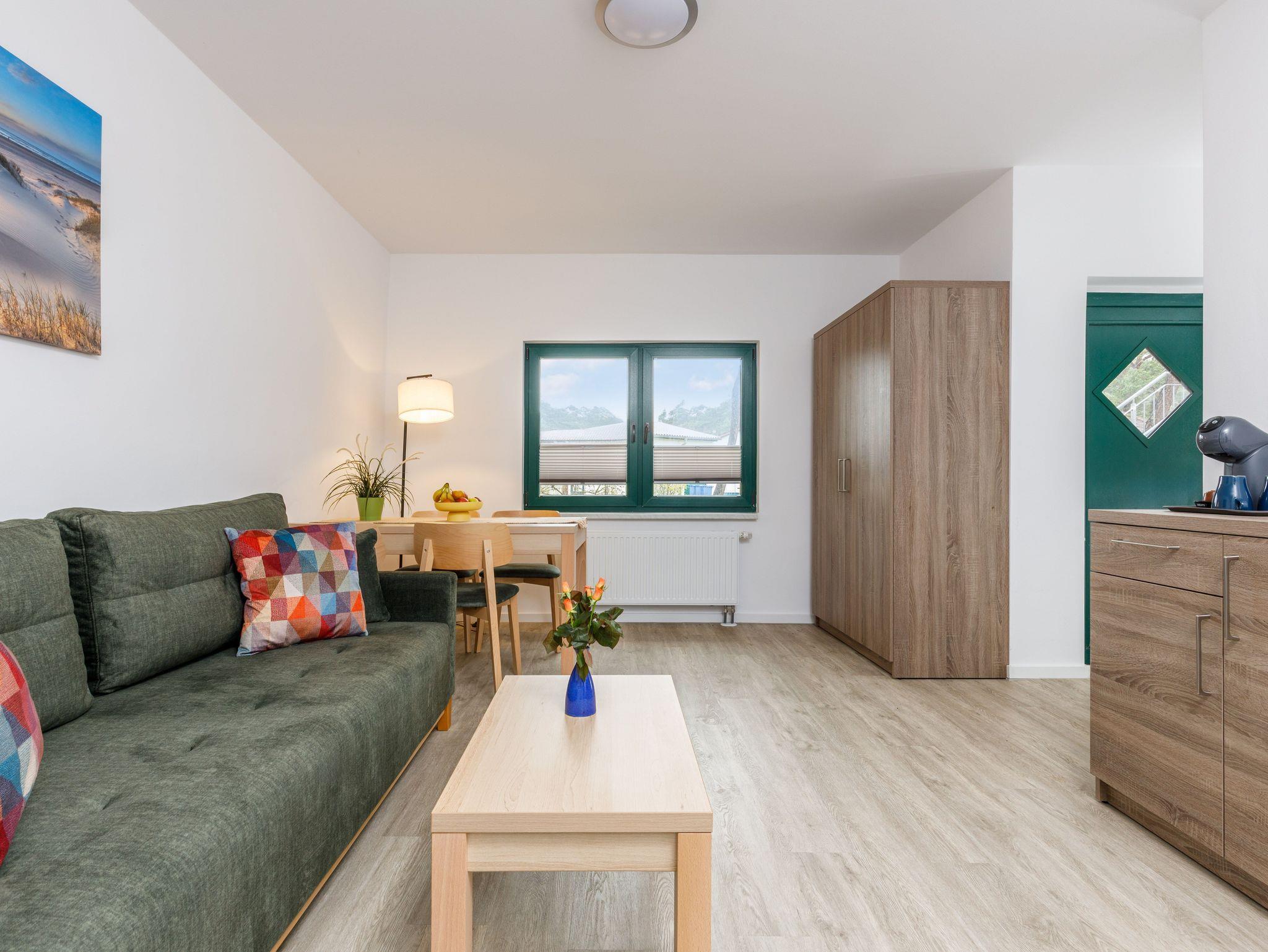Das Apartment verfügt über ein Schlafzimmer mit Doppelbett sowie einen Wohnbereich mit Schlafsofa und eignet sich ideal für Paare oder kleine Familien.