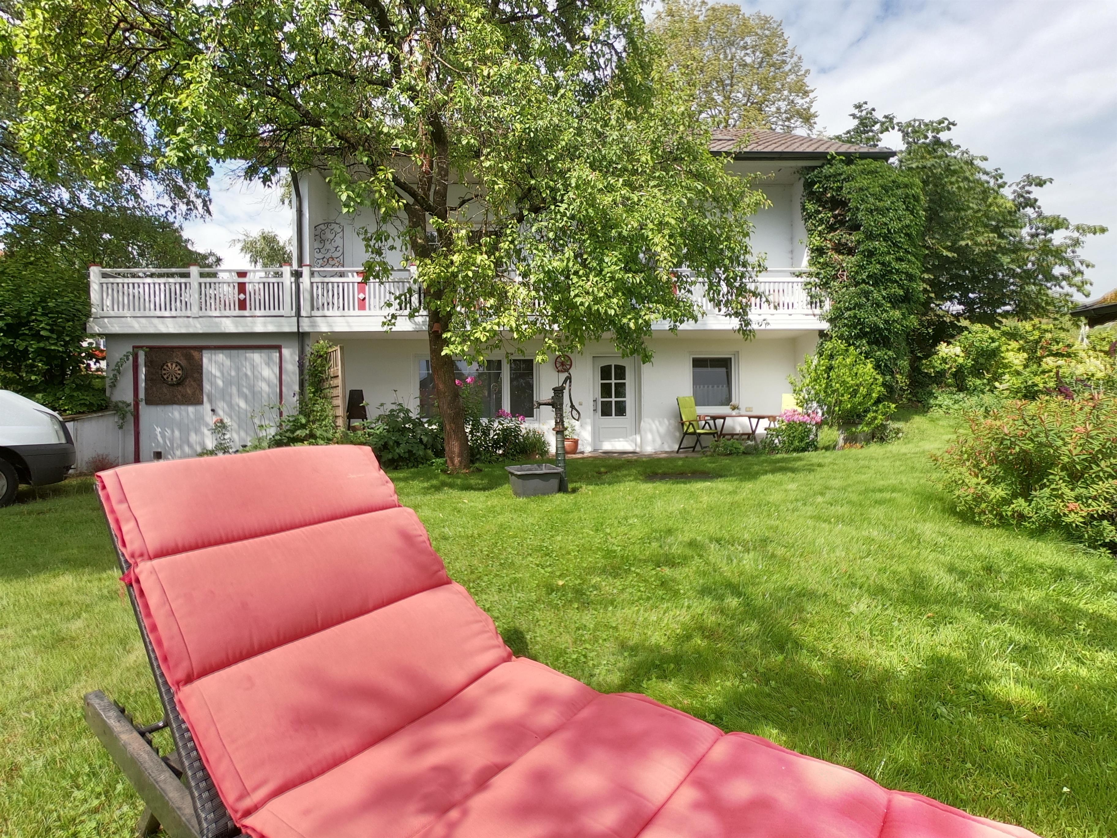 Der sich an die Terrasse anschließende Garten ist naturnah gestaltet und konsequent ökologisch gepflegt: In den Beeten wachsen einheimische, insektenfreundliche Stauden, das Gartenhäuschen hat eine Dachbegrünung und die Gartenbewässerung erfolgt mit Regenwasser, das mittels Pumpe aus der Zisterne gefördert wird. Für Ihre Entspannung im Garten auf der Liegewiese stehen Liegen mit Auflagen zur Verfügung.