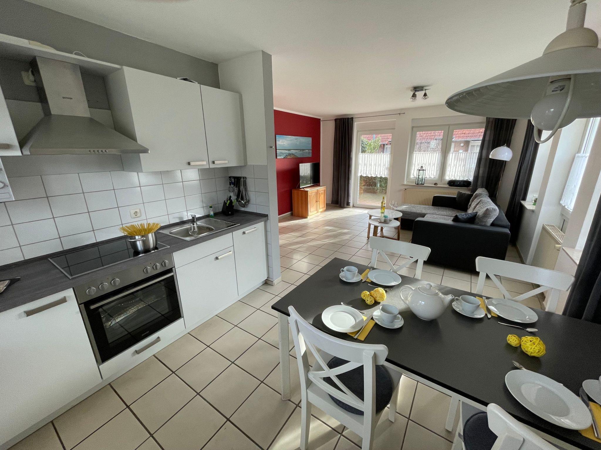The holiday flat is located on the ground floor of a quiet house with four holiday flats at Kurpromenade 8, a quiet cul-de-sac not far from the maritime marina of Harlesiel. Within walking distance you can reach the beach (distance approx. 400 metres) and the Cliner spring (distance approx. 500 metres) The flat with separate entrance has a light-flooded living room with sofa set and satellite TV, dining area and modern, fully equipped kitchen (with dishwasher and microwave). A highlight of the flat is the sunny south-facing terrace with high-quality garden furniture and its own large garden, which also faces south. In addition to the master bedroom with a cosy double bed, the flat also has a small bedroom with a single bed. A brightly furnished shower room rounds off this well-equipped flat. The flat can be used by up to 4 people and a small child and has its own storage room for pushchairs, bicycles etc. Bed linen and towels must be brought by the tenant and WLAN is available to guests free of chargeShort descriptionOther : Non-smoking houseShort description 1Number of kitchens : 1