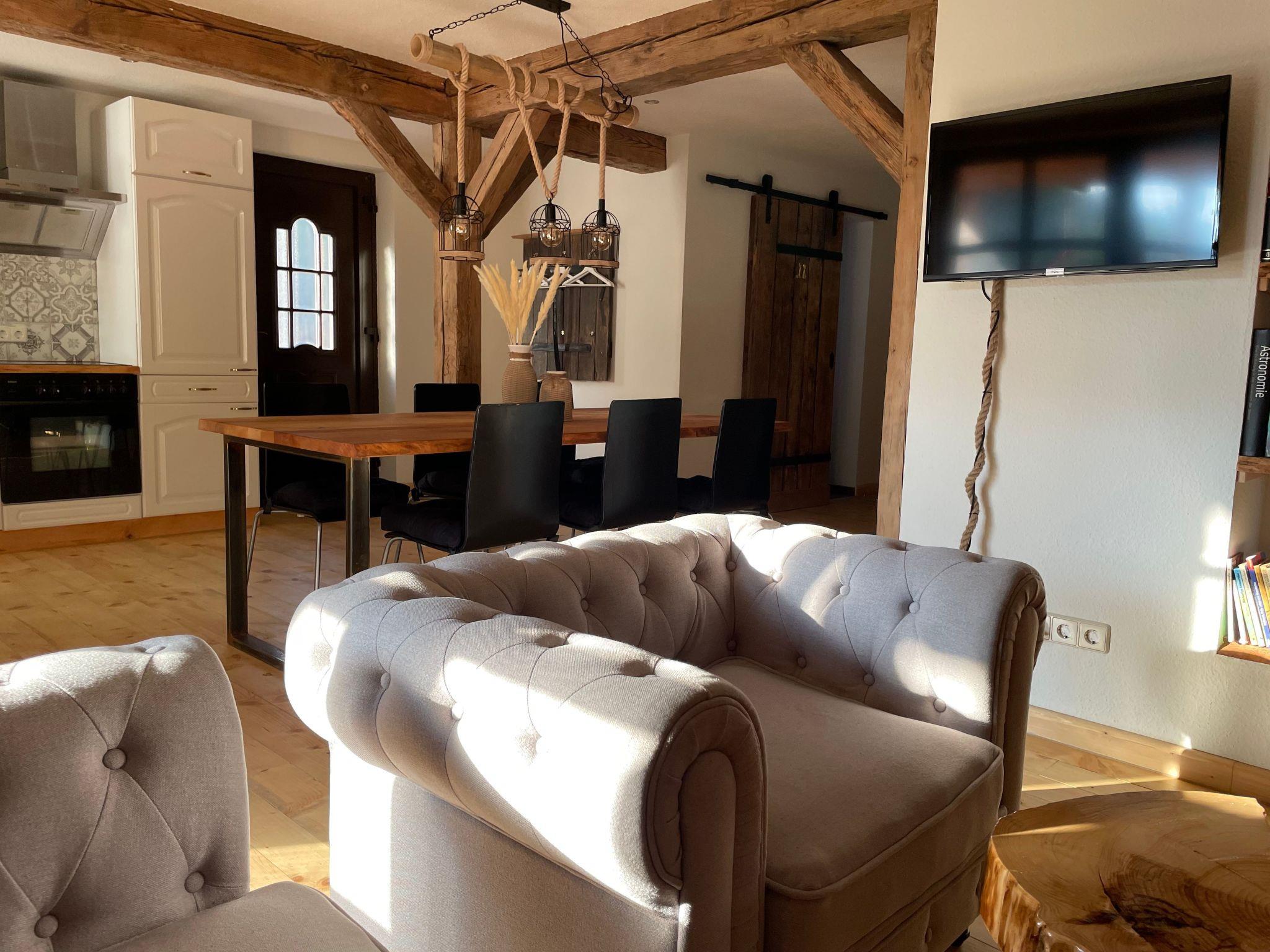 The layout of the beds is as follows. The large bedroom on the 1st floor has a large double bed and two individual single beds that can be placed anywhere in the room. Downstairs is the smaller bedroom with two single beds.A travel cot, a baby changing unit and a dining chair for children are also on site.The small cottage has a spacious living/dining areaA fully equipped kitchenA bathroom with underfloor heating and walk-in shower.BooksInternet TVRetreatsFireplace etc.