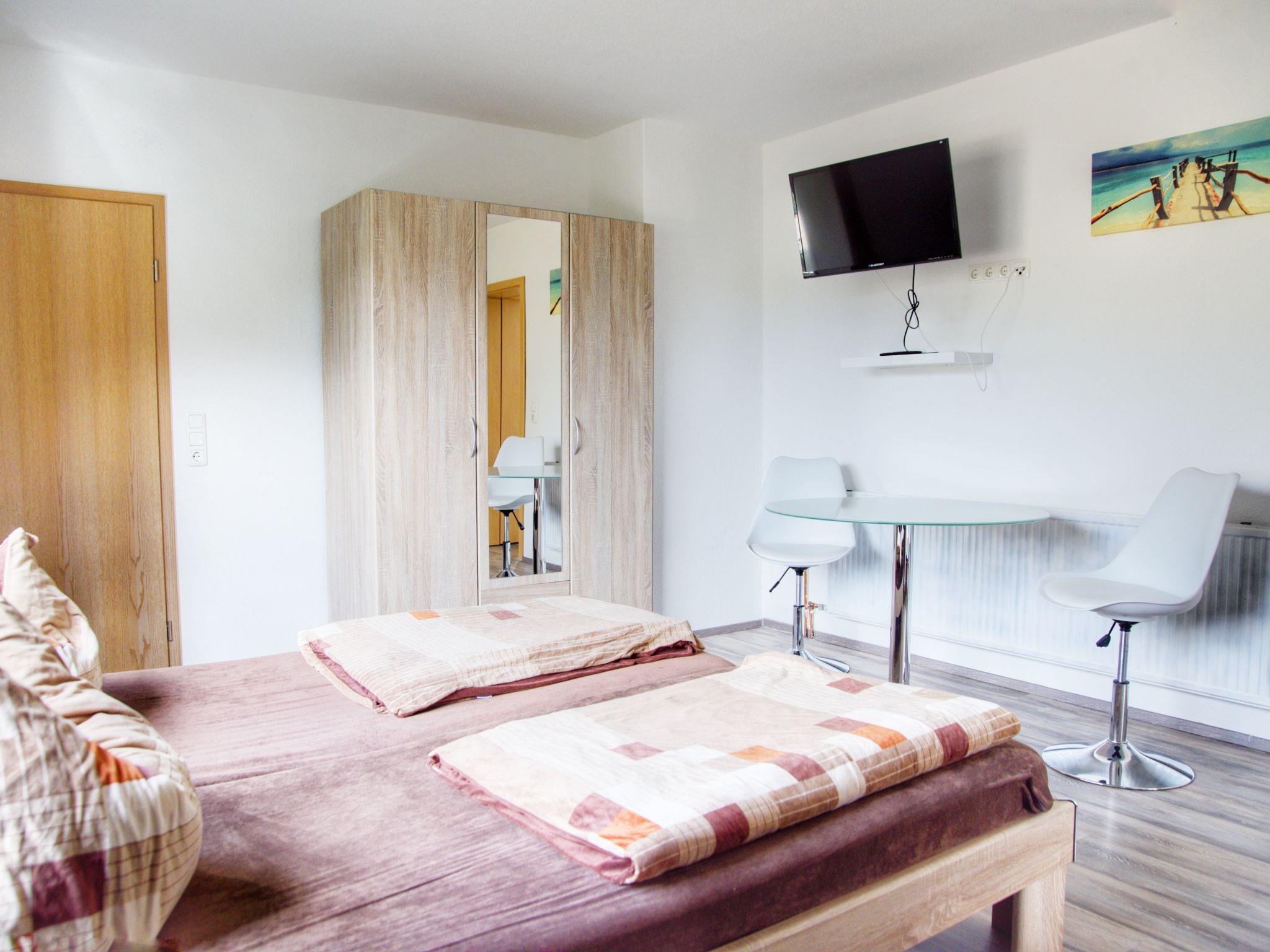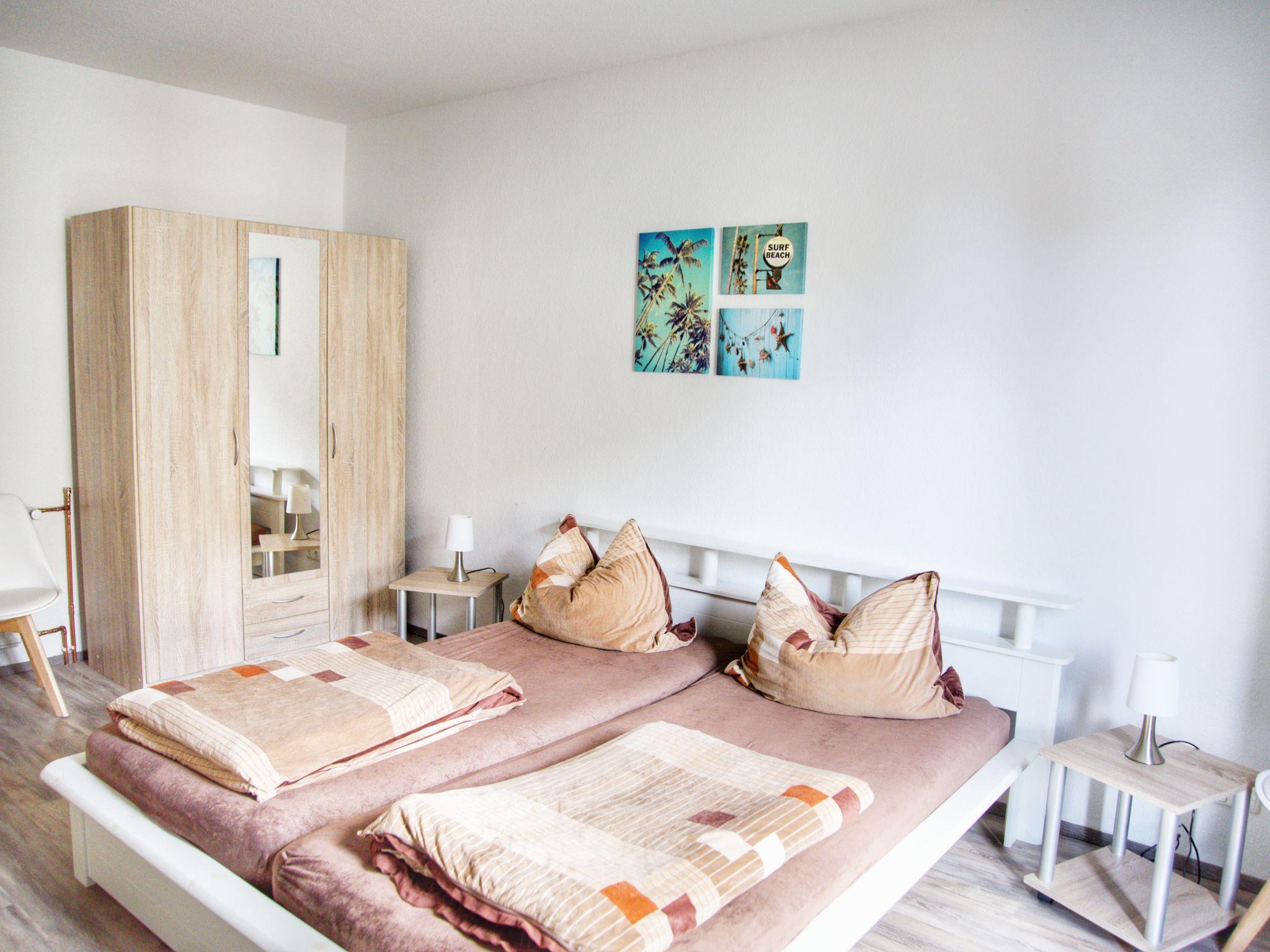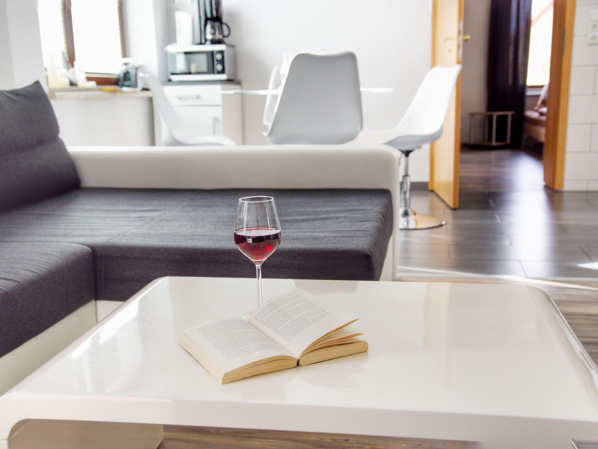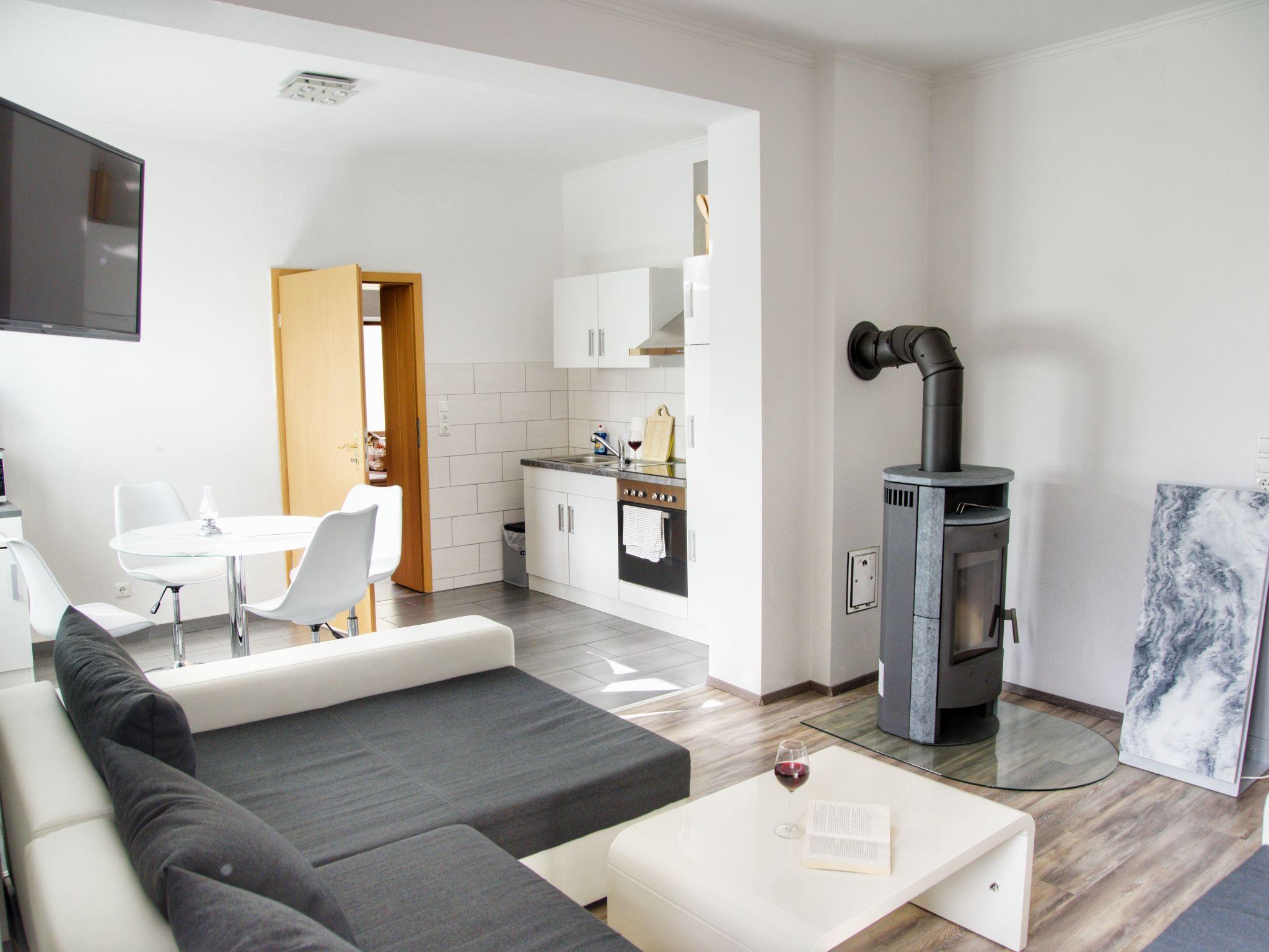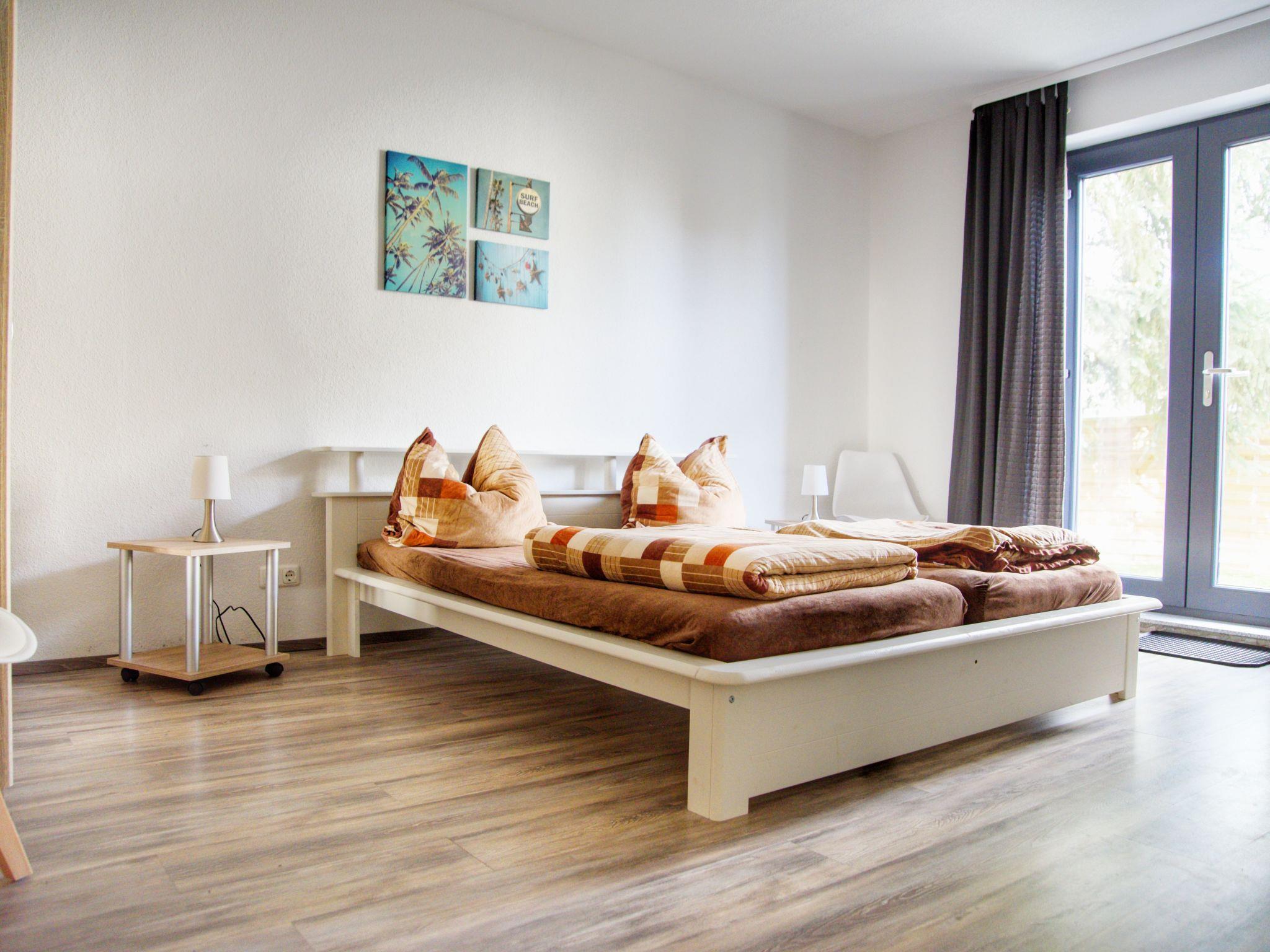 This beautiful holiday home flat is very modernly furnished on its 110 square metres. The living space is divided into two bedrooms, each with a spacious double bed (180 cm x 210 cm) surrounded by two bedside tables with reading lamps on both sides, a flat-screen TV in one bedroom and a guest toilet in the other bedroom. There is always a spacious wardrobe with mirrored doors in front of the bed, providing ample storage space for your luggage. The centrepiece of the flat is the 45 m² living room and bedroom with integrated kitchenette and comfortable dining area. Relax on the pull-out leather couch (2.25 m x 1.74 m) after a day out, while the flat-screen TV with satellite TV and TV-USB connection provides entertainment. When pulled out, the sofa provides a comfortable place to sleep for two people. The open-plan kitchen allows you to prepare your own meals using a four-zone hob, an oven, a fridge with freezer compartment and numerous small electrical appliances, from a toaster and microwave to a coffee machine. Take a seat in the attractive dining area for communal meals! The bathroom has a floor-level shower, a wash hand basin with WC and towel dryer, as well as a bathroom window and underfloor heating. The flat is heated with oil heating.