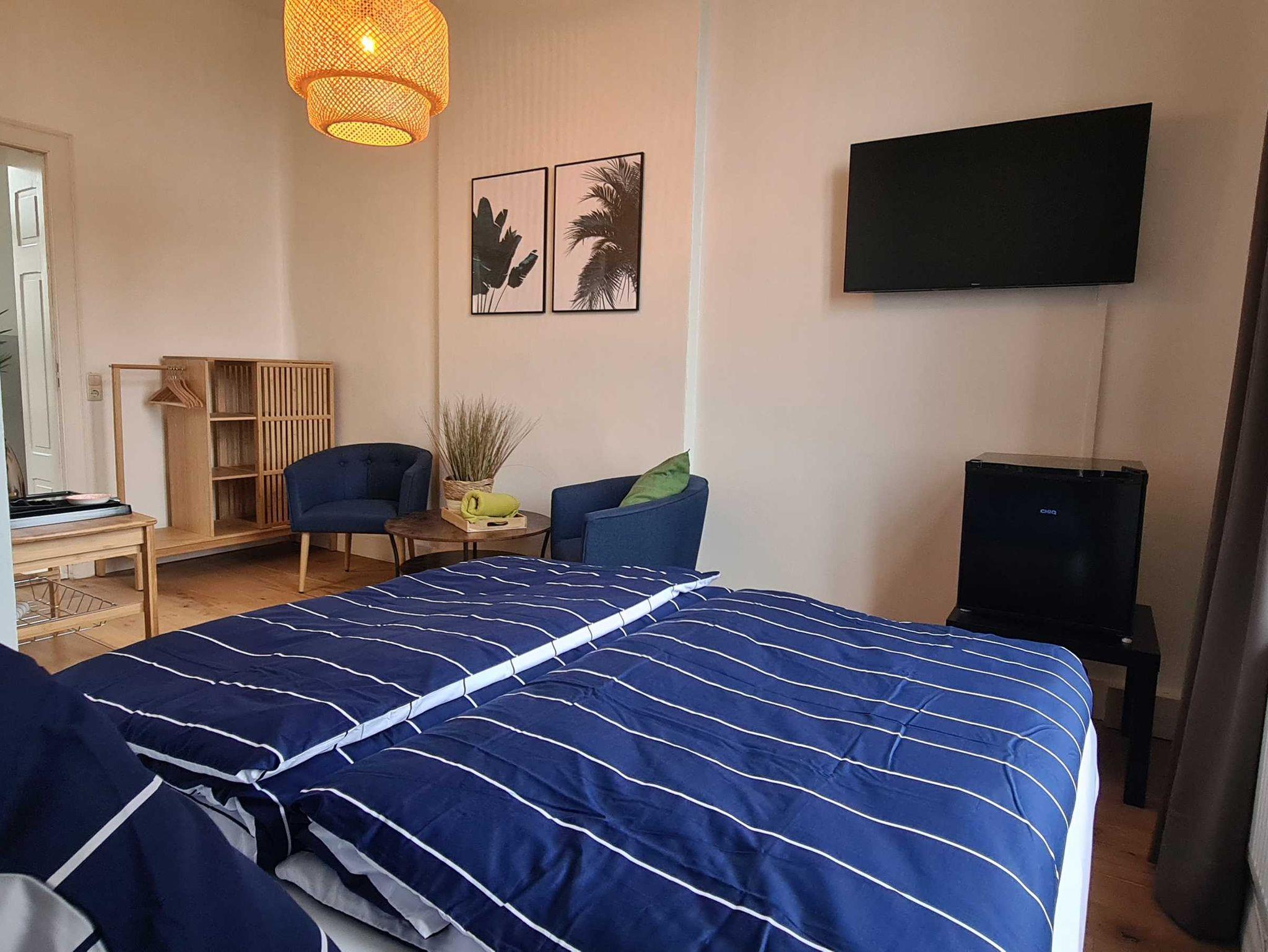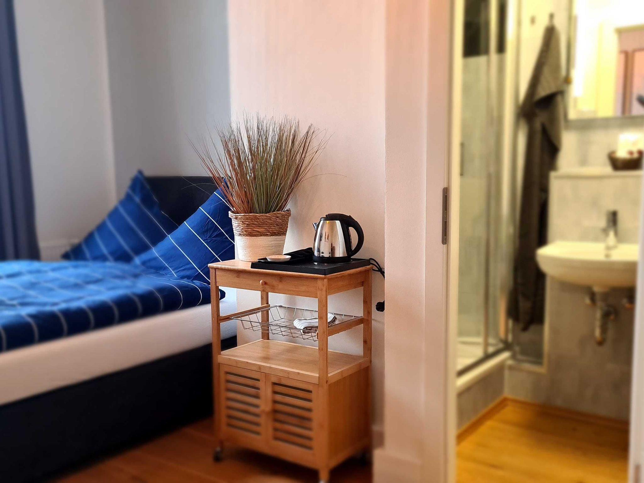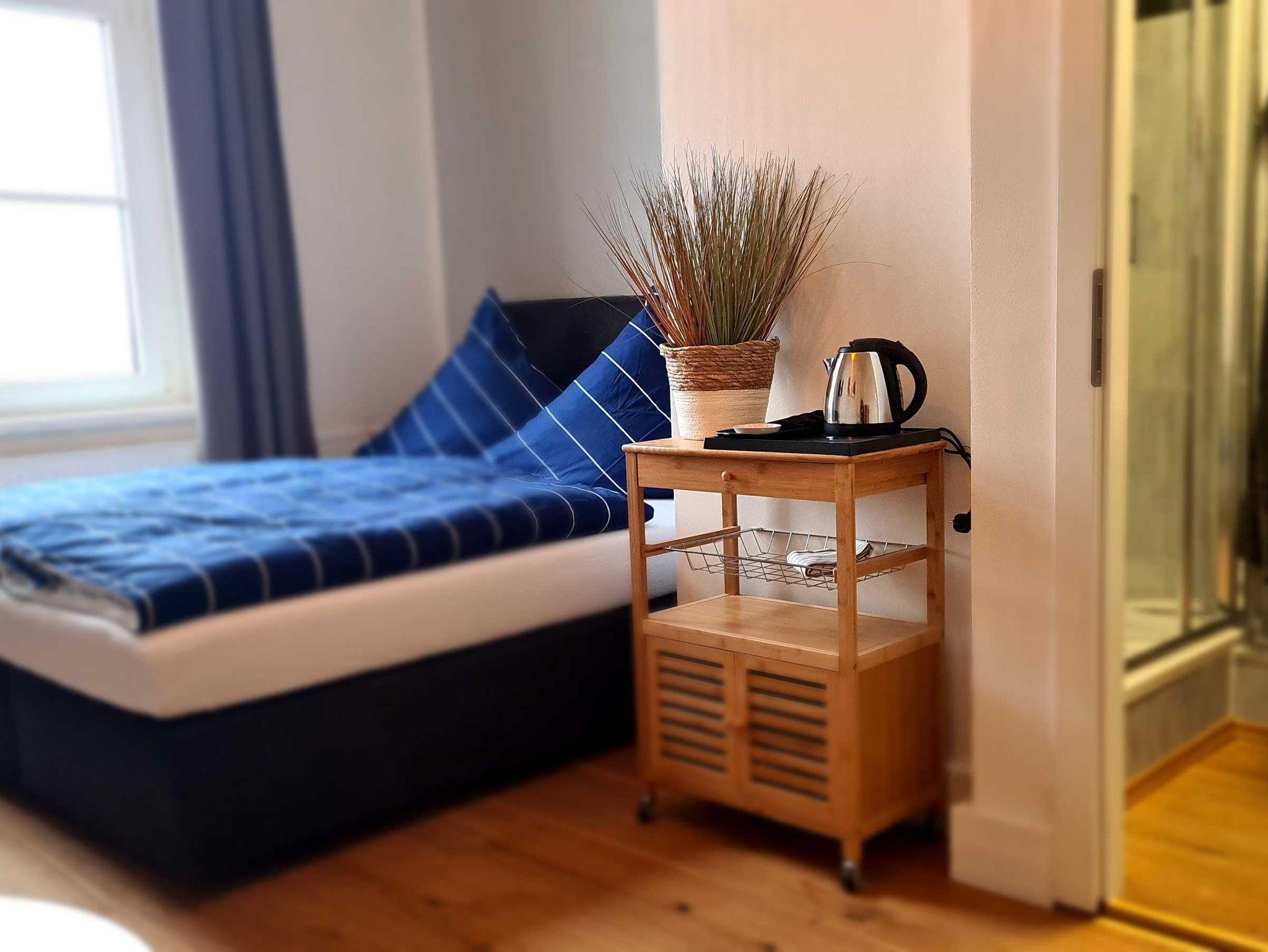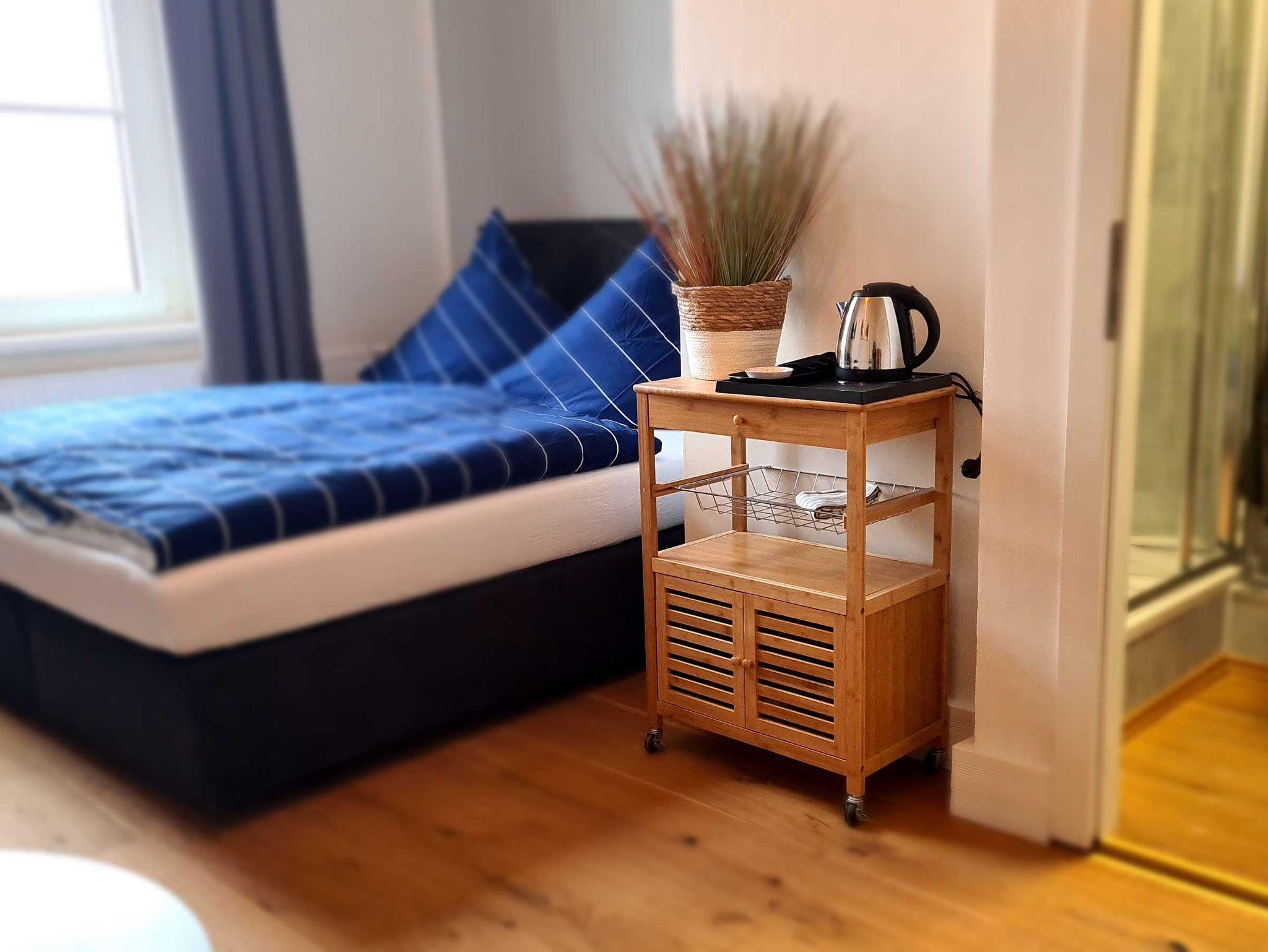 Alle Zimmer Nichtraucherzimmer mit Boxspringbett (Doppelbett), Flachbild-TV, Smart-TV, W-LAN, Bad mit Dusche oder Badewanne, WC. Minikühlschrank, Wasserkocher und Geschirr.