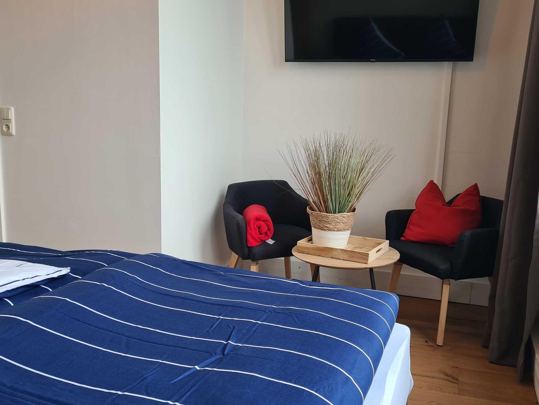 Alle Zimmer Nichtraucherzimmer mit Boxspringbett (Doppelbett), Flachbild-TV, Smart-TV, W-LAN, Bad mit Dusche oder Badewanne, WC. Minikühlschrank, Wasserkocher und Geschirr.