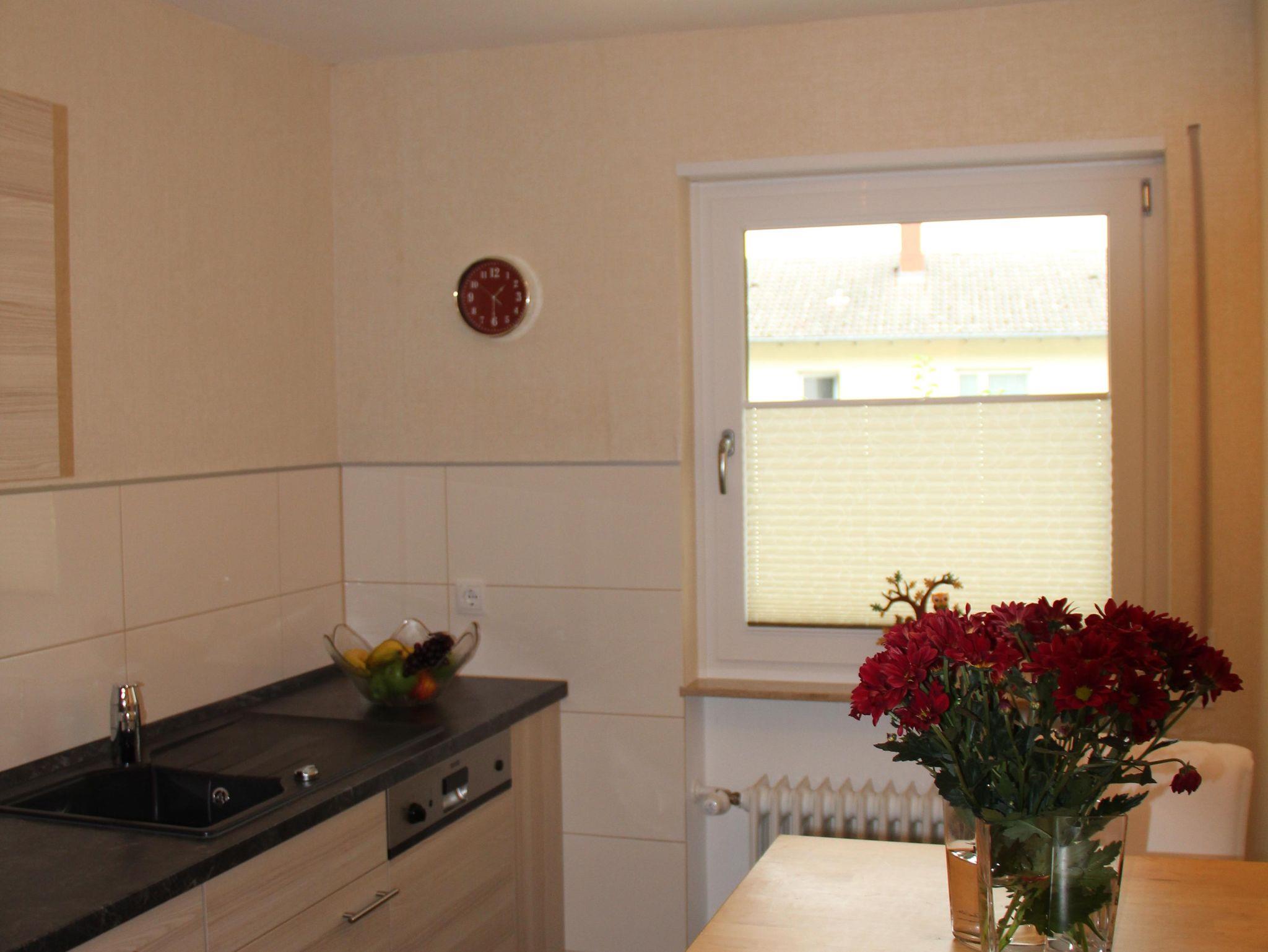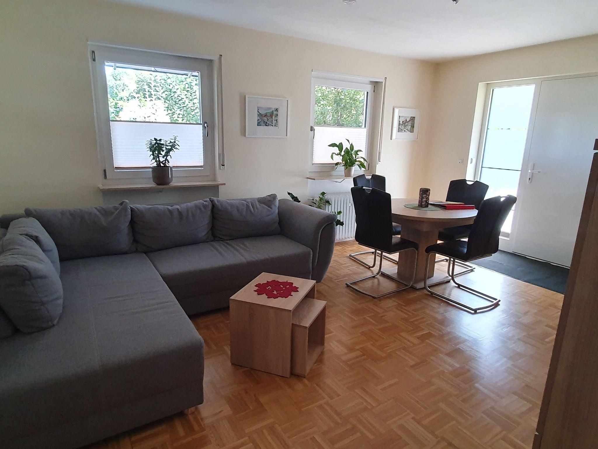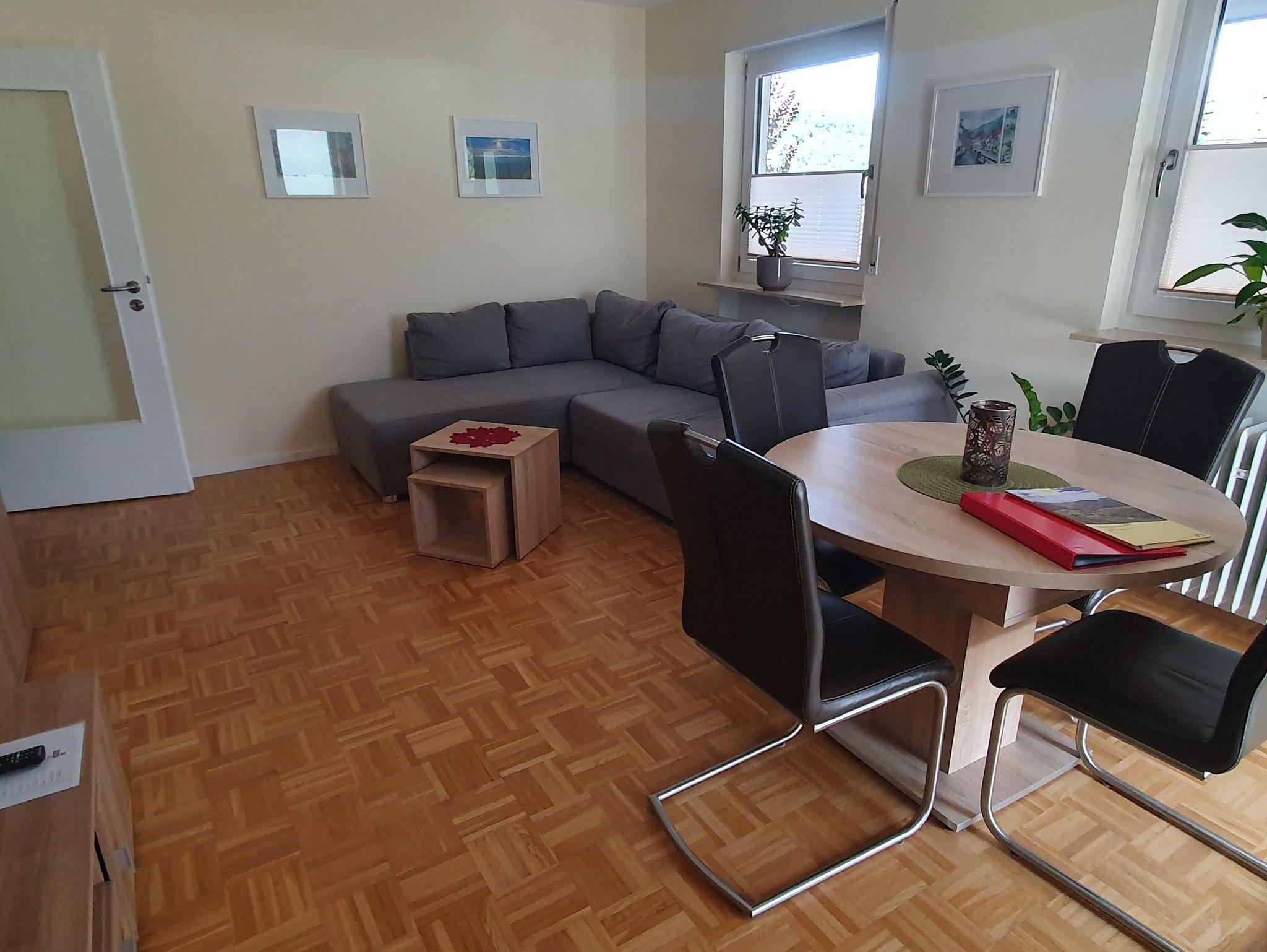 Unsere komfortable Ferienwohnung verfügt über eine komplett eingerichtete Küche, ein großes Schlafzimmer, ein modernes Badezimmer mit Badewanne, separater Dusche und Fußbodenheizung. Im Wohn-/Esszimmer befinden sich ein Full-HD-Fernseher inkl. Sat-Anschluss, eine Kompaktanlage (Radio, CD) sowie ein Telefon. Seit 2018 eine neue Schlafcouch im Wohnzimmer mit einer Liegefläche von 1,40 x 2,10 m.In der gesamten Wohnung haben Sie kostenfreien Zugang zum W-LAN. Auf Anfrage stellen wir gerne kostenlos Babybett und Hochstuhl bereit. Kinder bis 12 Jahre übernachten kostenfrei.