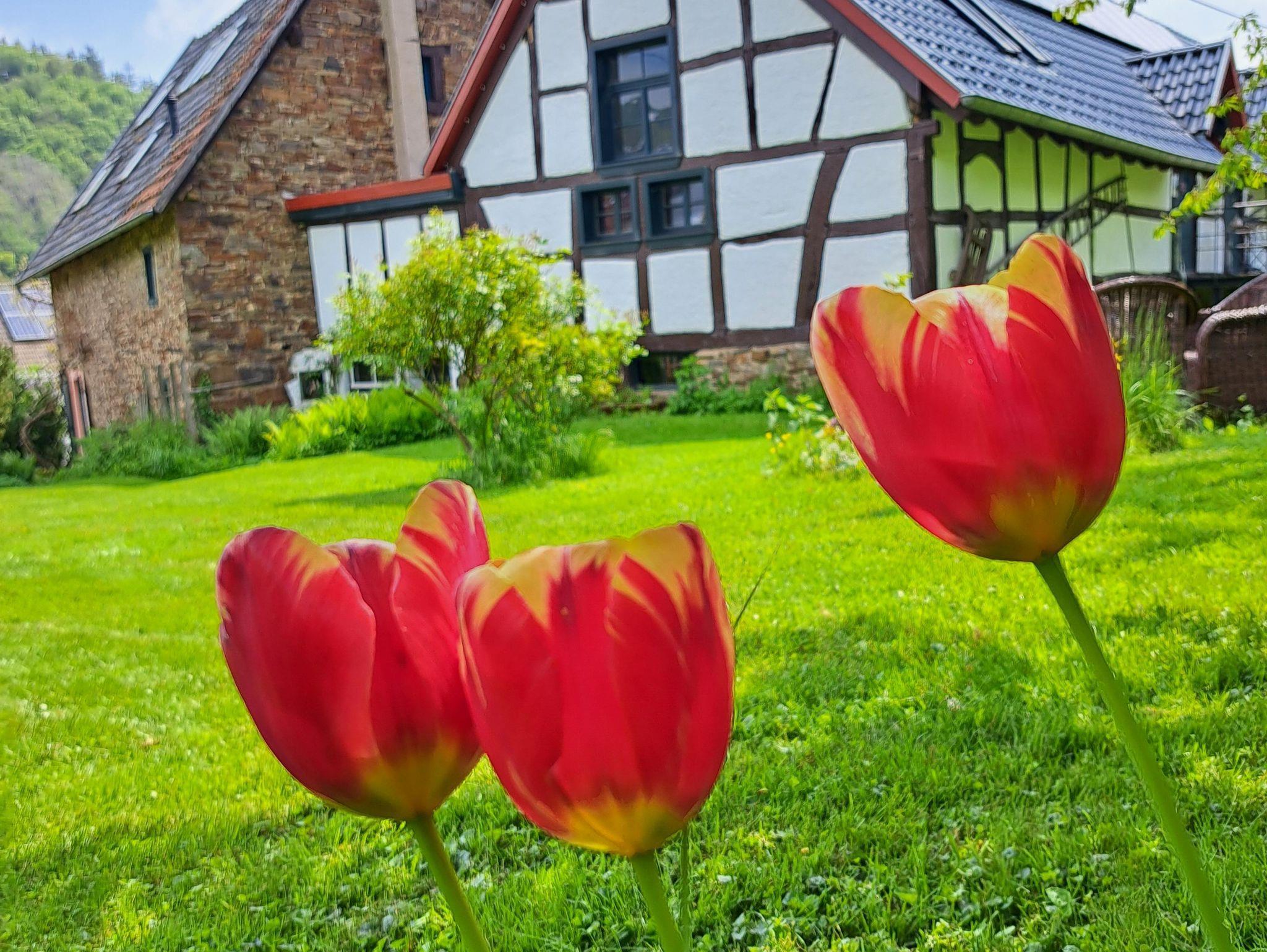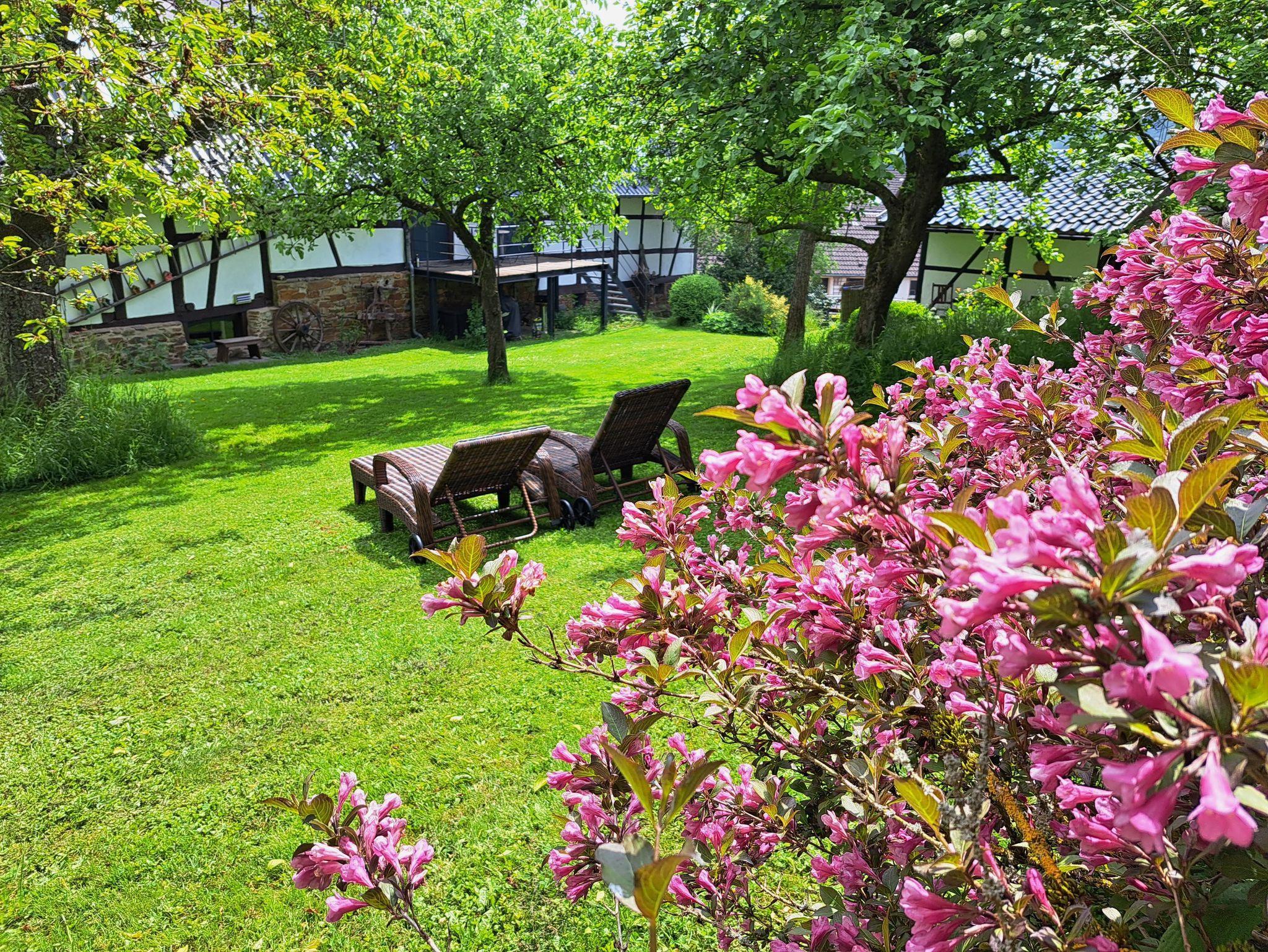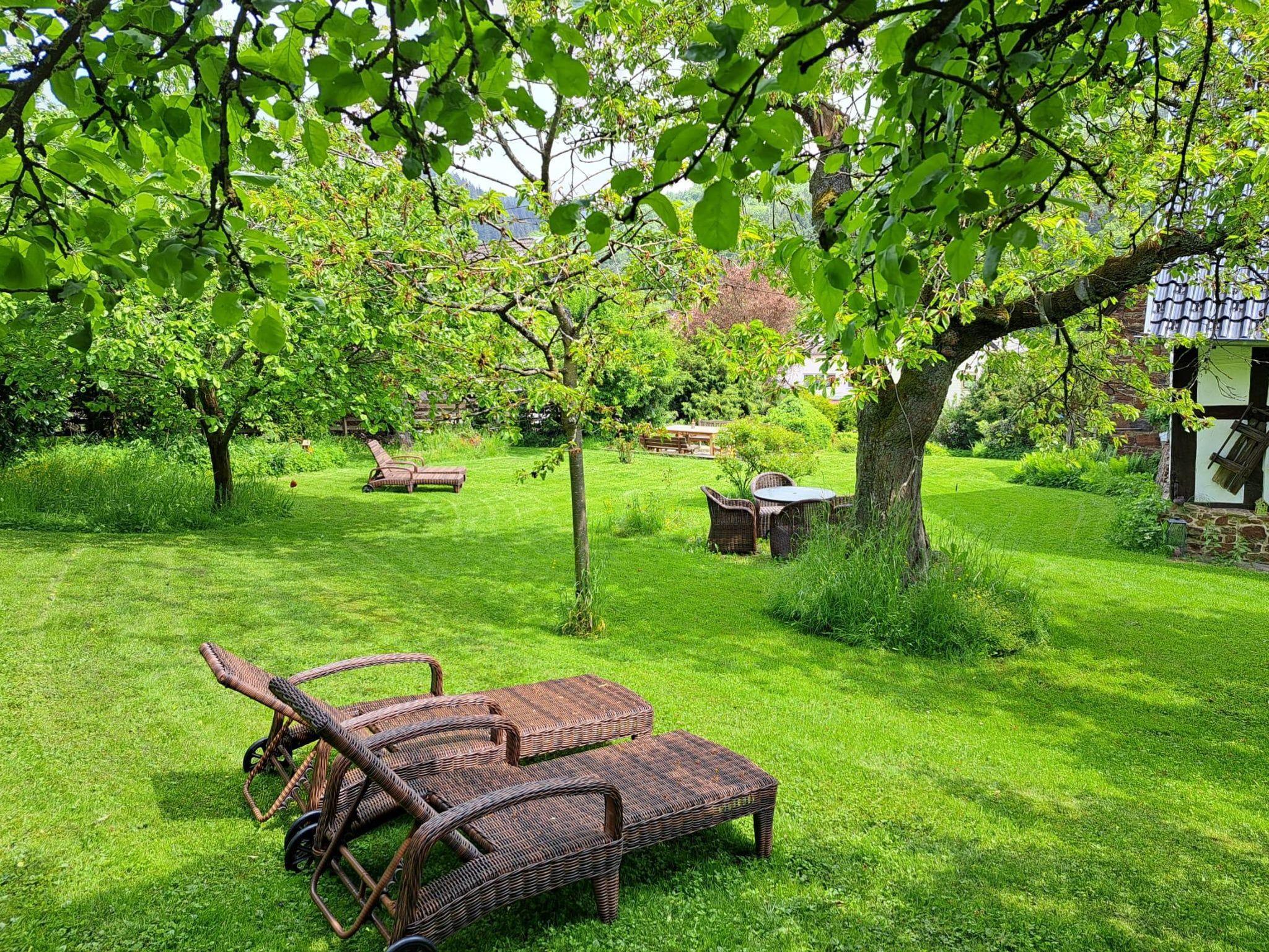 Ein weitläufiger Garten mit Sonnenliegen, Sauna und Obstbäumen lädt zum Entspannen, Lesen und Barbecue ein. Leih-Fahrräder und unser Eifel-Lädchen mit regionalen Produkten runden das Angebot ab.