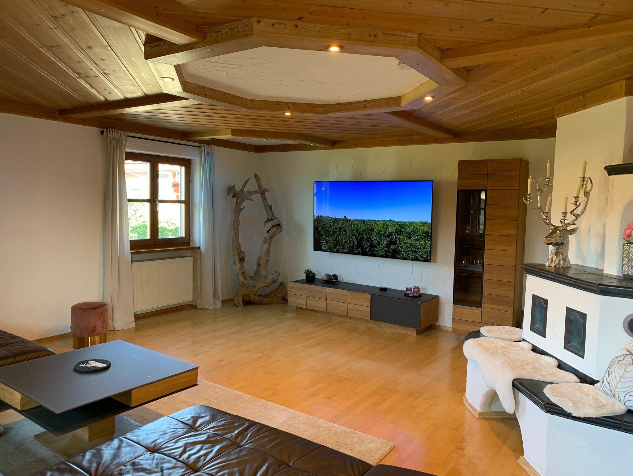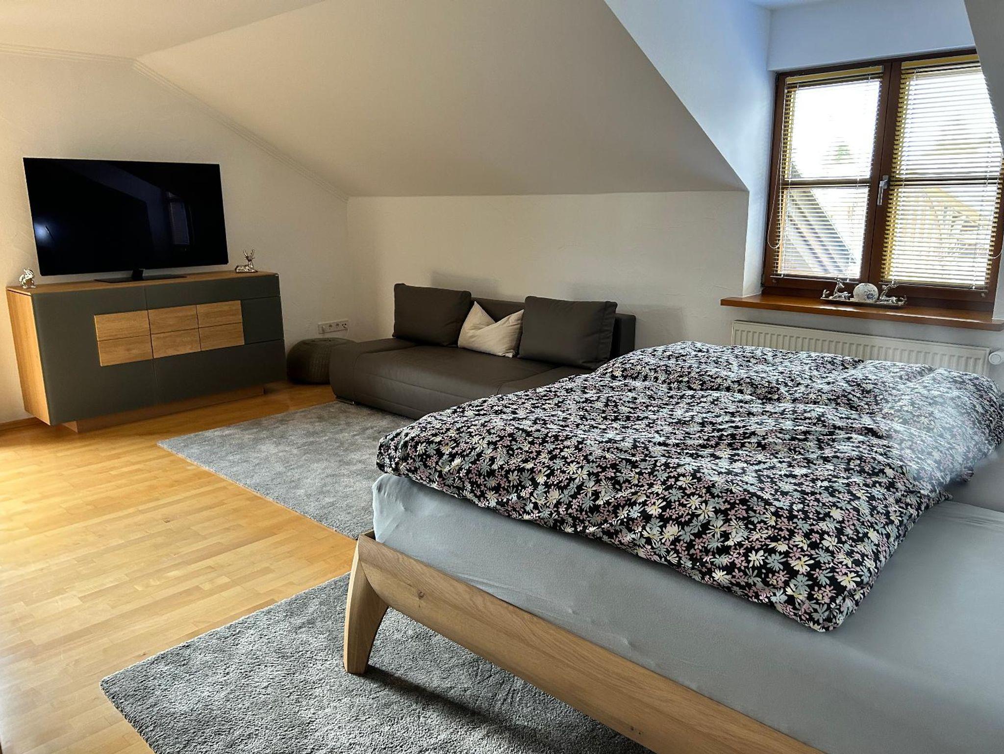 Schlafzimmer 1: Boxspringbett, elektrischen Lattenrost, Tempur-Matratzen, Ambilight-TV und Voglauer-Schränken.