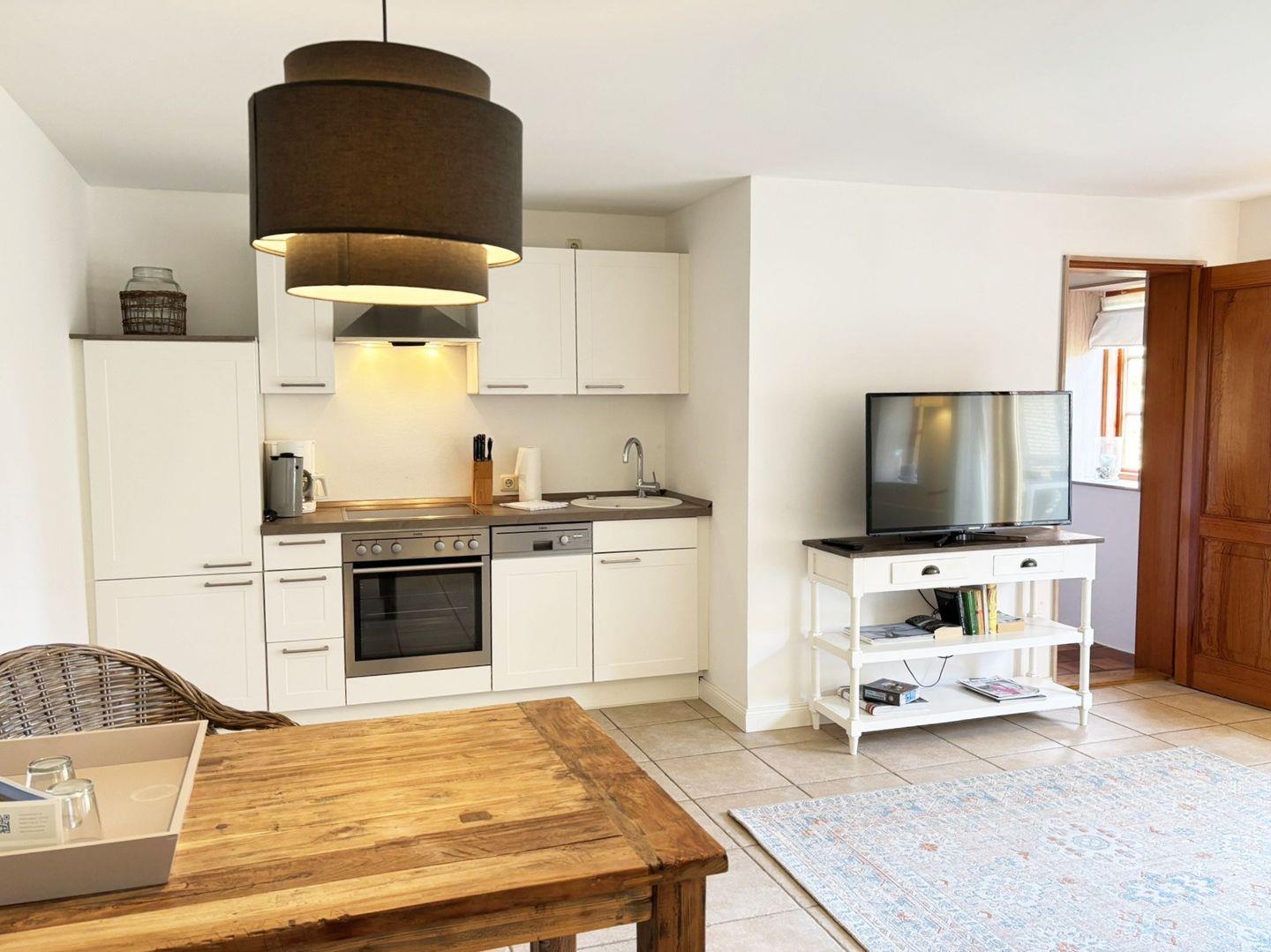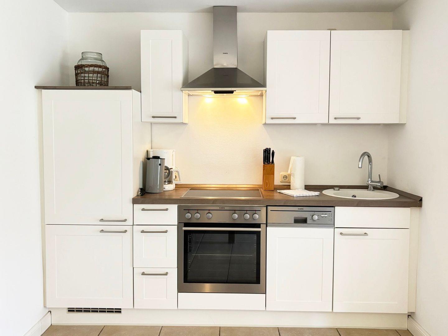 Die offene Küche ist vollständig ausgestattet und lädt zu unkomplizierten kulinarischen Momenten ein: Cerankochfeld, Backofen, Kühlschrank mit Gefrierfach, Geschirrspüler, Filterkaffeemaschine, Wasserkocher und Toaster stehen bereit – alles, was man braucht, ohne Überfluss.