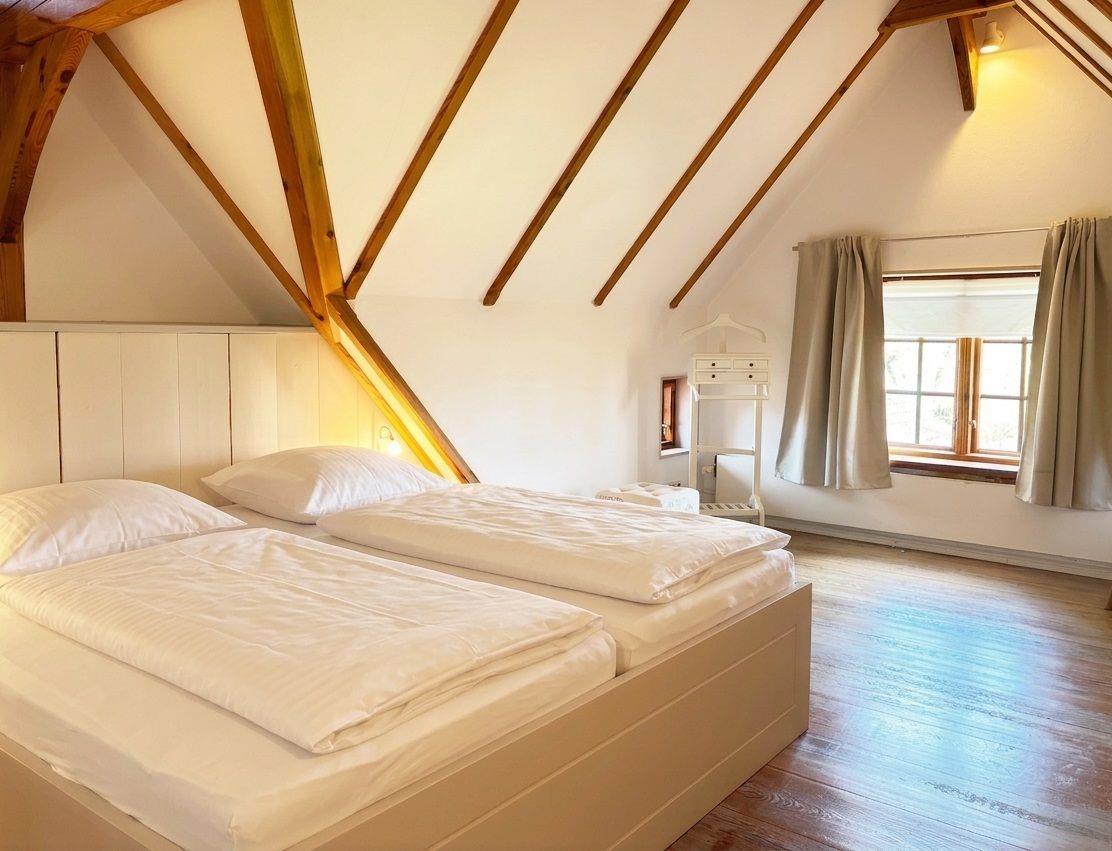 Das Ferienhaus verfügt über zwei gemütliche Schlafzimmer. Im Obergeschoss befindet sich das erste Schlafzimmer mit einem komfortablen Doppelbett (2x90x200 cm) und offenem Fußende, einem Kleiderschrank sowie Verdunklungsmöglichkeiten für erholsame Nächte. Das zweite Schlafzimmer im Erdgeschoss ist mit einem Etagenbett (80x200 cm) ausgestattet und bietet ausreichend Stauraum durch einen Kleiderschrank.