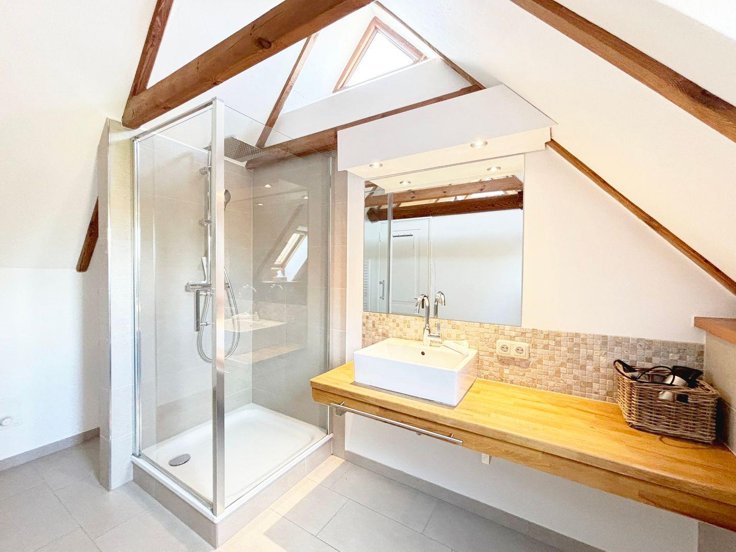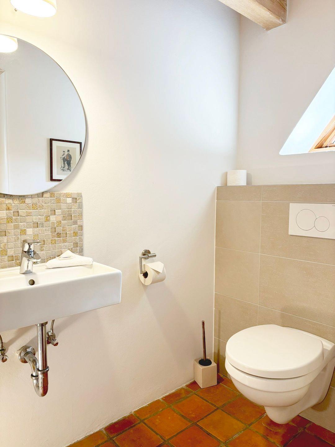 Das Badezimmer ist mit einer Dusche mit flachem Einstieg, einem WC, zwei Waschbecken sowie einem Haartrockner und Spiegel ausgestattet. Ein zusätzliches Gäste-WC sorgt für zusätzlichen Komfort.