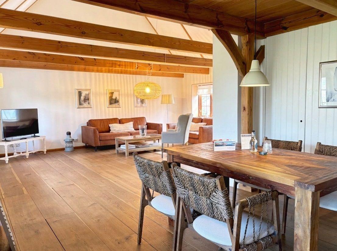 Der kombinierte Wohn- und Essbereich lädt zum Verweilen ein. Hier finden Sie einen Esstisch, bequeme Sessel und ein Sofa – ideal für gesellige Abende oder entspannte Stunden mit der Familie - für wohlige Wärme an kalten Tagen sorgt der Kamin. Die offene Küche ist modern eingerichtet und lässt keine Wünsche offen: Sie verfügt über ein Cerankochfeld, einen Backofen, einen Kühlschrank mit Gefrierfach sowie eine Spülmaschine. Für Kaffeeliebhaber stehen eine Filterkaffeemaschine, eine Padmaschine, ein Wasserkocher und ein Toaster bereit.