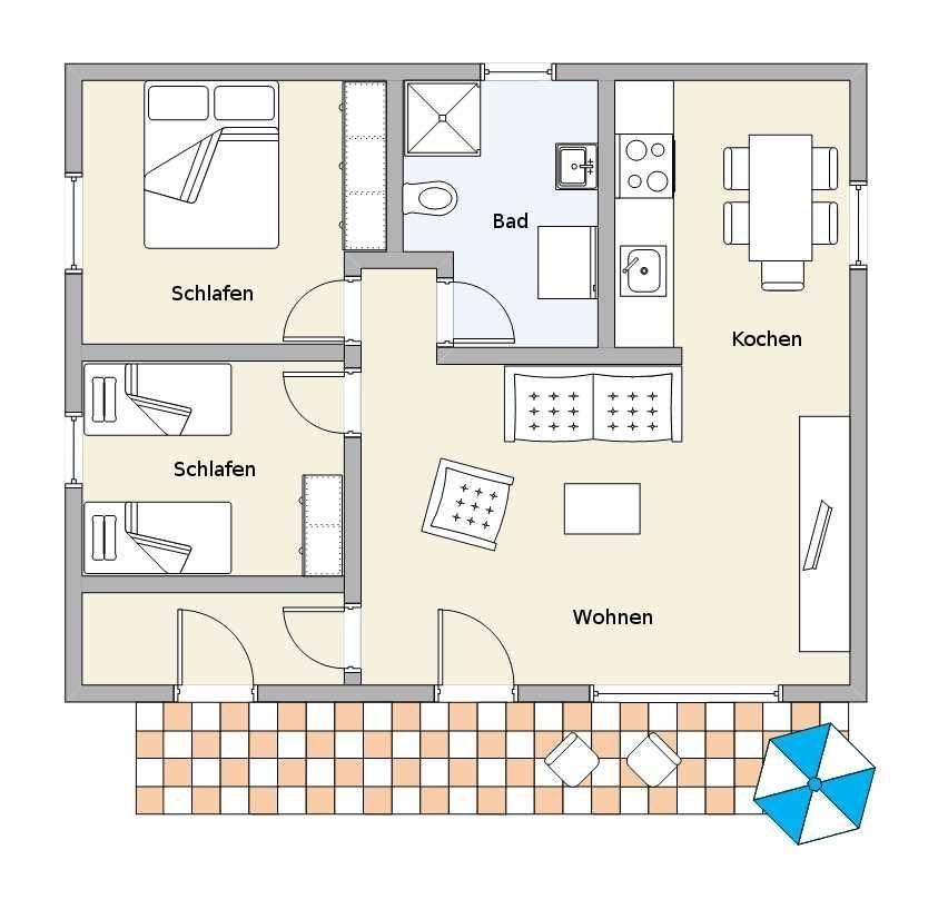 Auf 75 m² erwartet Sie ein harmonischer Rückzugsort für bis zu fünf Personen – liebevoll eingerichtet, komfortabel ausgestattet und umgeben von der friedvollen Natur des Feriendorfs Hohen Bogen. Zwei behagliche Schlafzimmer und ein modernes Bad schaffen Raum zum Ankommen, Abschalten und Wohlfühlen.