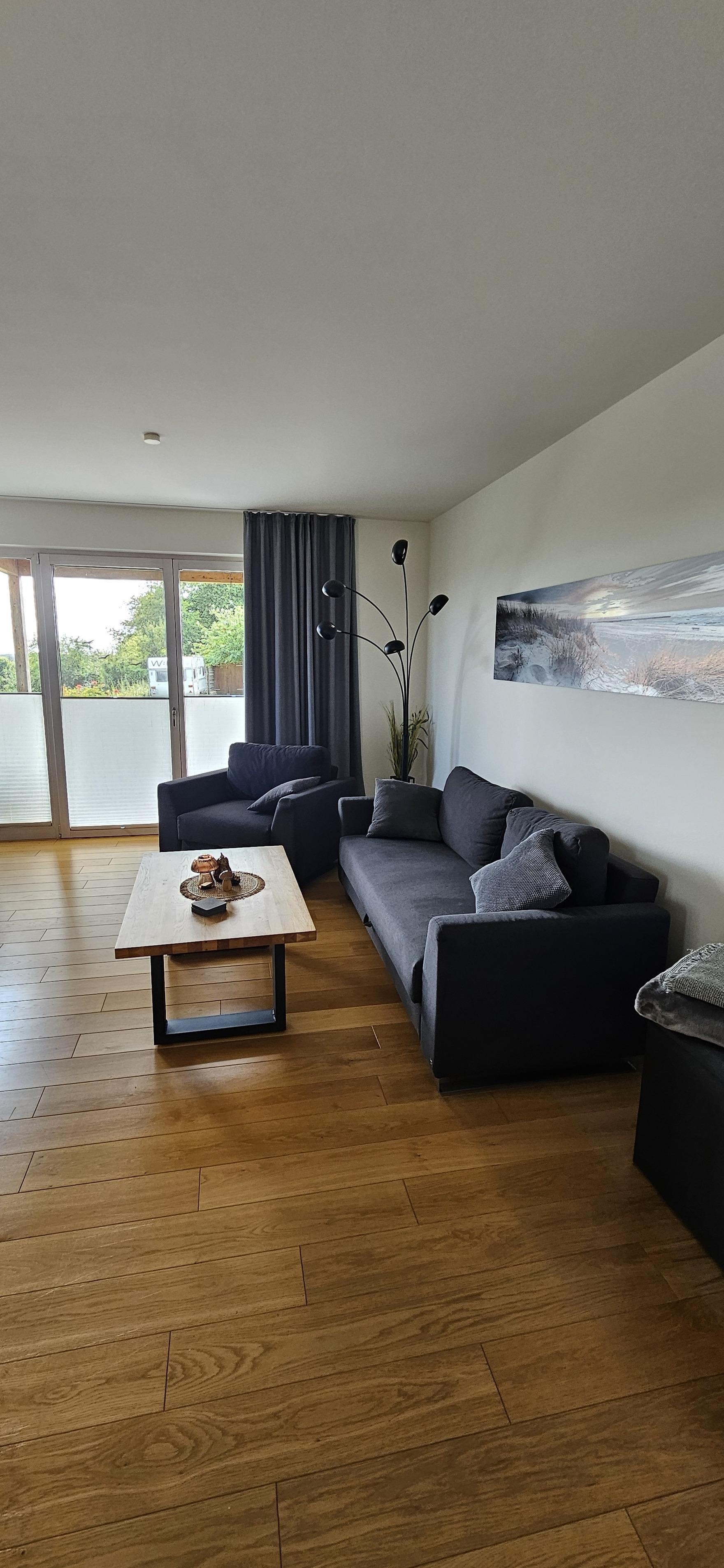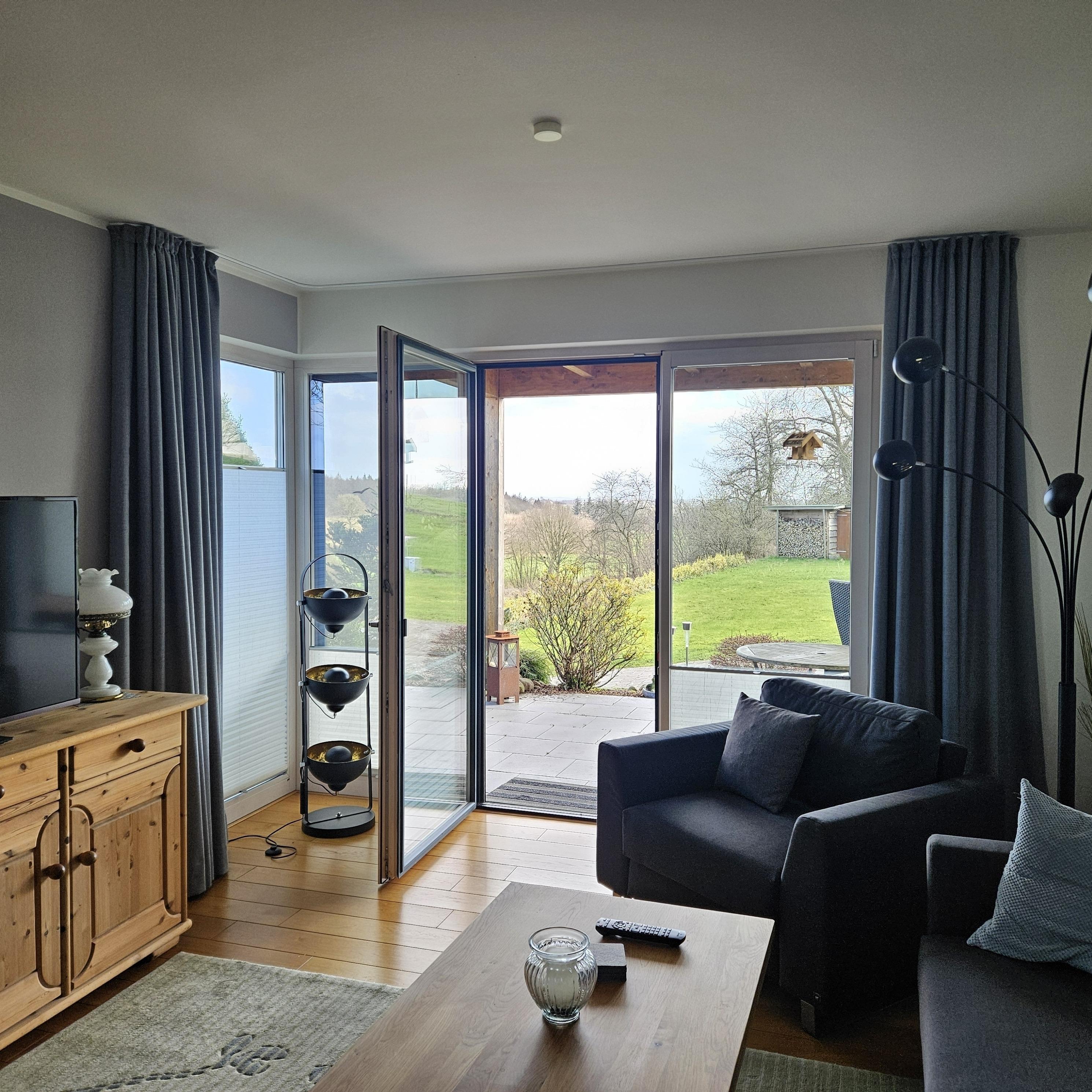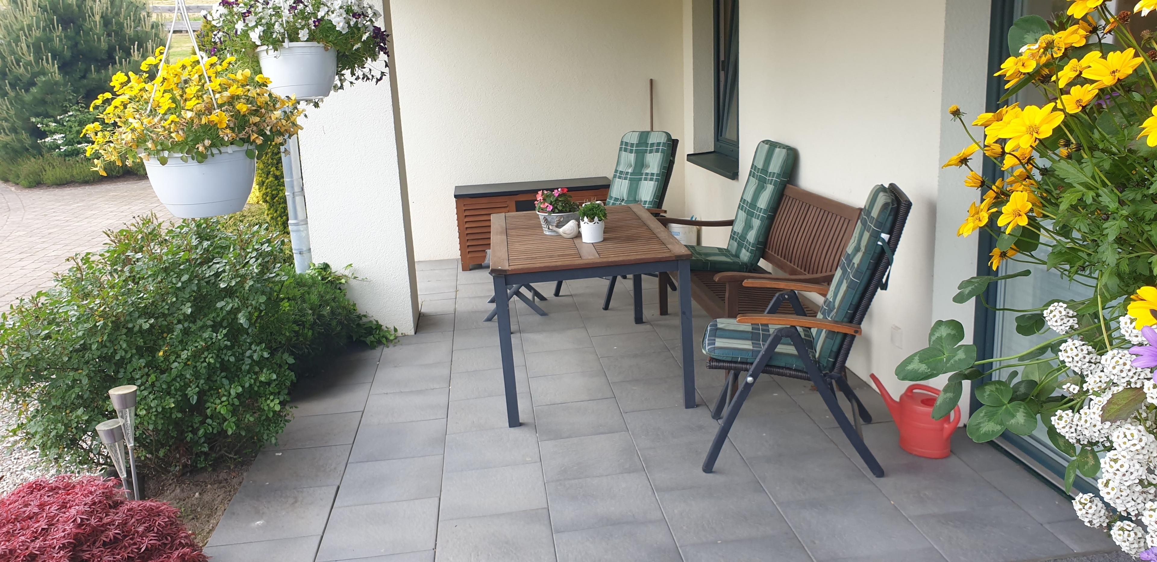 Unsere große Ferienwohnung ist ausgelegt für maximal 5 Personen. Die Wohnung ist 90m² groß und hat selbstverständlich einen separaten Eingang und einen PKW-Stellplatz. Aus dem Eingangsbereich mit Garderobe im Erdgeschoß gelangst Du in die separate Essküche, das große Wohnzimmer, das Schlafzimmer sowie das geräumige Tageslichtbad mit Dusche und WC. Die Ausstattung beinhaltet neben der komplett eingerichteten Küche (Spülmaschine, Backofen, Kochstelle, Kühlschrank mit Eisfach, Mikrowelle, Kaffeemaschine) auch SAT-TV, Audiosystem mit Radio und CD-Player, Internetzugang, 1 sehr bequemes Schlafsofa (Doppelbett 160cm, aufklappbar, 1 Schlafsessel (aufklappbar) im Wohnzimmer, Doppelbett (200cmx200cm) im Schlafzimmer, Fön im Bad. Auf Wunsch zustellbares Kinderbett. Die Wohnung wird komplett über Fußbodenheizung beheizt. Sie haben hier auch eine schöne, überdachte Terrasse mit Blick ins Grüne.