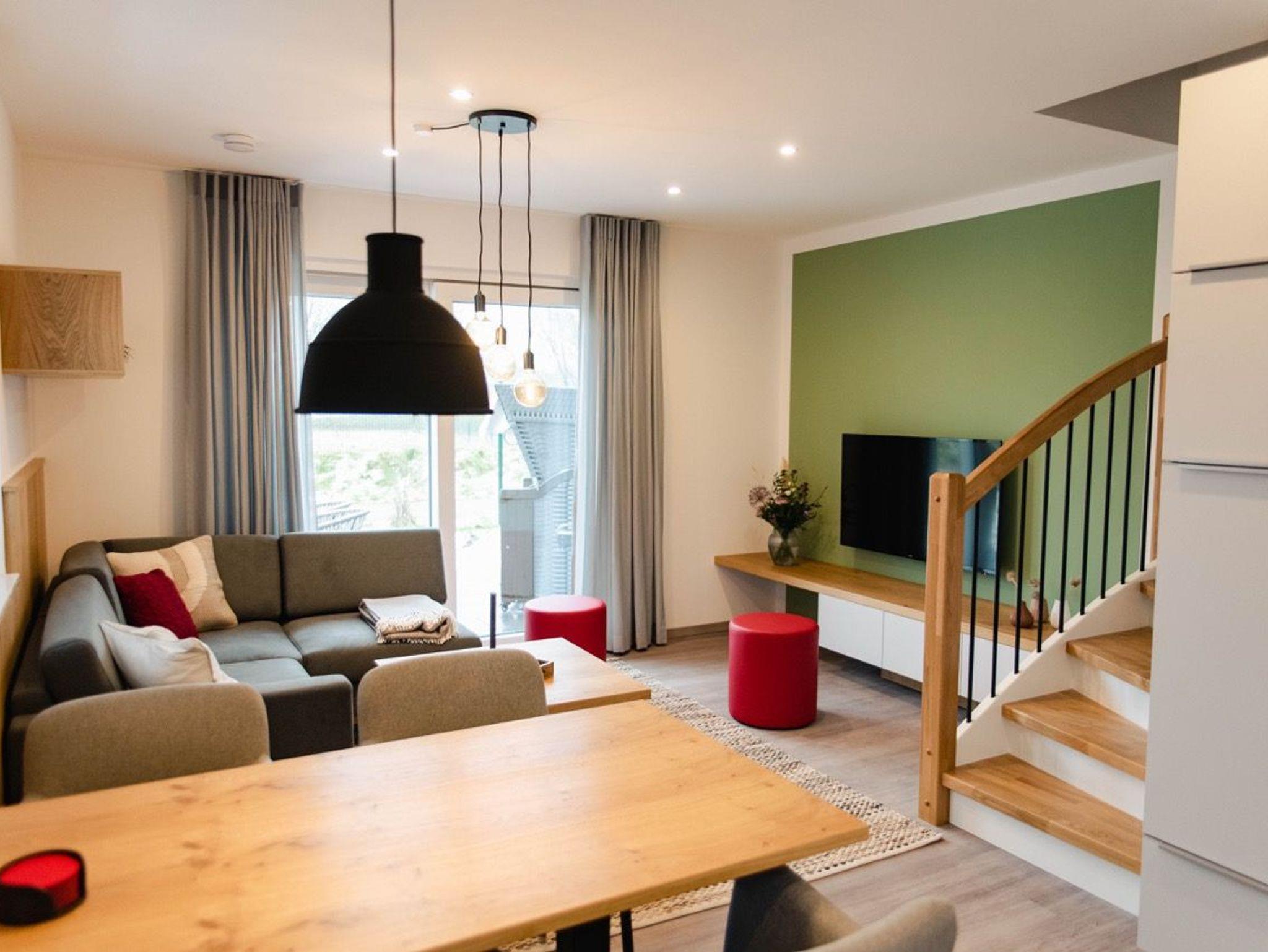 Die modern eingerichteten Doppelhaushälften für bis zu vier Personen erstrecken sich über zwei Ebenen. Ein offener Koch-/Wohn- und Essbereich mit Anschluss an die Terrasse sowie ein Gäste WC und ein praktischer Abstellraum befinden sich im Erdgeschoss. Das Dachgeschoss bietet zwei gemütliche Schlafzimmer und ein Bad mit WC, Dusche und zwei Waschbecken.