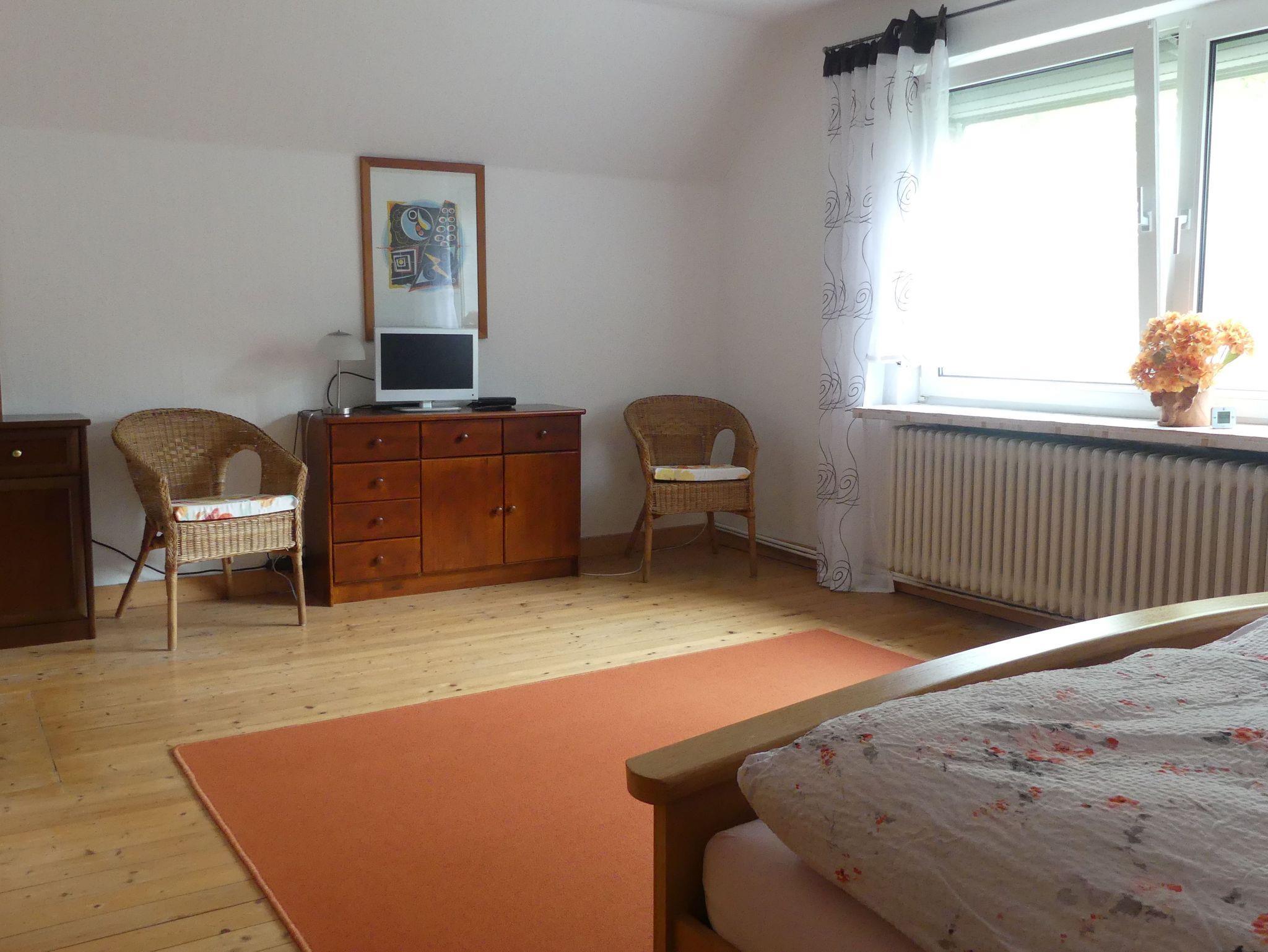 Im Obergeschoss befinden sich die zwei Schlafzimmer. Das Größere ist mit einem Doppelbett, Hochschrank, zwei Korbstühlen und einem kleinen TV-Gerät ausgestattet. Das kleinere Schlafzimmer verfügt über zwei Einzelbetten, einen Kleiderschrank und Sitzgelegenheit.