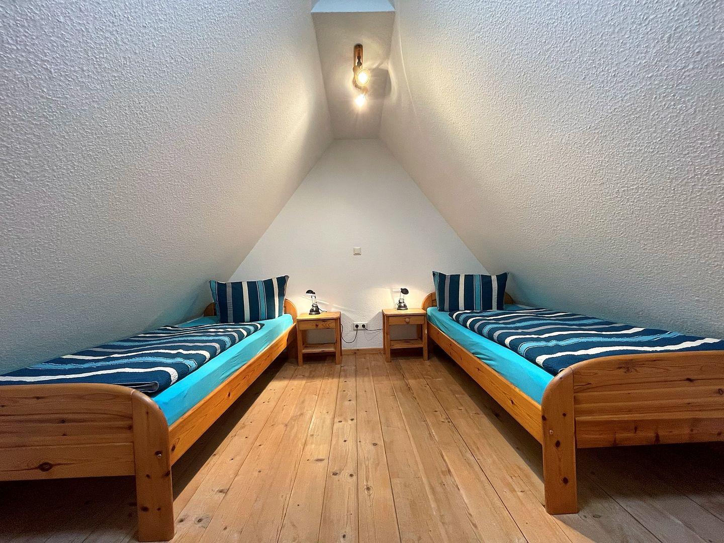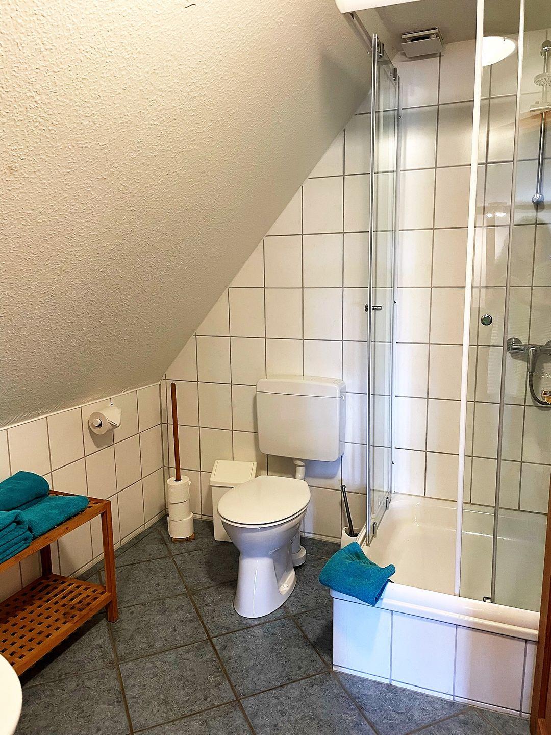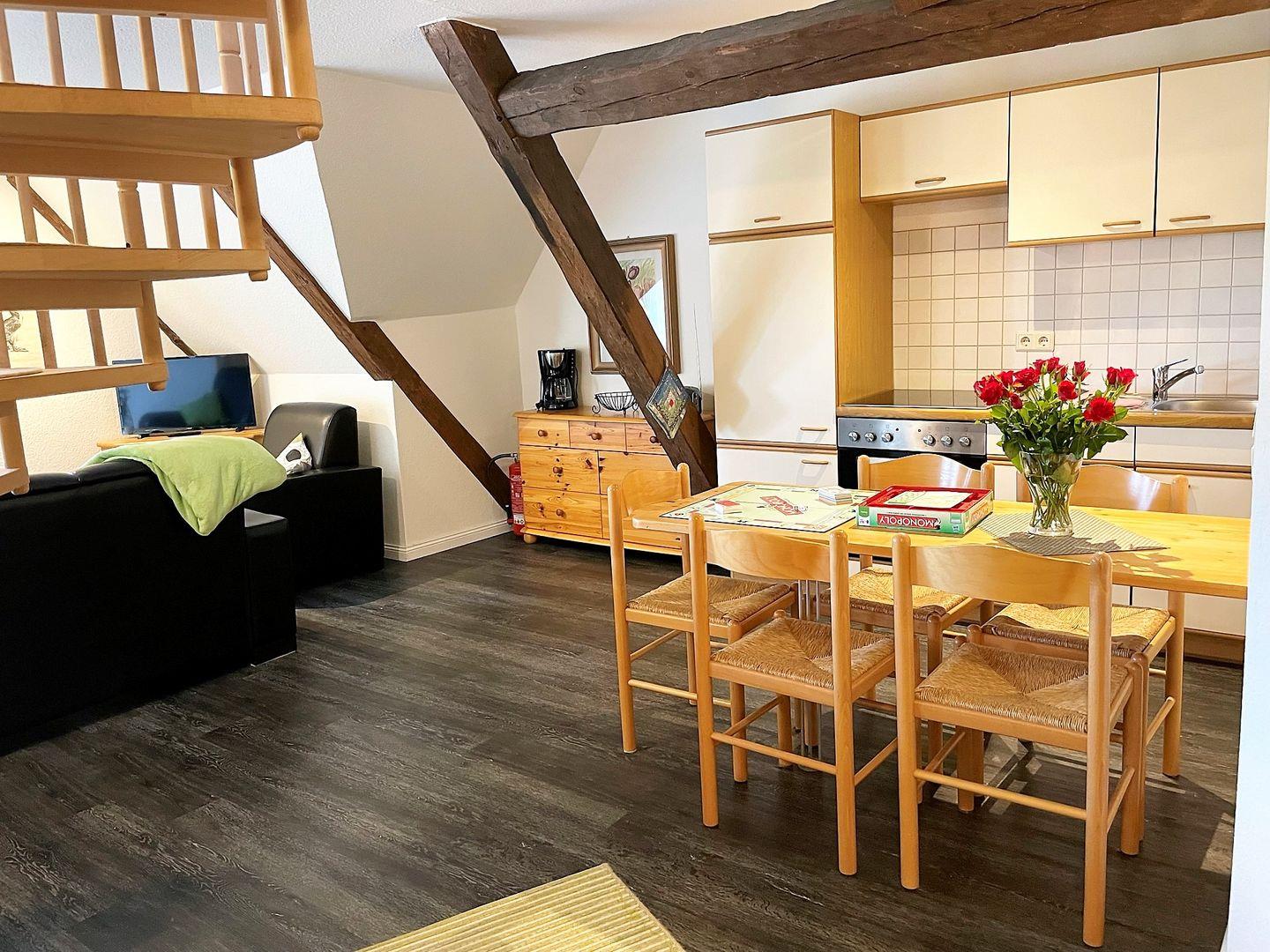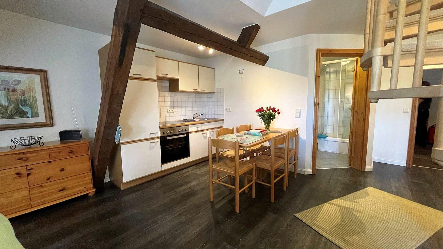 Die Wohnung verfügt über zwei gemütliche Schlafzimmer, das eine davon über eine Wendeltreppe erreichbar liegt gemütlich im Spitzboden und ist ideal für die Kinder. Ein modernes Badezimmer mit Dusche ermöglicht es Ihnen, sich nach einem erlebnisreichen Tag zu entspannen. Der offene Wohnbereich mit einer voll ausgestatteten Küche, die über Herd, Backofen und eine komfortable Sitzecke verfügt, ist der perfekte Ort, um gemeinsam zu essen, zu plaudern und die Zeit zu genießen. WLAN ist selbstverständlich vorhanden und sorgt dafür, dass Sie auch während Ihres Aufenthalts in Verbindung bleiben können. Ein kleines Highlight bietet die Kleine Koje im Wohnbereich, in ihr können Sie es sich zum Beispiel mit einem Buch gemütlich machen.