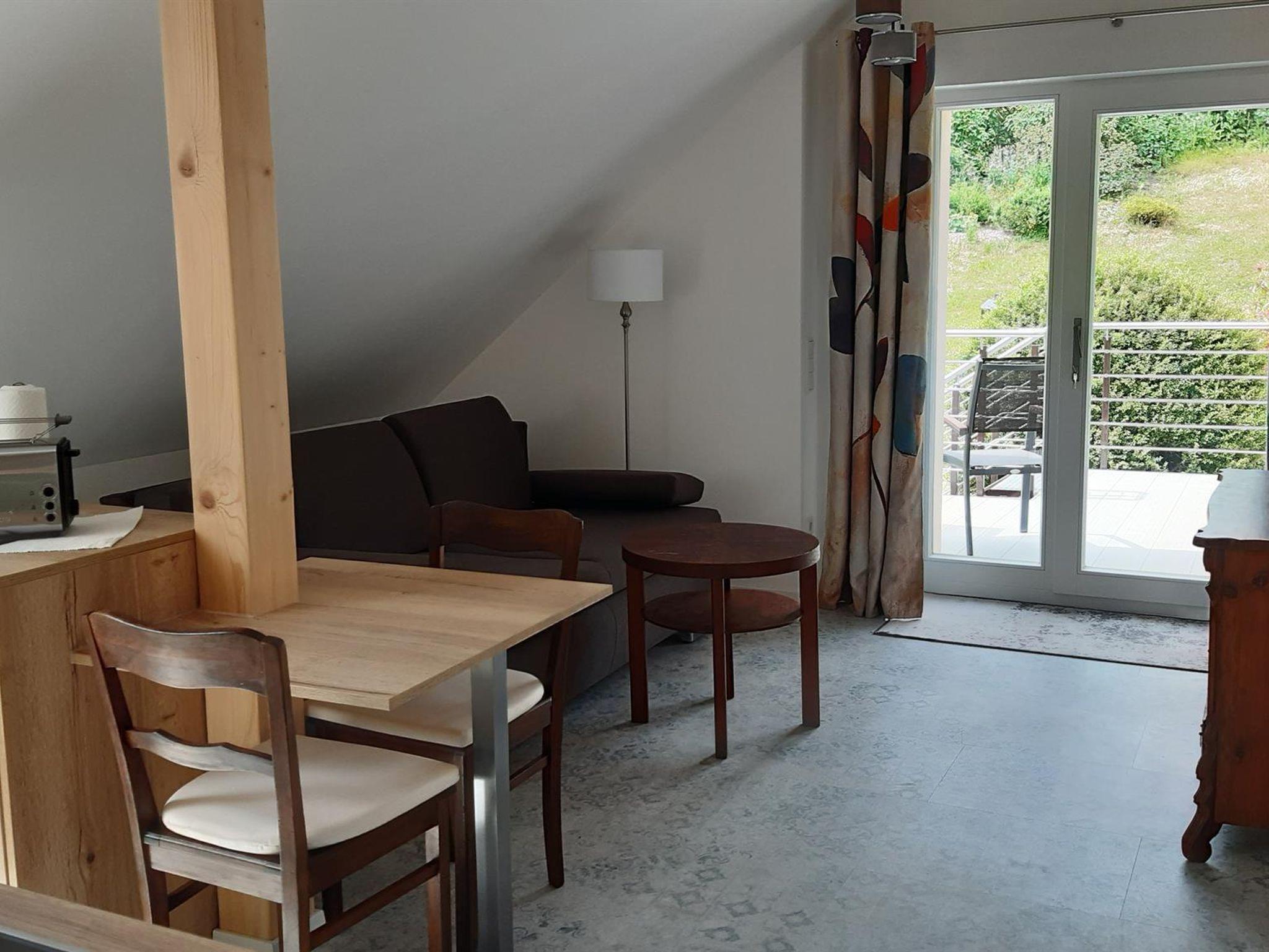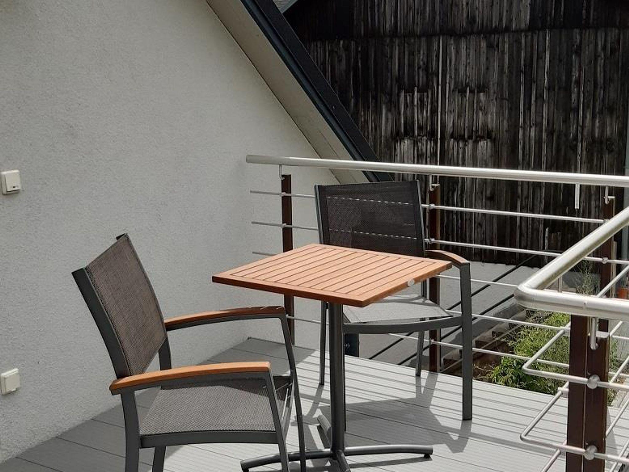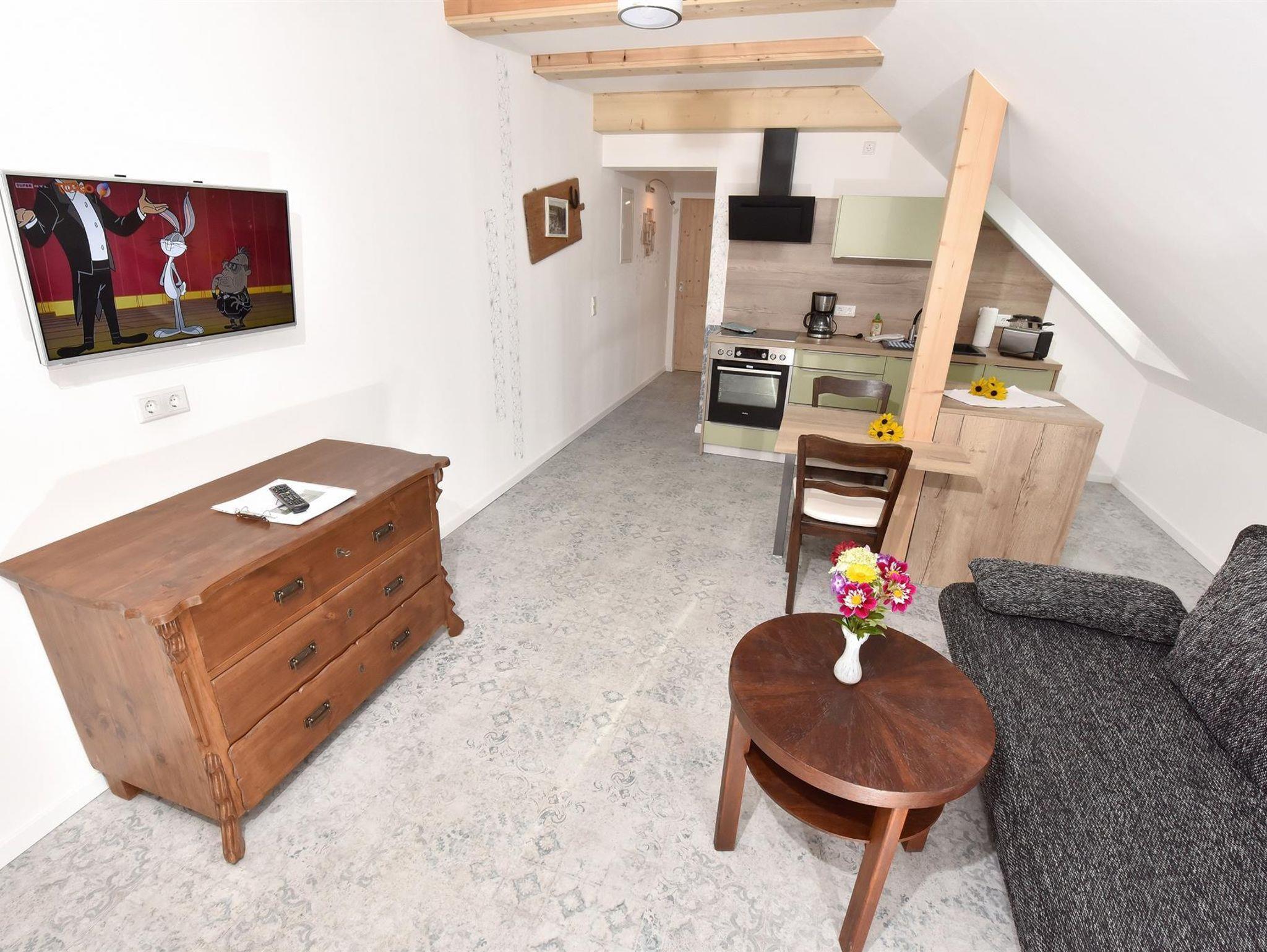 Die 43m² große Ferienwohnug Schafstall liegt im Dachgeschoss auf der Hofseite des Hauses. Von dem Balkon aus, haben unsere Gäste einen sehr schönen Blick ins Grüne. Die gemütlich eingerichtete Wohnung verfügt über ein Schlafzimmer mit Doppelbett, ein kombinierten Wohn-Ess-Bereich mit Einbauküche (Ceran-Herd, Backofen, Kühlschrank mit Gefrierfach) Sat-TV und WIFI sowie ein Bad mit Dusche.