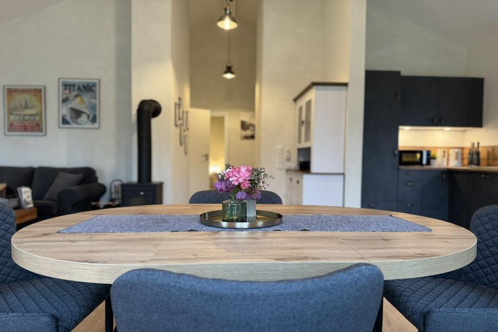 Du kommer inn i huset gjennom en liten gang med et skjult vaskerom og vaskemaskin. Den romslige stuen har gulv-til-tak-vinduer som slipper inn rikelig med lys og en koselig peis for hyggelige timer. Den komfortable sofaen med utsikt over hagen og TV, en lenestol med fotskammel og den store spiseplassen gir plass til avslapning. Det fullt utstyrte kjøkkenet er harmonisk integrert i stuen. Herfra har du tilgang til terrassene og den inngjerdede hagen med hagemøbler. Feriehuset har to soverom: ett med dobbeltseng og TV, og et annet med to enkeltsenger. Det moderne badet har dusjkabinett og et dagslysvindu. Sengetøy og håndklær er ikke inkludert i prisen - men kan bestilles på forespørsel mot et ekstra gebyr. Kjære hundeelskere: Hunder er hjertelig velkomne! Vi tar imidlertid ekstra betalt for opphold og rengjøring. Hagen er fullstendig inngjerdet.