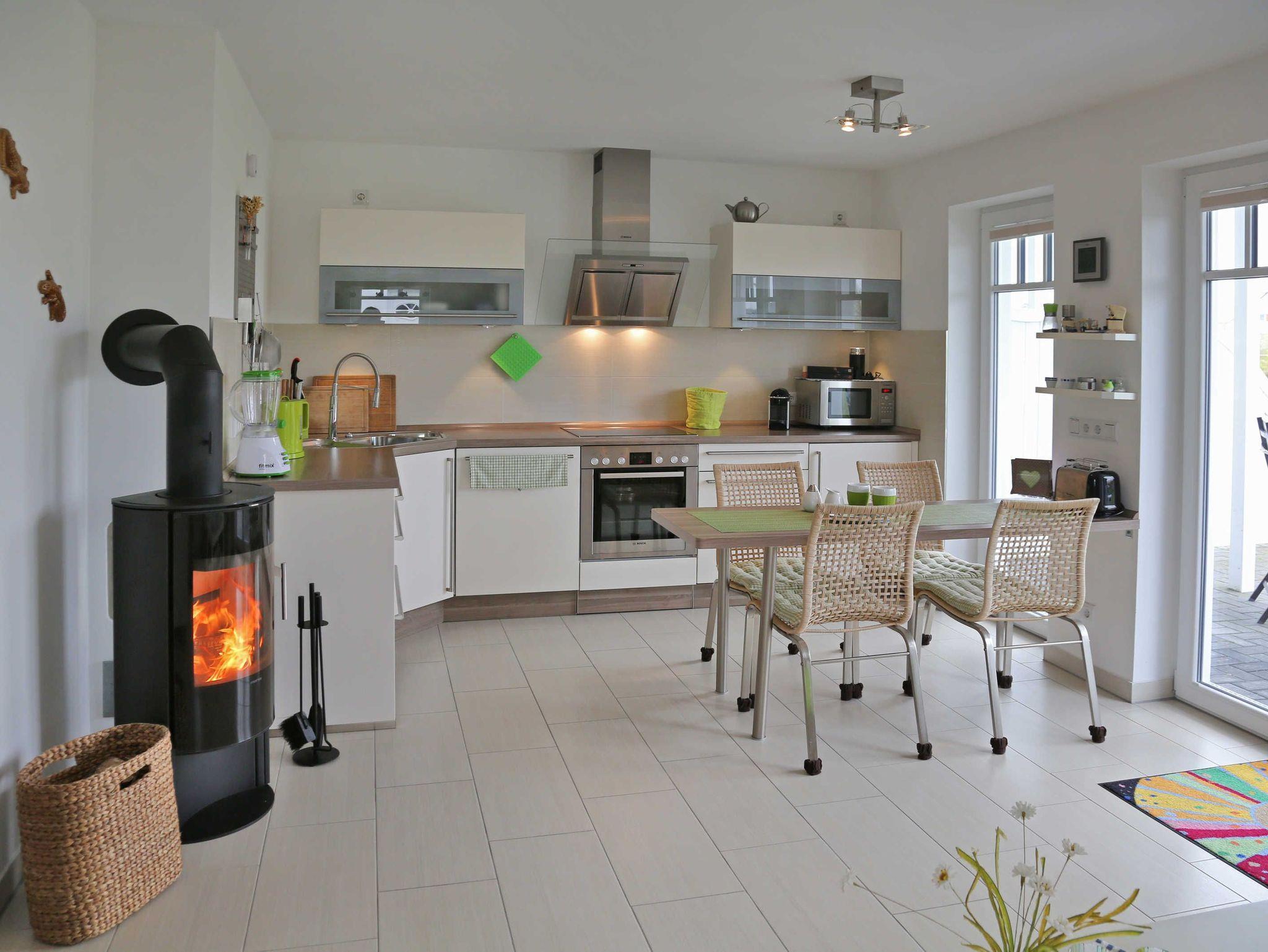 Freundlich und hell präsentiert sich der offene Wohn- und Essbereich mit Ecksofa, TV inkl. Radio, DVD-Player und als Highlight einem Kaminofen mit Glasfenster für romantische Abende. Von hier aus geht es zur Terrasse, die zur Westseite ausgerichtet ist. Genießen Sie den Sonnenuntergang mit Blick auf den Kurpark, z.B. bei einer Flasche Wein. Im Frühjahr und Herbst können Sie von hier aus die Zugvögel beobachten. Moderne Gartenstühle und ein Gartentisch komplettieren unsere Ausstattung. Die Küche ist mit hochwertigen Küchengeräten, Induktionsherd, Backofen, Spülmaschine, Mikrowelle, Wasserkocher, Toaster, einer „normalen“ Kaffeemaschine, Kühlschrank