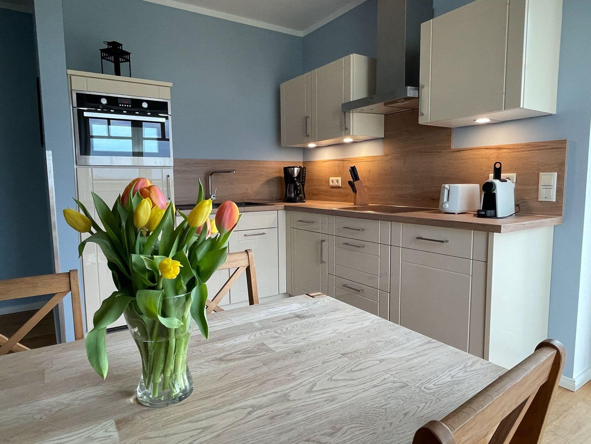 Die Zwei-Zimmer-Wohnung wurde 2020 umfassend und mit viel Liebe zum Detail überarbeitet und präsentiert einen weitläufigen Blick in Richtung Ostsee.
