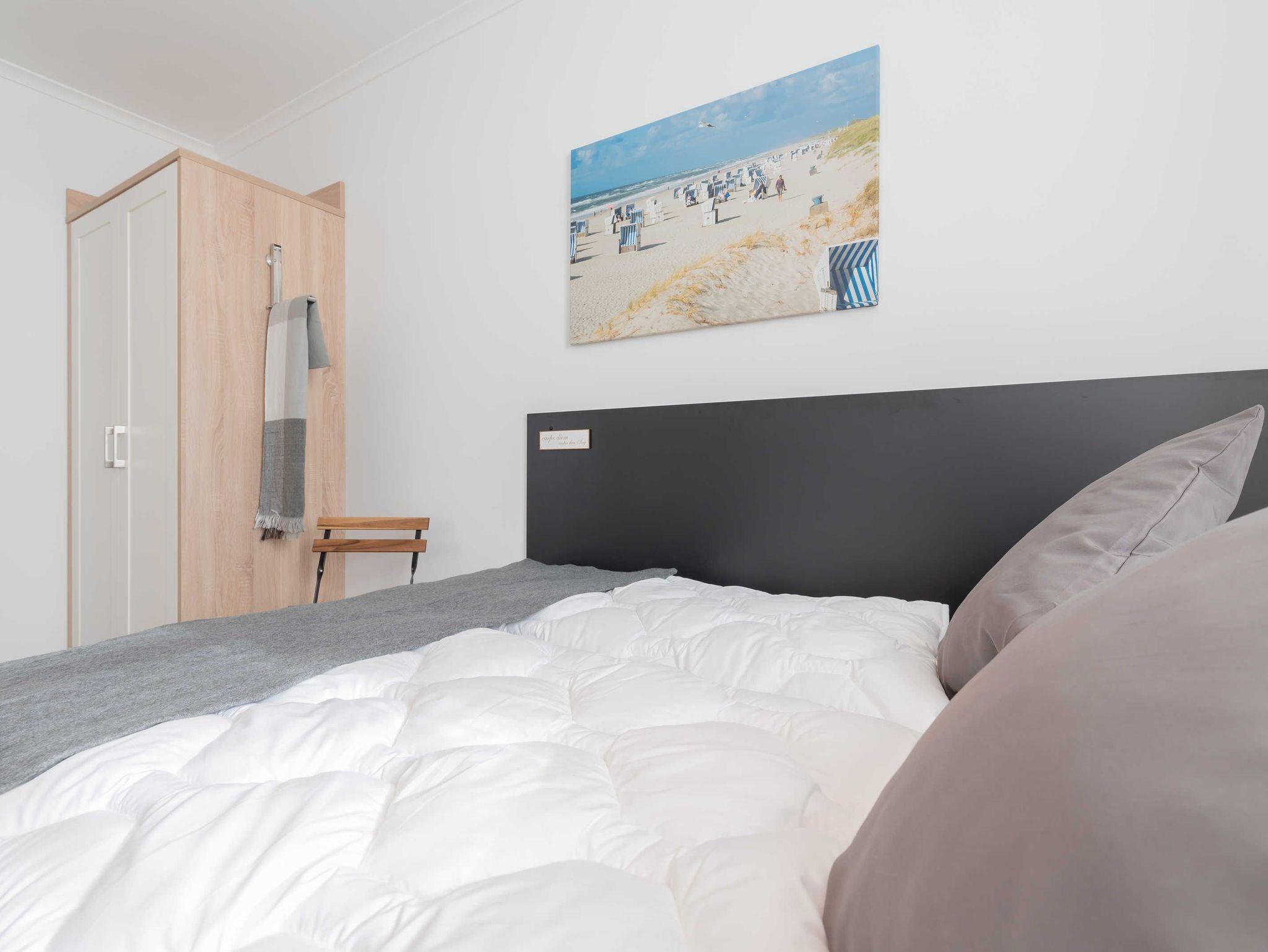 Der offene Wohn- und Essbereich ist modern und in einem zeitlos maritimen Stil eingerichtet. Dort befinden sich eine gemütliche Couch inkl. Sessel und Hocker, ein Couchtisch und ein großer Esstisch mit vier Stühlen, der ausreichend Platz für ein ausgedehntes Frühstück oder ein gemütliches Mittag- oder Abendessen bietet. In der voll ausgestatteten offenen Küchenzeile werden selbst Kochbegeisterte nichts vermissen. Beide Schlafräume empfangen Sie mit gemütlichen Boxspringbetten, in denen Sie einen erholsamen Schlaf finden werden. Große Schränke bieten Ihnen genügend Stauraum für das Reisegepäck.[nbsp] Die Wohnung verfügt insgesamt über zwei Fernseher (Wohnzimmer und großes Schlafzimmer) und eine Internet Musikanlage im Wohnzimmer zur Verfügung. Das Badezimmer mit Fenster besticht mit einer ebenerdigen Dusche, einem großen Waschtisch mit Unterschrank, einem Schminkspiegel, einem Haartrockner und einem großen Wandspiegel. Auf dem Südwest Balkon mit Tisch, Stühlen und Sonnenschirm können Sie gemütliche Stunden verbringen und den Sonnenuntergang genießen.