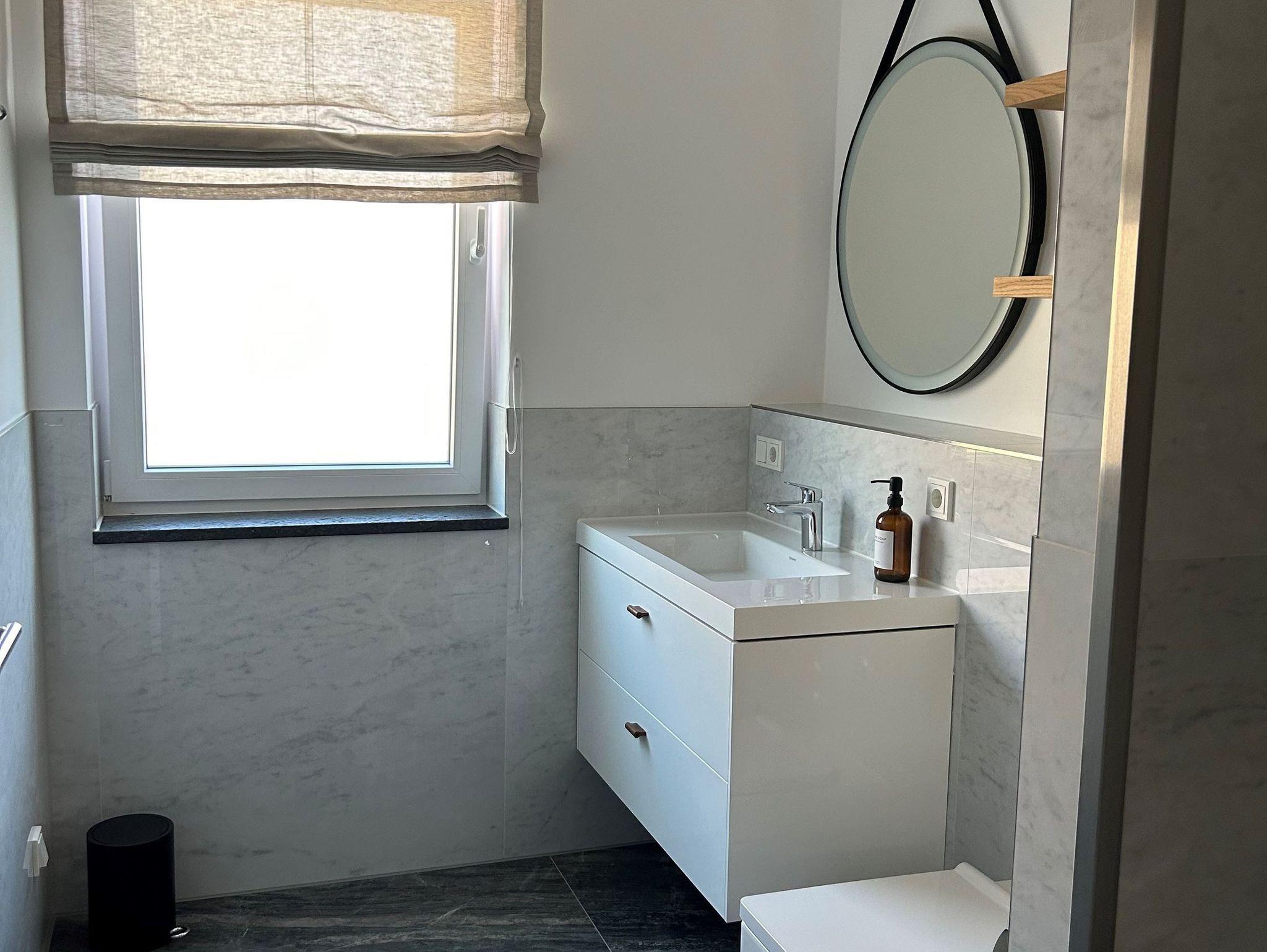 Das helle Badezimmer mit Fenster ist ausgestattet mit einer bodengleichen Dusche, einem Waschtisch inklusive großem Spiegel und einem Haartrockner.