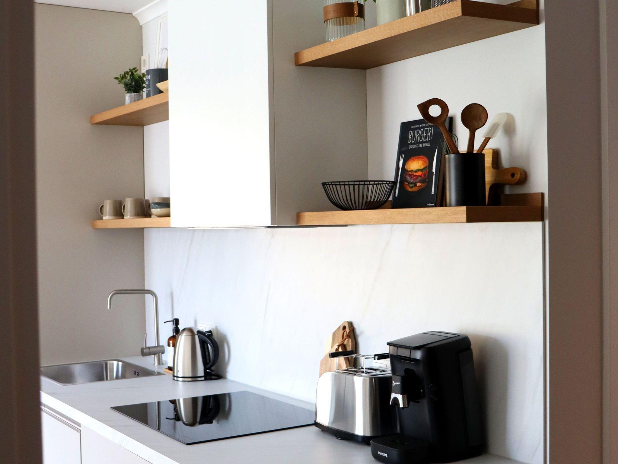 Über den Eingangsbereich gelangen Sie in den offenen Wohn- und Essbereich. Die moderne Einbauküche ist mit allen wichtigen Dingen ausgestattet: Geschirrspüler, Backofen, Mikrowelle, Kühlschrank, Toaster, Wasserkocher und Kaffeemaschine (Senseo). Eine Geschirr-, Koch- und Zubehörausstattung ist natürlich ebenfalls vorhanden. Der Essbereich umfasst 4 bequeme Sitzplätze und lädt neben dem Essen zum längeren Verweilen ein. Das lichtdurchflutete Wohnzimmer mit bodentiefen Fenstern bietet ausreichend Platz und verfügt über eine bequeme Couch, auf welcher es sich wunderbar entspannen lässt. Ein ruhiger Platz zum Lesen sowie ein TV runden die Entschleunigung im Urlaub ab.