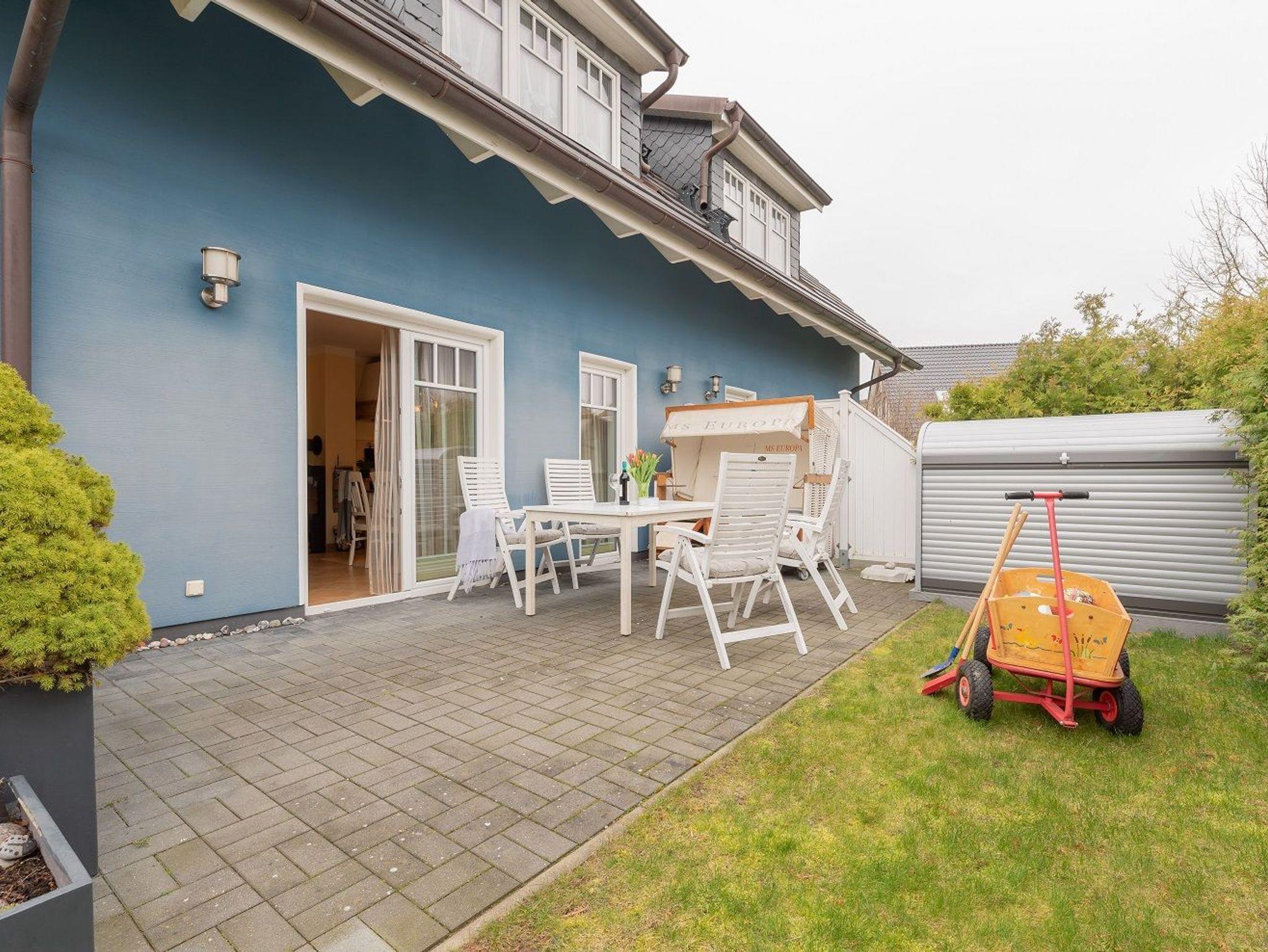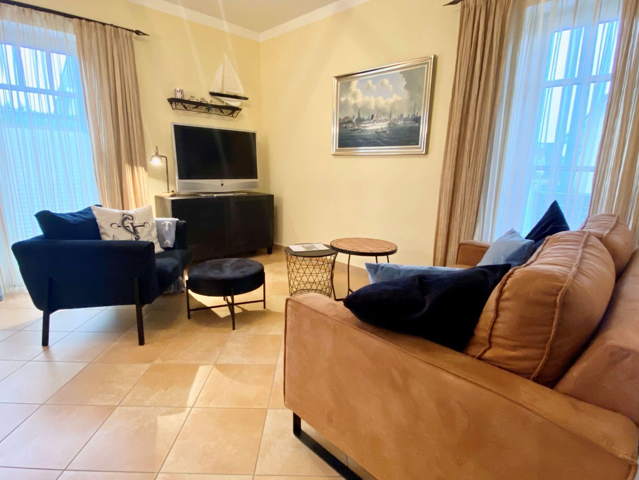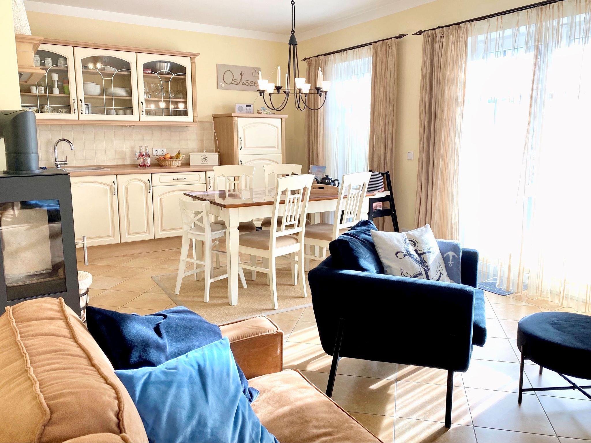 Genießen Sie die komfortable Ausstattung im geschmackvollen Wohnzimmer mit offener Wohnküche. Die hochwertige Küche ist umfangreich ausgestattet. Das geräumiges Schlafzimmer verfügt über ein großes Doppelbett und ein Kinderbett. Ein weiterer kleinerer Schlafraum bietet zwei zusätzliche Schlafmöglichkeiten (Ausziehbett). Die Schlafzimmer sind mit Verdunkelungsrollos und Fliegengitter ausgestattet. Das moderne Duschbad verfügt über eine bodengleiche Dusche, eine Toilette und einer Waschmaschine. Entspannen Sie auch auf unserer vollmöblierten Terrasse mit XXL Strandkorb. Dieser ist schon um die ganze Welt gesegelt. Vielleicht können Sie das Rauschen der Weltmeere noch hören - ganz sicher aber hören Sie das Rauschen der Ostsee. Für einen kuscheligen Herbst-oder Winteraufenthalt bietet unsere Wohnung angenehme Nestwärme, da sie über Fußbodenheizung in allen Räumen und einen Kamin verfügt (Kaminholz muss selbst organisiert werden). Für unsere kleinen Gäste bieten wir eine Rundum-Ausstattung: Kinderbett, Hochstuhl, Bollerwagen, Sandspielzeug, Strandmuschel, Kindergeschirr und -besteck, Wickelauflage, Nachtlichter und Toilettensitz stehen frei zur Verfügung.