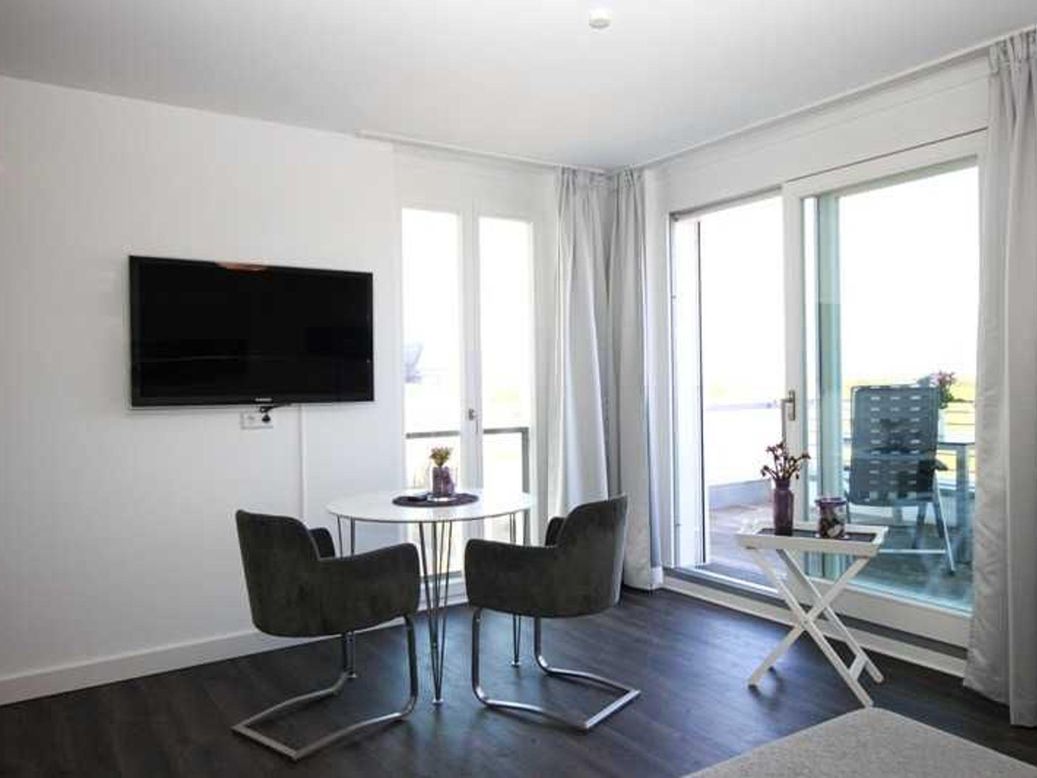 Diese hochwertige Ferienwohnung besteht aus einem Wohn- und Essbereich, einem Schlafraum sowie Balkon. Im Wohnbereich finden Sie eine bequeme Zweisitzer-Couch und einen Flatscreen-TV. Das Schlafzimmer bietet Ihnen ein großes Boxspringbett mit einer durchgehenden und angenehm weichen Matratze. Für weitere Bequemlichkeit sorgt hier ein begehbarer Kleiderschrank. Die offene Küche- mit rundem Esstisch und zwei bequemen Stühlen, lädt natürlich zum Essen oder zu einem Spieleabend ein. Die Küchenzeile überzeugt mit Geschirrspüler, Mikrowelle, Backofen, Cerankochfeld und Kühlschrank, inklusive Gefrierfach. Das großzügige Duschbad verfügt über eine bodengleiche Dusche, einen Handtuchwärmer, einen kompakten Waschtisch und einen Föhn. Im Strandkorb auf dem eigenen Balkon in Nordausrichtung können Sie wunderbar relaxen. Für Ihr Fahrzeug steht ein kostenfreier Tiefgaragenplatz mit Aufzug bis zur Wohnungsetage bereit. Bitte beachten Sie die Durchfahrtshöhe von max. 1,90 m. Bei Überschreitung der maximalen Durchfahrtshöhe, besteht die Möglichkeit auf einen kostenpflichtigen Parkplatz in unmittelbarer Nähe auszuweichen. Ihre Fahrräder können im abschließbarer Fahrradraum der Tiefgarage im Gebäude sicher aufbewahrt werden. Noch einige Hinweise: Die Wohnung selbst ist eine Nichtraucherwohnung. Haustiere sind hier generell nicht erlaubt. Das kostenfreie WLAN in der Unterkunft ist ausschließlich für die Verwendung von Social Media und den Austausch von Bildern mit Familie und Freunden gedacht. Die Nutzung zum Streamen von Filmen ist nicht vorgesehen. Wäscheset, Kinderreisebett und Kinderhochstuhl können kostenpflichtig zugebucht werden. Eine Waschmaschine und ein Trockner stehen im Waschraum im Erdgeschoss des Objekts gegen Gebühr zur Verfügung (50 Cent- Münzen). Sichern Sie sich zusätzlich den Anspruch auf einen der begehrten Strandkörbe nur ein paar Meter entfernt von den rauschenden Wellen der Ostsee (Anfang Mai - Ende August) und buchen Sie jetzt zu besonderen Konditionen (12,00 € pro Tag oder 75,00 € pro Woche.)