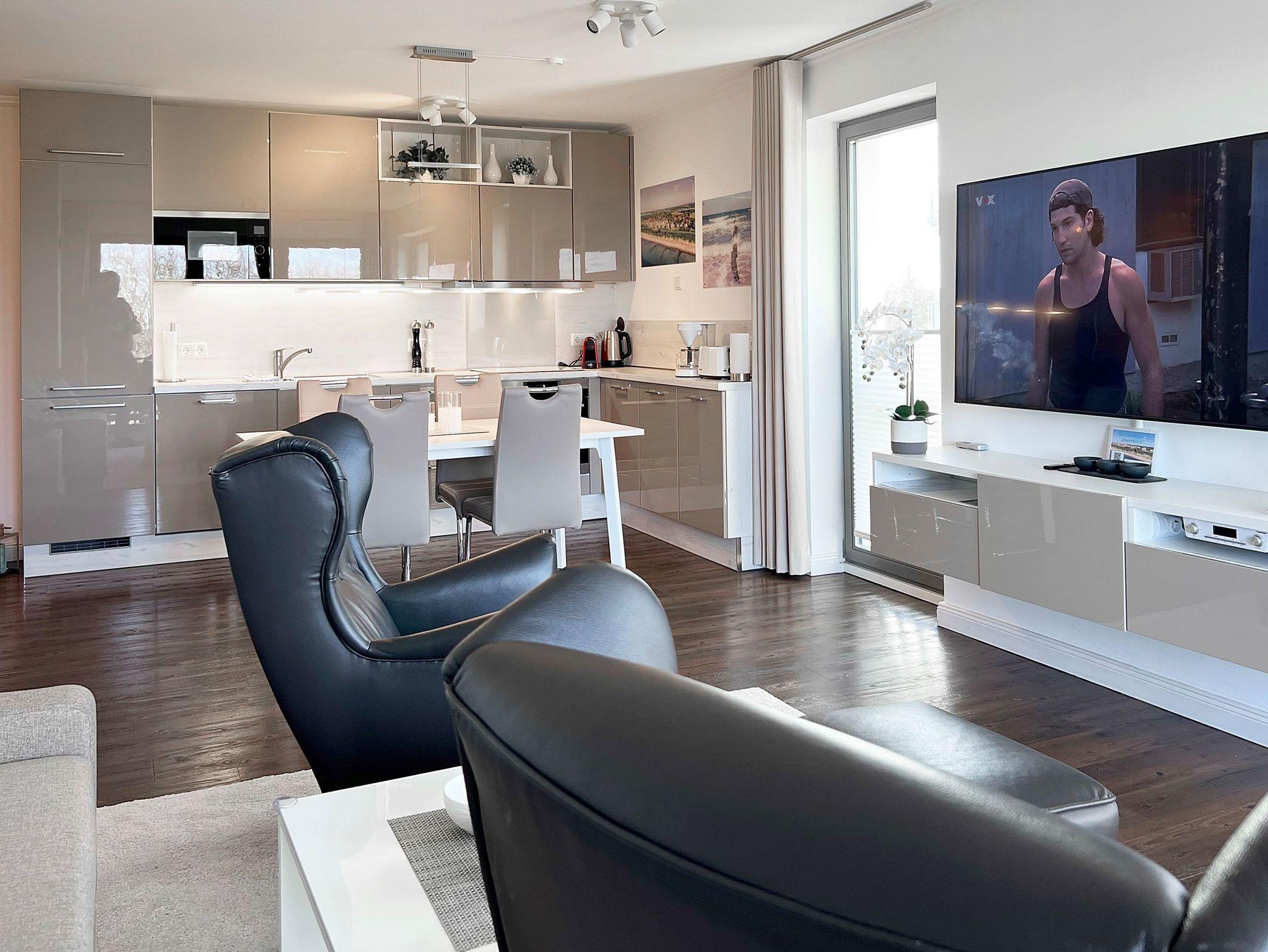 Die Ferienwohnung wurde im November 2022 neugestaltet. Im Wohnbereich empfangen Sie eine bequeme Sitzecke mit ausziehbarer Schlafcouch (1,40 x 2,00 m), ein TV-Board und als besonderes Highlight ein großer 65-Zoll-Fernseher mit Blu-ray-Player. Ein ganzer Schwung an DVDs und ein Radio-CD-Player mit der Möglichkeit über Bluetooth Musik vom Handy zu spielen. Das sorgt für gute Laune. Ein stilvoller gläserner Gas- Kamin und dessen Flammenspiel wirken entschleunigend und zaubern stimmungsvolle Stunden. Die großzügige Fensterfront über Eck flutet den Raum mit Licht. Zudem erhascht man bereits von der Sitzecke aus, einen Blick auf die Ostsee. In der offenen Einbauküche mit Backofen und 4-Platten-Ceranfeld, Geschirrspüler, Kühlschrank mit Gefrierfach, Mikrowelle, Kaffeemaschine, „Nespressomaschine“, Wasserkocher und Toaster lassen sich leckere Mahlzeiten zubereiten und am angrenzenden Esstisch mit vier ledernen Hochlehnern verzehren. Über den Wohnbereich gelangen Sie auf den großen Eckbalkon in Nord-West-Ausrichtung mit traumhaftem Meerblick. Hier können Sie die Nachmittags- und Abendsonne und unvergessliche Sonnenuntergänge genießen. Der Balkon mit Tisch, Stühlen und einem stilechten Strandkorb ist auch bei schlechterem Wetter durch den darüberliegenden Vorbau gut geschützt. Ein modernes Boxspringbett mit durchgehender Matratze von 1,80 x 2,00 m. erwartet Sie im Schlafzimmer. Ein zusätzlicher Topper, ein Kleiderschrank mit Ganzkörperspiegel und eine Wandkommode sowie ein moderner 65 Zoll TV darüber vervollständigen den Raum. Bitte beachten Sie, dass im Schlafzimmer kein Platz für ein zusätzliches Kinderreisebett vorhanden ist. An allen Fenstern sind blickdichte Vorhängen und Plissees vorhanden. Das Badezimmer besticht mit bodentiefer Dusche, großem Spiegel, LED-Kosmetikwandspiegel, elektrischem Handtuchtrockner, Personenwaage, Föhn und mehreren Ablagemöglichkeiten. Ein kleiner Garderobenbereich am Eingang der Wohnung bietet dem Anlass entsprechend Platz für Jackett und Windjacke. Zusätzliche Dinge wie Ihre Koffer können Sie bequem im separaten Abstellraum unterbringen. In allen Räumen wurde eine Fußbodenheizung für angenehme und gleichmäßige Wärme eingebaut. Die Unterkunft liegt nur wenige Meter zum Strand entfernt und wird lediglich durch die gepflegte Promenade von den Dünen getrennt. Kein Autoverkehr! Zur Wohnung gehören zudem ein kostenfreier Tiefgaragenstellplatz und eine Abstellmöglichkeit für Fahrräder. Bitte beachten Sie die Durchfahrtshöhe von max. 1,90 m der Tiefgarage. Mit einem Personenaufzug gelangen Sie von der Tiefgarage aus direkt zu Ihrer Wohnung. Im Erdgeschoss der Wohnung befindet sich ein gekennzeichneter Abstellbereich für Kinderwagen. Noch einige Hinweise: Es handelt sich um eine Nichtraucherwohnung. Haustiere sind nicht gestattet. Das WLAN steht kostenlos in allen Zimmern zur Verfügung. Das Datenvolumen ist unbegrenzt, so dass Sie ohne Limit nach Herzenslust streamen können. Das Netz schwankt aber leider noch, wenn sich viele Nutzer in Börgerende im Internet befinden. Für Netflix z.B. reicht es aber zumeist völlig aus. Wäschesets, Kinderreisebett und Kinderhochstuhl können kostenpflichtig zugebucht werden. Waschmaschine und Trockner stehen im separaten Hauswirtschaftsraum im Untergeschoss der Villa zu Ihrer Verfügung (gegen Gebühr / 1,00 € Münzen). Ab der dritten Person wird ein Aufschlag in Höhe von 15,00 €/ÜN berechnet. Sichern Sie sich einen der begehrten Strandkörbe nur ein paar Meter entfernt von den rauschenden Wellen der Ostsee (Anfang Mai - Ende August) und buchen Sie jetzt zu besonderen Konditionen (12,00 € pro Tag oder 75,00 € pro Woche.)