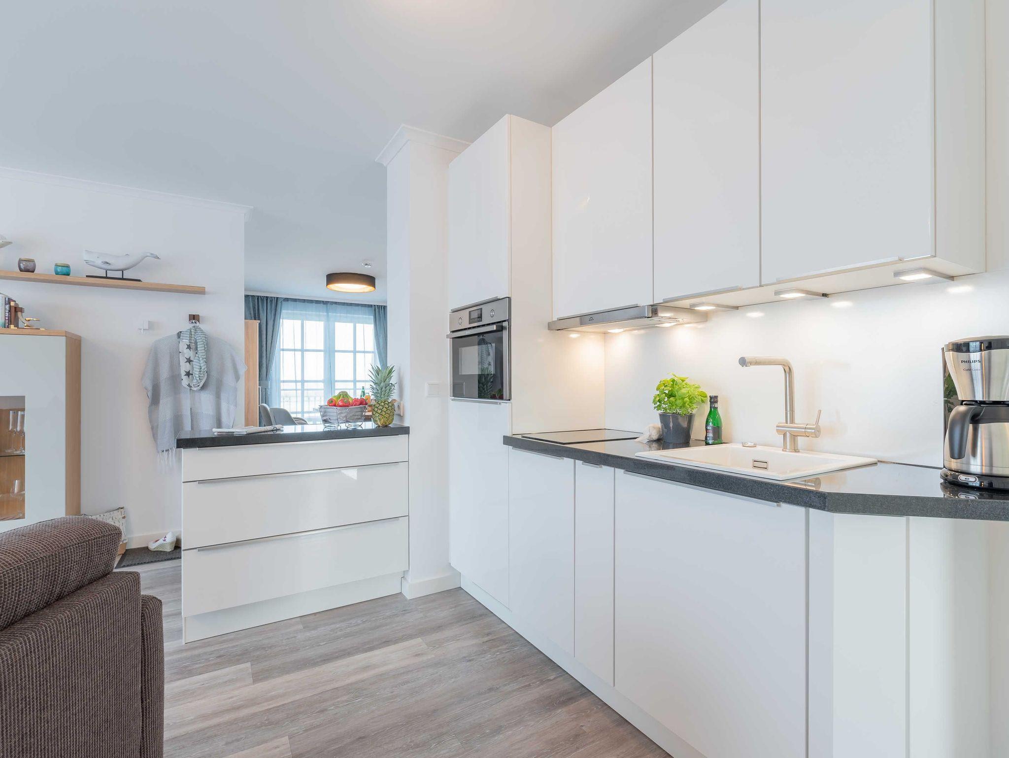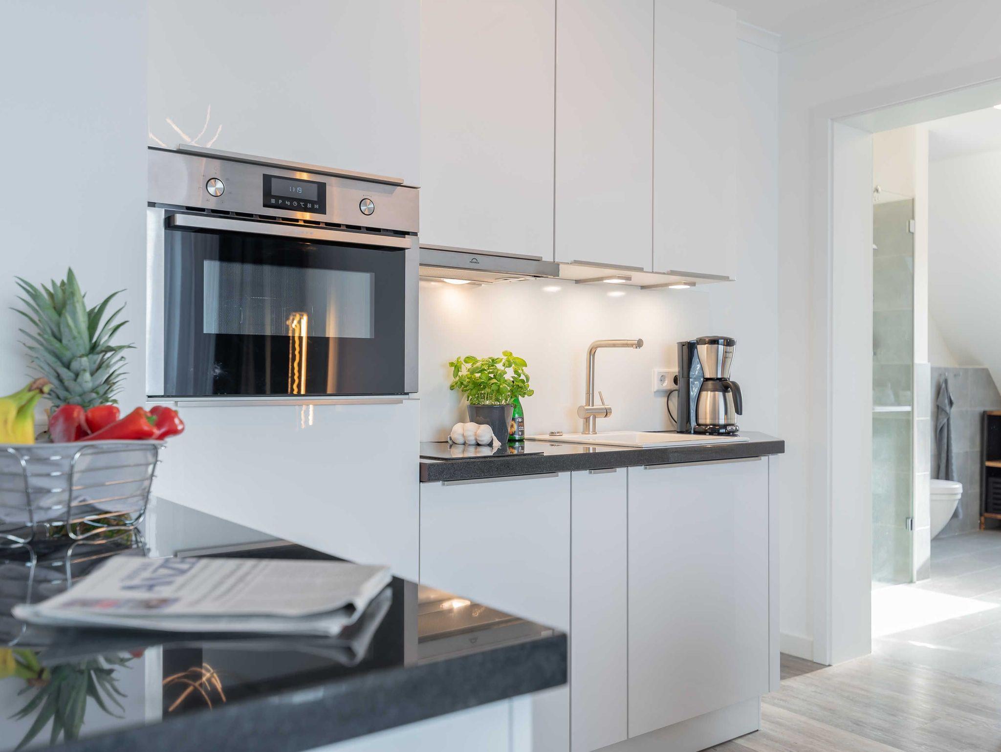 In der voll ausgestatteten Küchenzeile finden Sie alles, was Sie für einen angenehmen Aufenthalt benötigen: Backofen mit integrierter Mikrowelle, 2-Platten-Induktionskochfeld, Kühlschrank mit Tiefkühlfach, Geschirrspüler, Filterkaffeemaschine, Nespressomaschine, Toaster, Wasserkocher usw.