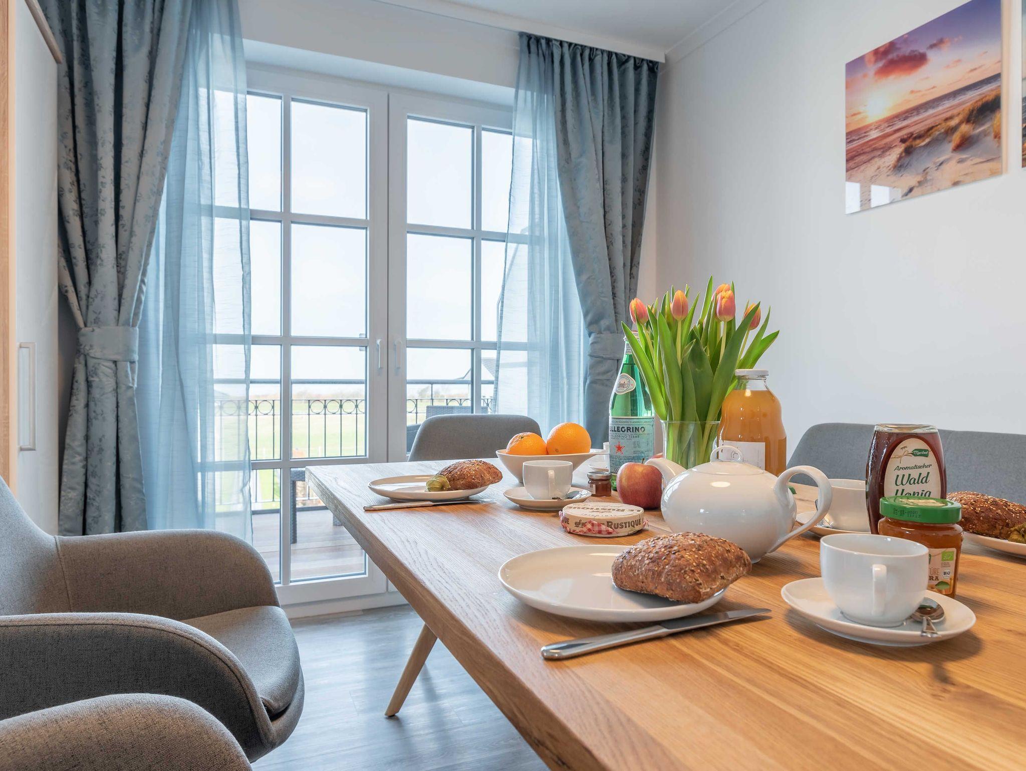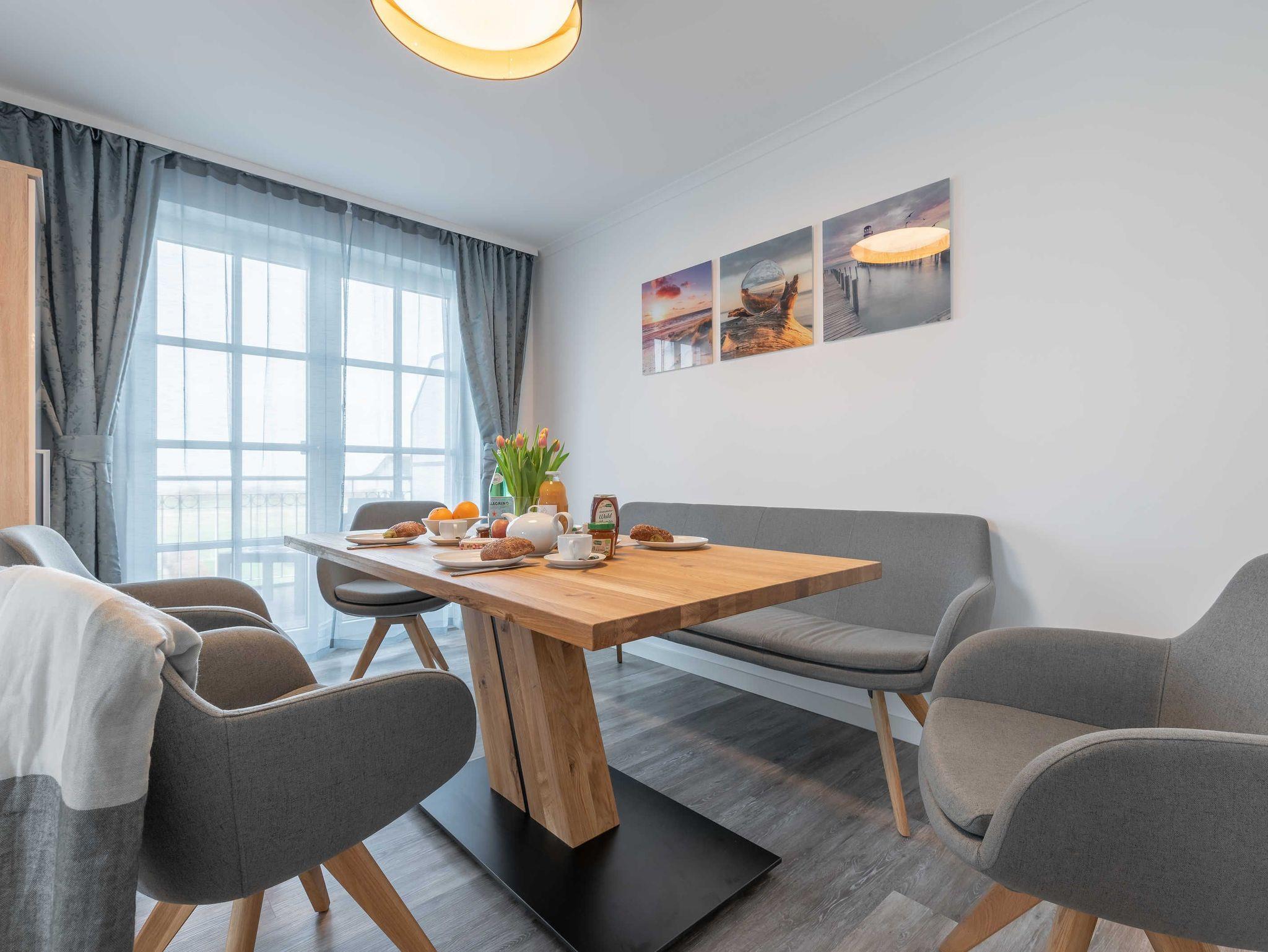 Das Esszimmer ist mit einem großen Esstisch sowie vier Stühlen und einer großen Sitzbank ausgestattet. Hier können Sie bereits beim Frühstück einen direkten Blick auf die Ostsee genießen oder beim Lesen eines Buches Ihre Blicke in die Ferne schweifen lassen.