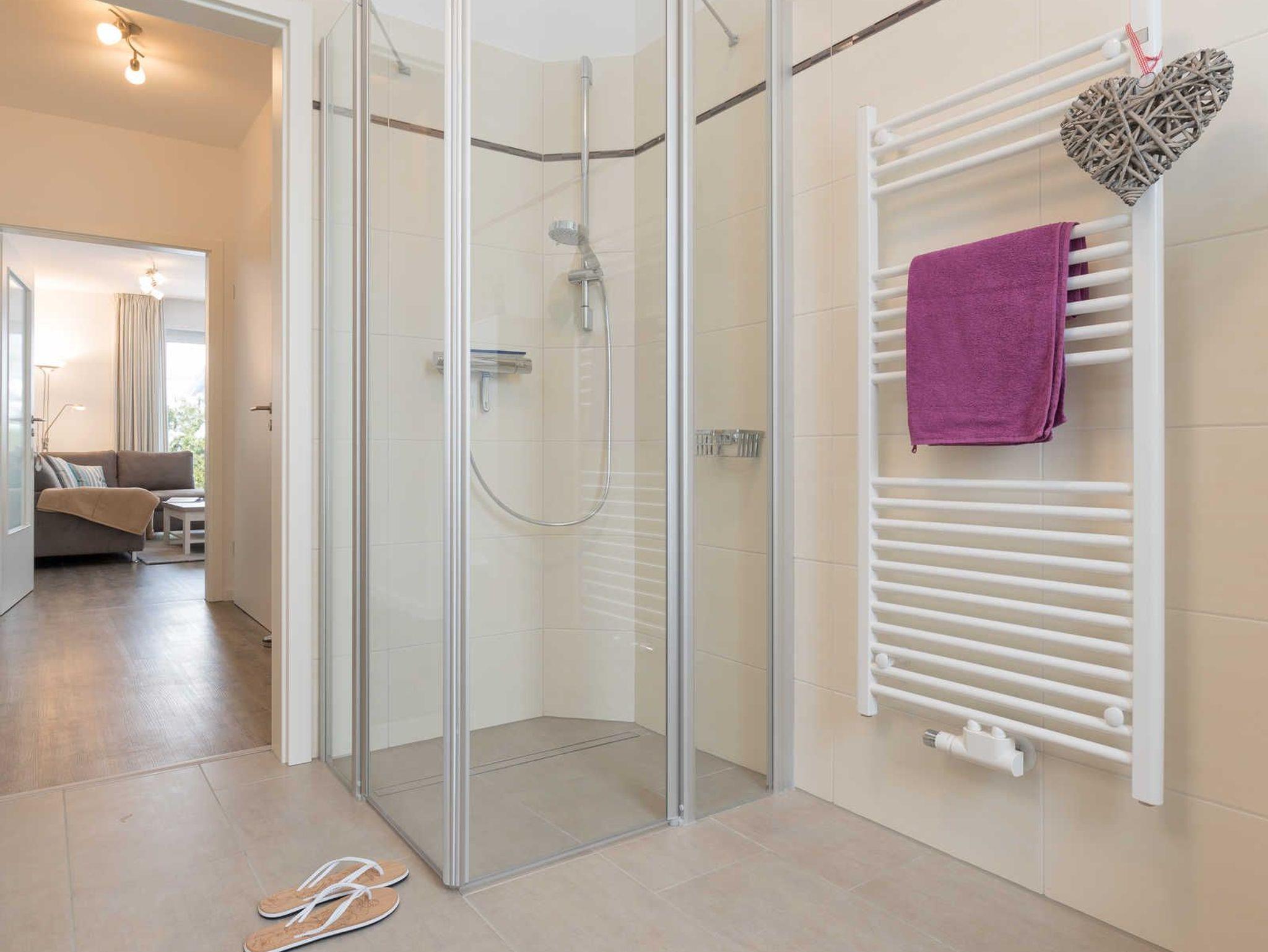 Das helle Badezimmer mit Fenster und bodengleicher Dusche verfügt über einen Waschtisch mit großem Spiegel, einen Waschtischunterschrank, einen Haartrockner und einen Handtuchheizkörper. In der kühleren Jahreszeit sorgt in allen Räumen eine Fußbodenheizung für angenehme Wärme und Gemütlichkeit.
