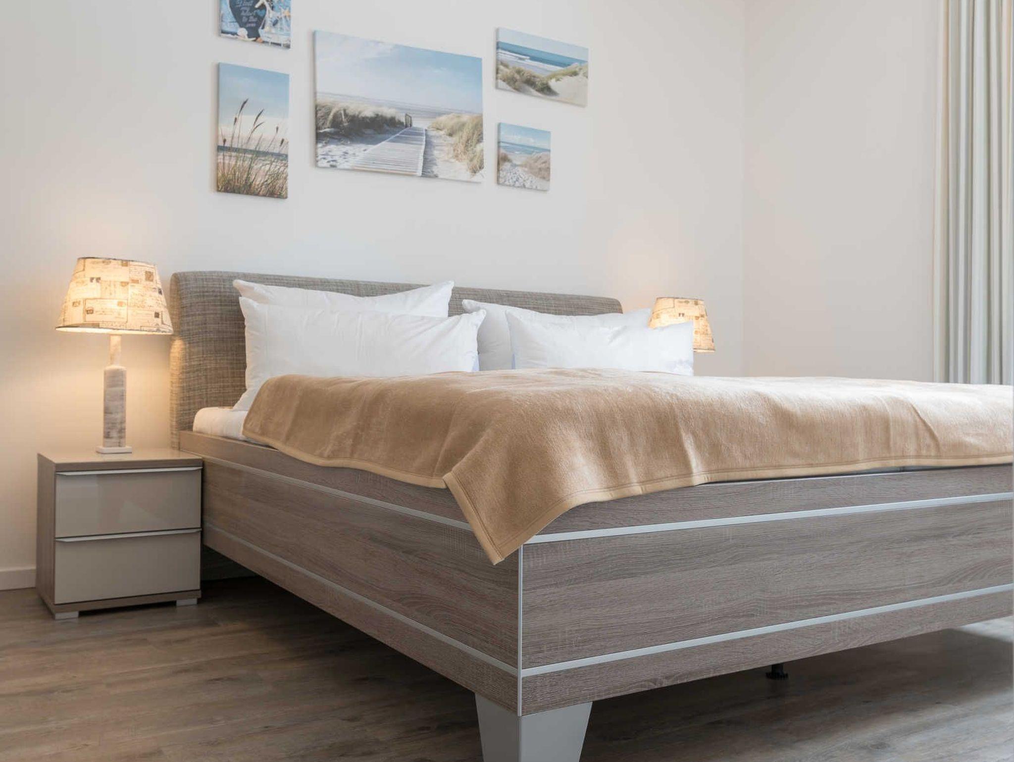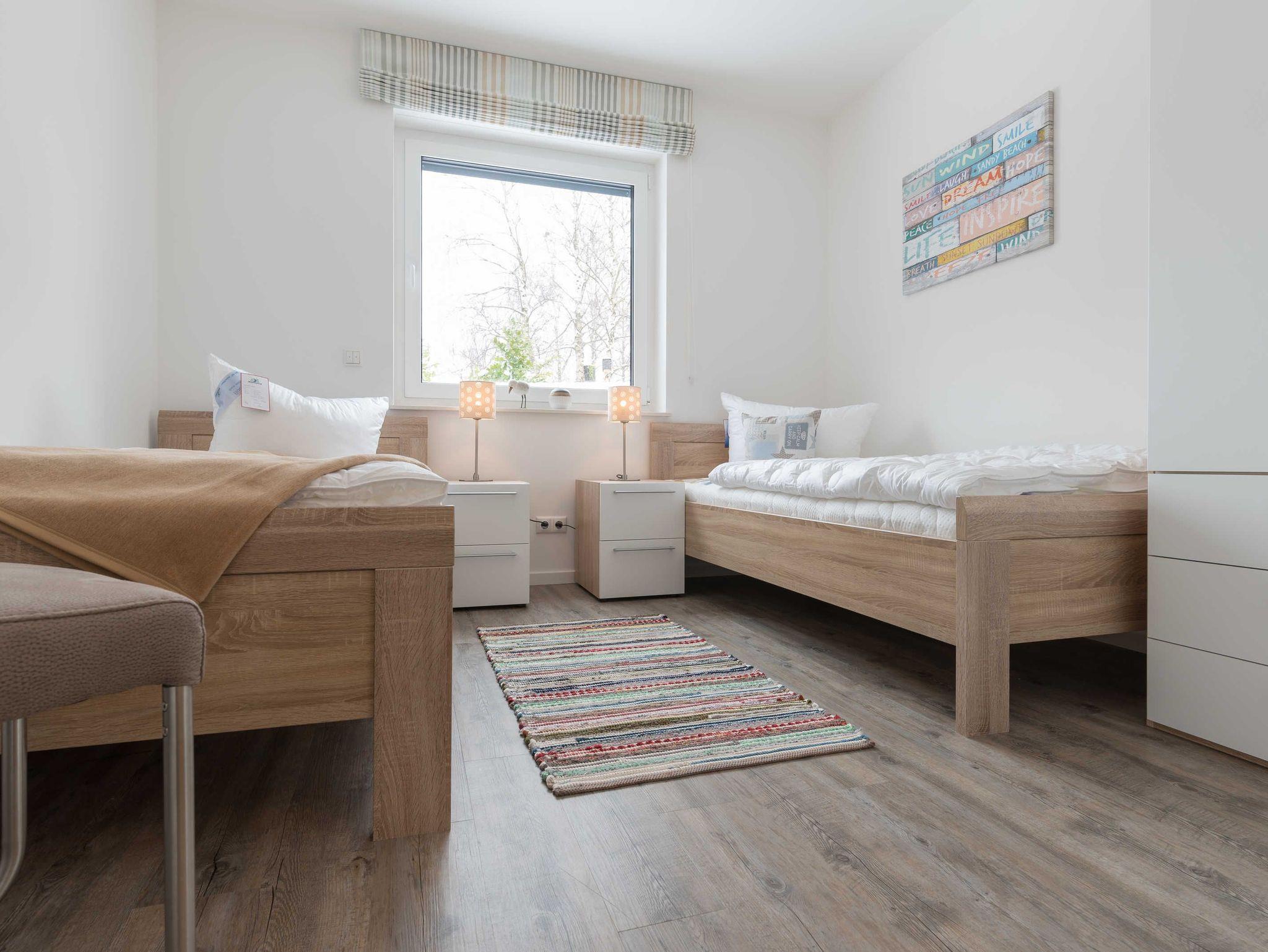 Die Ferienwohnung verfügt über zwei separate Schlafräume. Im großen Schlafzimmer befinden sich ein großzügiges Doppelbett mit zwei einzelnen Matratzen (je 0,90 m x 2,00 m) und ein großer Kleiderschrank. Im zweiten Schlafzimmer befinden sich zwei Einzelbetten (je 1,00 m x 2,00 m), ein TV mit Blu-Ray-Player und ein weiterer Kleiderschrank. Ein Kinderreisebett und ein Kinderhochstuhl stehen kostenlos zur Verfügung. Ein Wäscheset kann pro Person zugebucht werden.