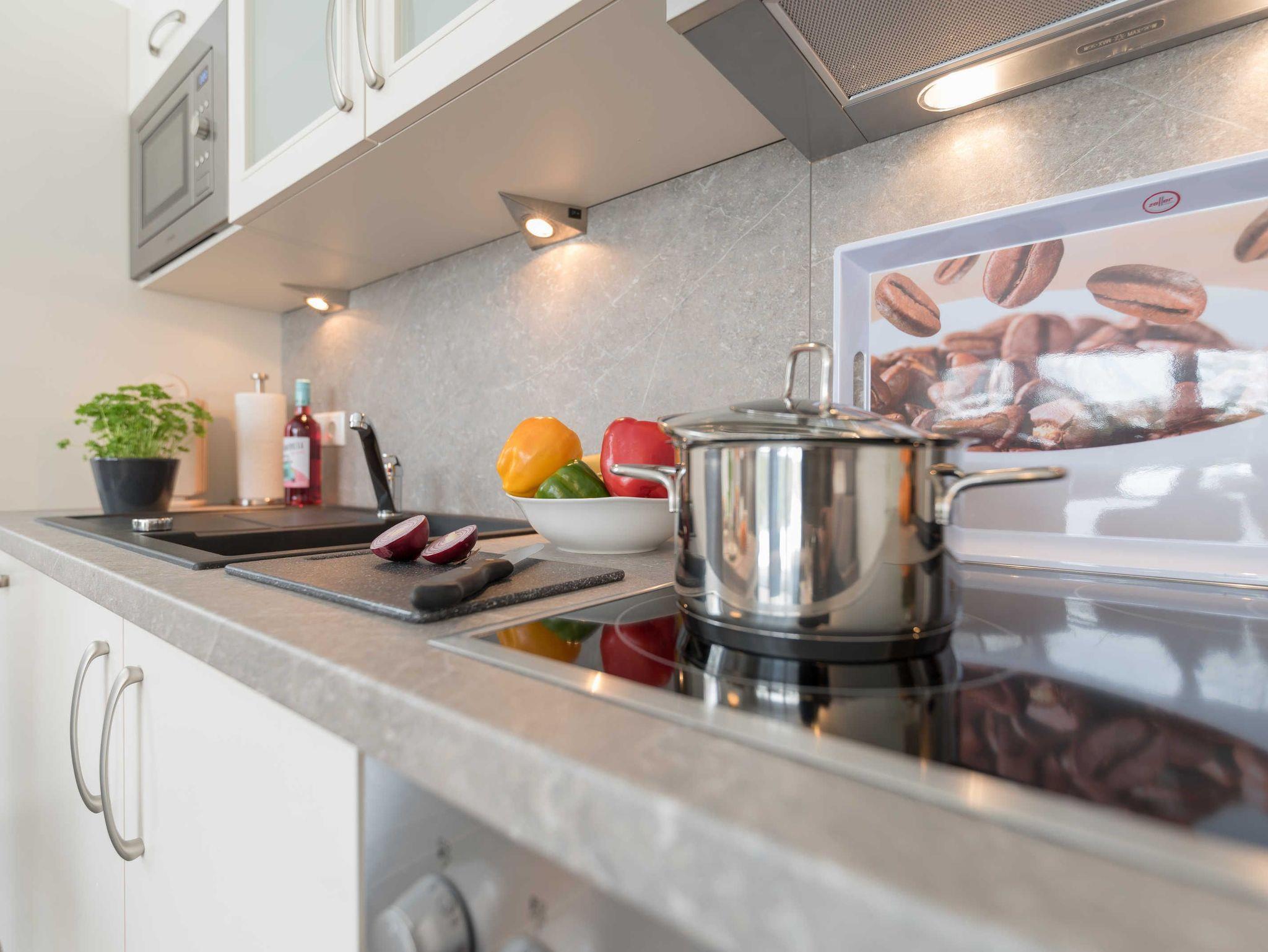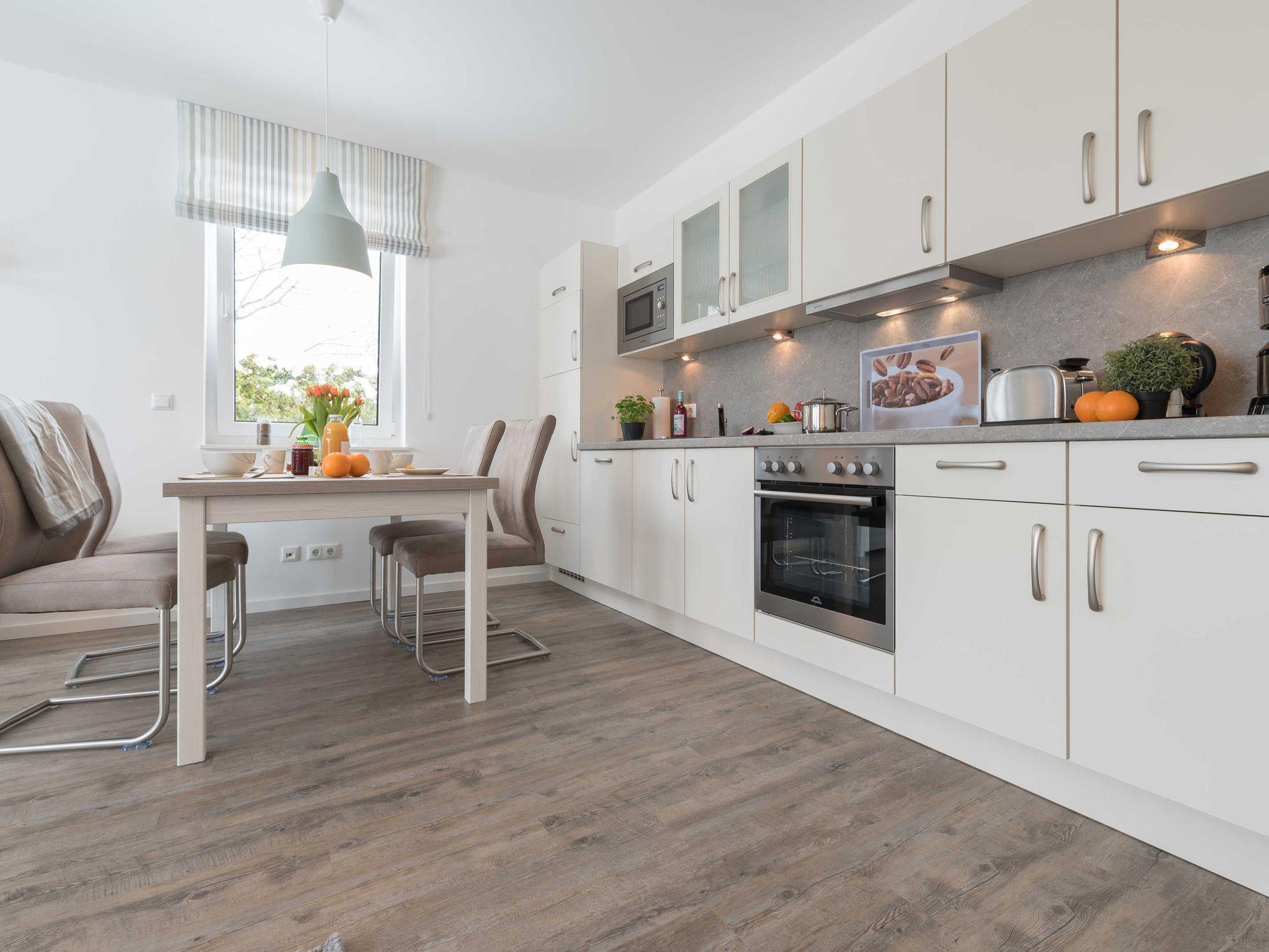 Die hochwertige, moderne Einbauküche verfügt über einen Geschirrspüler, einen Kühl- und Gefrierschrank, einen Backofen, ein Cerankochfeld, eine Mikrowelle, ein Toaster, eine Kaffeemaschine und ein Wasserkocher. Eine Geschirr-, Koch- und Zubehörausstattung vom Pfannenwender bis zum Eierbecher ist umfänglich vorhanden.