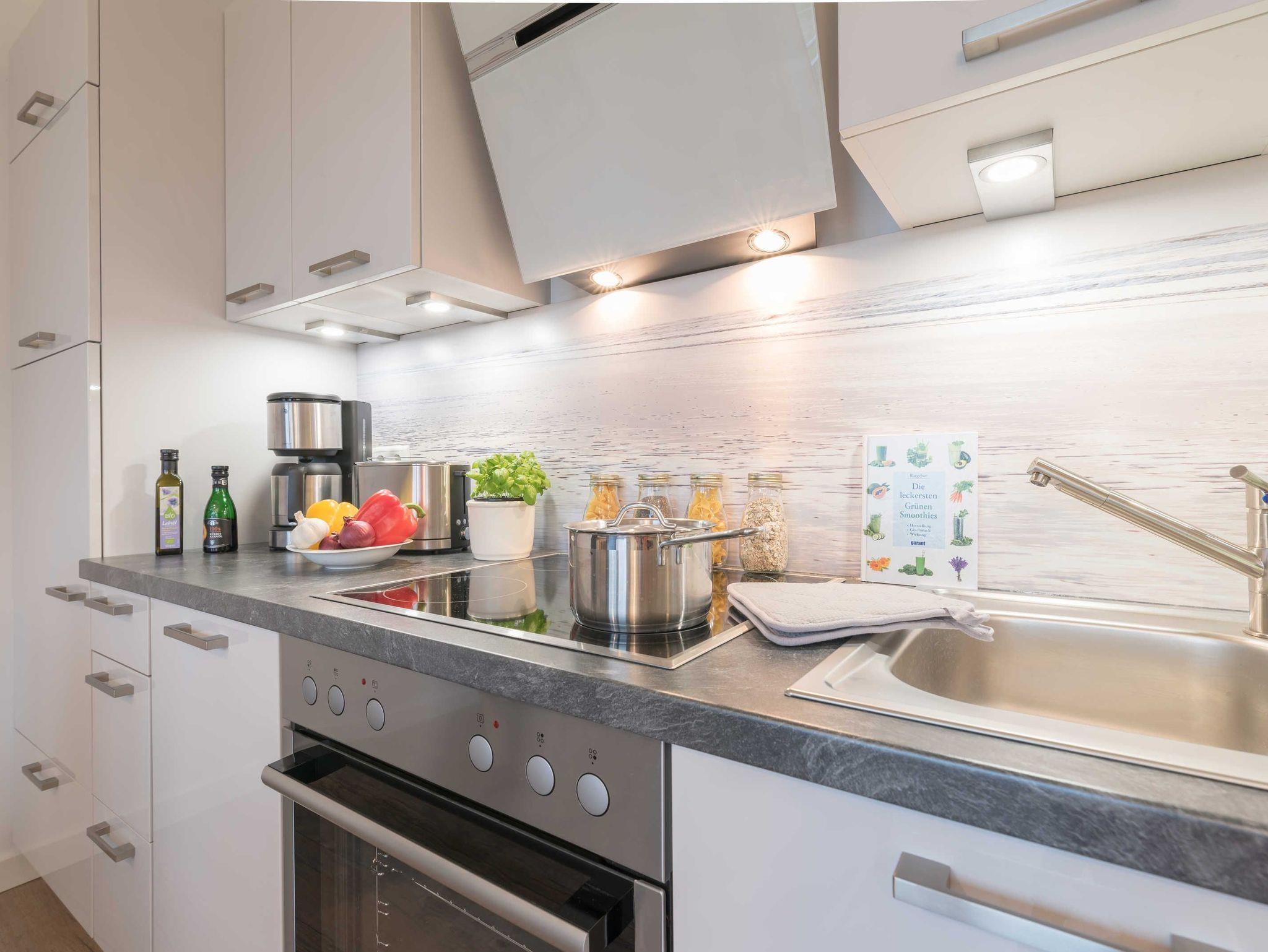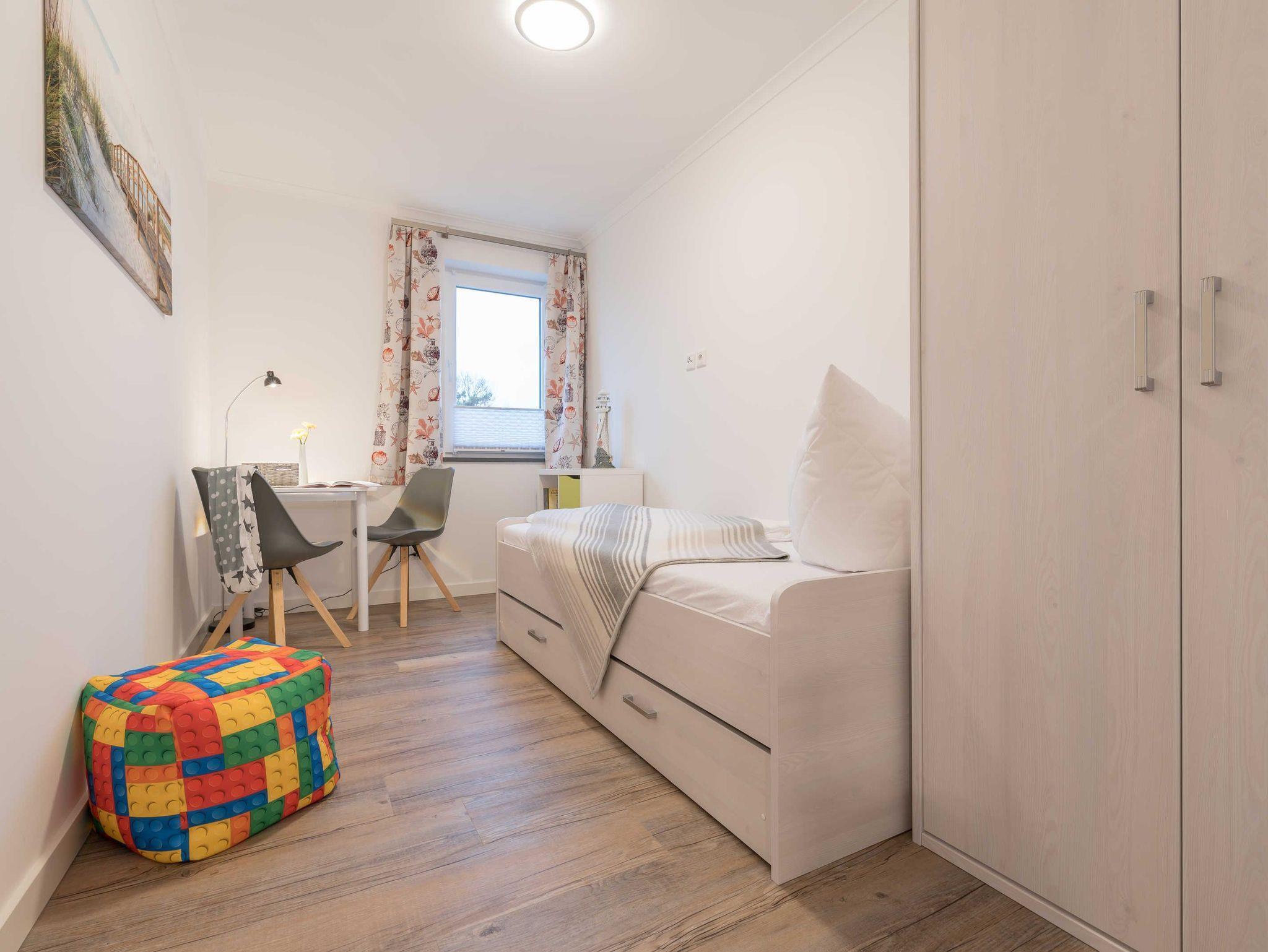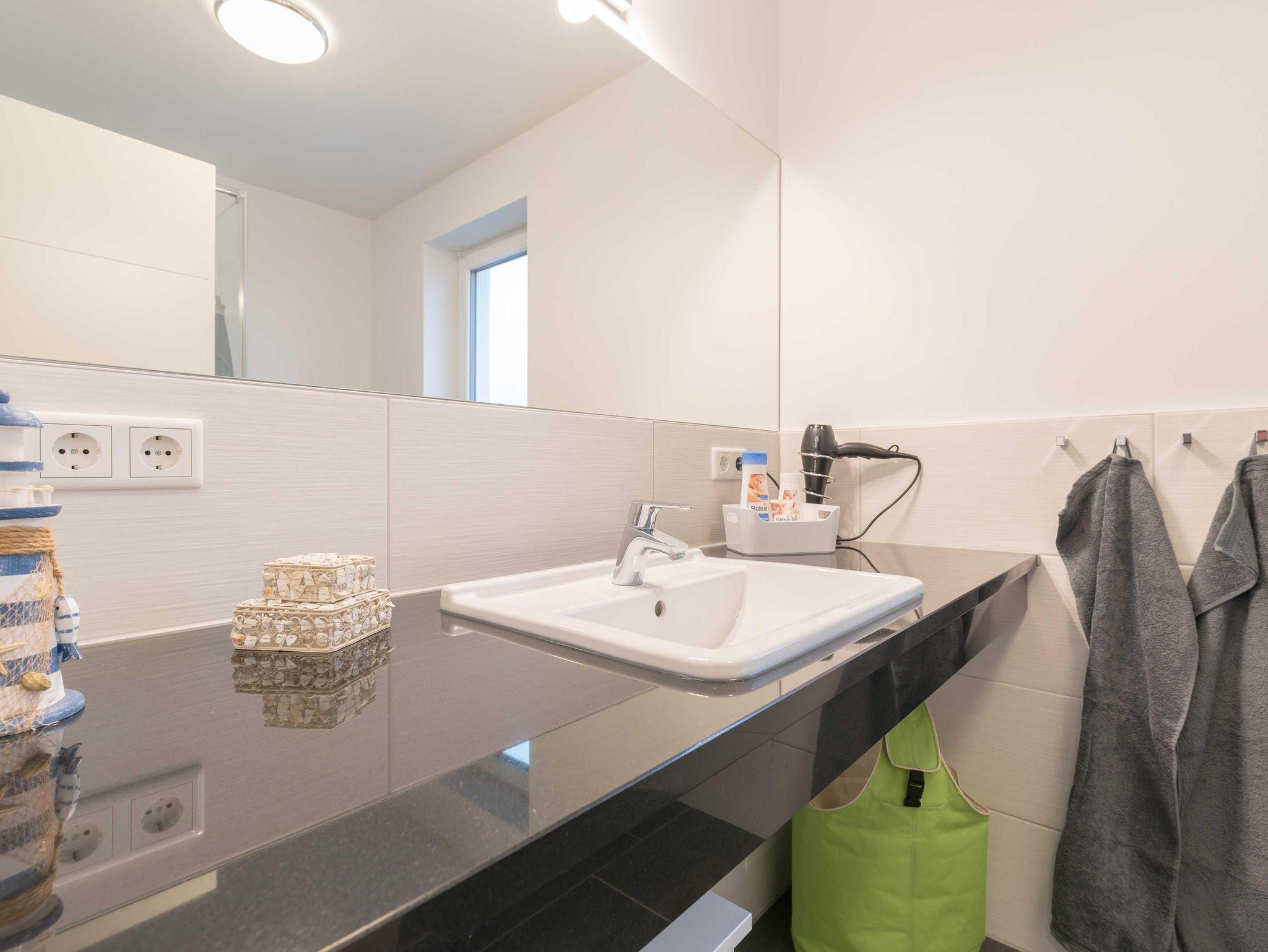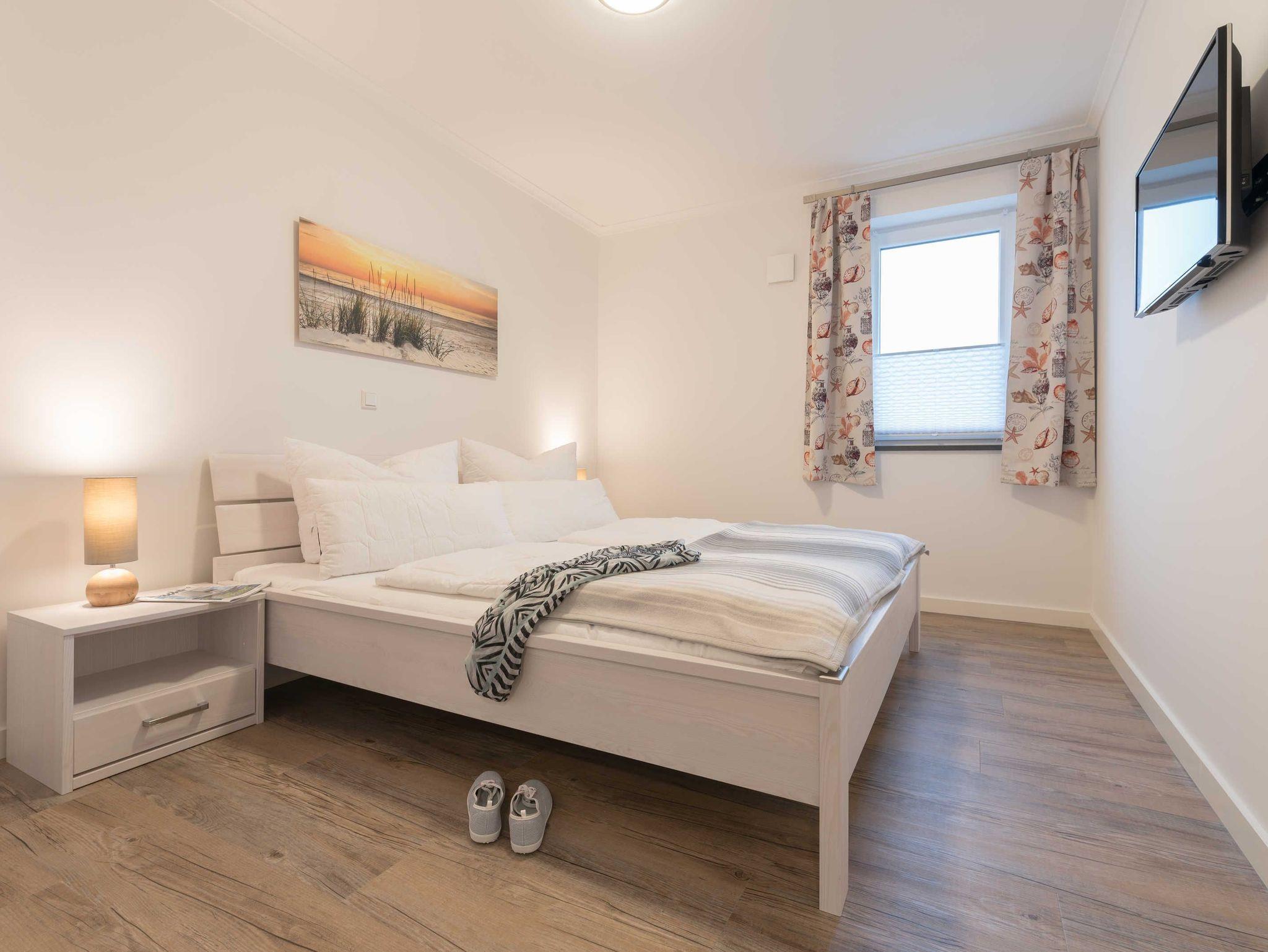 Die im maritimen Stil eingerichtete 3-Zimmer Wohnung besteht aus großzügigem Schlafzimmer, einem zweiten Schlafraum, einem kombiniertem Wohn-Esszimmer mit offener Einbauküche, einem Bad mit ebenerdiger Dusche sowie einem Abstellraum. Im hell eingerichteten Wohnzimmer laden eine gemütliche Couch sowie ein großer Esstisch, der vier Personen bequem Platz bietet, zum Verweilen ein. Die bodentiefen Fensterelemente sorgen für lichtdurchfluteten Wohngenuss und bieten Zugang zum Balkon. Die Fußbodenheizung und die einstellbare Lüftung sorgen in allen Jahreszeiten für ein angenehmes Raumklima und Gemütlichkeit. Weiterhin verfügt die Ferienwohnung über zwei separate Schlafräume. Im größeren Schlafzimmer stehen ein Doppelbett (1,90 m x 2,00 m) und ein geräumiger Kleiderschrank. Im zweiten Schlafzimmer befinden sich ein Duobett mit ausziehbarem Unterbett (0,90 m x 2,00 m) sowie ein weiterer Kleiderschrank. Die Flatscreen-TV´s in Wohn- und Schlafzimmer, ein Blu-Ray-Player und eine Stereo-Anlage gehören zur modernen Ausstattung dieser Ferienwohnung. Die Einbauküche verfügt über einen Geschirrspüler, einen Kühlschrank mit Gefrierfach, einen Backofen, ein Cerankochfeld, eine Mikrowelle, einen Toaster, eine Kaffeemaschine, einen Wasserkocher und vom Kochtopf bis zum Eierbecher über eine komplette Küchenausstattung. Das helle Badezimmer mit Fenster und ebenerdiger Dusche ist ausgestattet mit einem Waschtisch inklusive großem Spiegel, einem Haartrockner und Abstellmöglichkeiten für Ihre Waschutensilien. Im Abstellraum der Wohnung finden Sie eine Waschmaschine (4 kg), ein Wäschegestell, einen Staubsauger und haben Platz zur Lagerung.