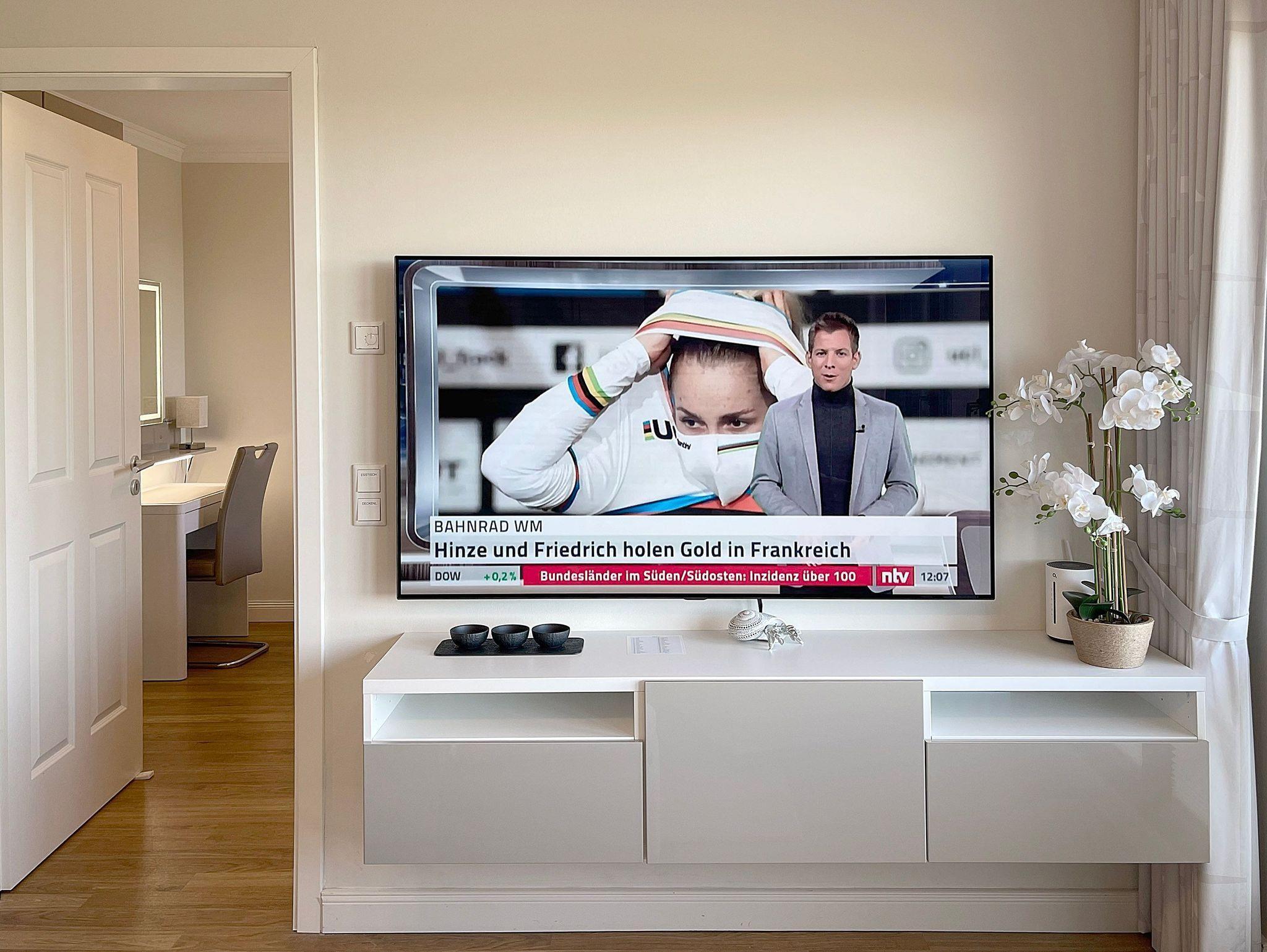 Im November 2021 neu eingerichtet, bietet diese großzügige Wohnung Platz für bis zu fünf Personen. Zwei Schlafzimmer und zwei Bäder sind perfekt für einen entspannten Aufenthalt. Eines der Schlafzimmer verfügt über ein angrenzendes Bad, ein sogenanntes „Bad en Suite“. Das zweite Bad erreicht man über einen Zwischenflur. Die Bäder sind umfassend mit einer bodentiefen Dusche, großem LED-Wandspiegel, Ablagen, Handtuchtrockner, Föhn, Personenwaage und weiteren Annehmlichkeiten ausgestattet. In den Schlafräumen erwarten Sie je ein modernes Boxspringbett mit durchgehender Matratze von 1,80 x 2,00m (linkes Schlafzimmer mittelfeste Matratze/ rechtes Schlafzimmer feste Matratze) Außerdem verfügen beide über Kleiderschrank mit Ganzkörperspiegel und eine Wandkommode. Über diesen sind moderne 43 Zoll TV- Geräte angebaut worden. Den vorhandenen Kosmetiktisch im ersten Schlafzimmer können Sie zudem als Schreibtisch nutzen. Installierte Fliegengitter sorgen in allen drei Zimmern für unbeschwerten Schlafkomfort. Bitte beachten Sie, dass in den Schlafzimmern kein Platz für den Aufbau eines zusätzlichen Kinderreisebetts ist. Im Wohnbereich empfängt Sie eine bequeme Sitzgarnitur mit ausziehbarer Schlafcouch, ein TV-Board mit einem supergroßen OLED-Fernseher, Blu-ray-Player und einem ganzen Schwung an DVDs. Ein weiteres stimmungsvolles Highlight ist der gut nutzbare Gas-Kamin. Der Bereich erstreckt sich über eine komplett eingerichtete Küchenzeile und einen Esstisch mit fünf Stühlen für gemeinsame Mahlzeiten und gesellige Spieleabende. Die integrierte Induktionsherdplatte (4-Kochstellen) sorgt für eine schnellere Zubereitung Ihrer Gerichte. Weiterhin stehen ein Backofen, Geschirrspüler, Kühlschrank mit Gefrierfach, Mikrowelle, Kaffeemaschine, „Nespressomaschine“, Wasserkocher und Toaster zur Verfügung. Es ist für ausreichende Abstell- und Unterbringungsmöglichkeiten gesorgt. Über den Wohnbereich gelangen Sie auf den herrlichen Balkon in Nord-Ausrichtung mit traumhaftem Ostseeblick. Im vorhandenen Strandkorb können Sie fantastische Sonnenuntergänge genießen. Die verbaute Fußbodenheizung sorgt in allen Räumen stets für wohlige Wärme. Zur Wohnung gehören zudem ein kostenfreier Tiefgaragenstellplatz und eine Abstellmöglichkeit für Fahrräder. Bitte beachten Sie die Durchfahrtshöhe von max. 1,90 m der Tiefgarage. Mit einem Personenaufzug gelangen Sie von der Tiefgarage aus direkt zu Ihrer Wohnung. Im Erdgeschoss der Wohnung befindet sich ein gekennzeichneter Abstellbereich für Kinderwagen. Eine Waschmaschine und ein Trockner stehen im separaten Hauswirtschaftsraum im Untergeschoss der Villa zu Ihrer Verfügung (gegen Gebühr / 1,00 € Münzen). Hier noch einige Hinweise: Es handelt sich um eine Nichtraucherwohnung. Haustiere sind nicht gestattet. Das WLAN steht kostenfrei in allen Zimmern zur Verfügung. Das Datenvolumen ist unbegrenzt, so dass Sie ohne Limit nach Herzenslust streamen können. Das Netz schwankt aber leider noch, wenn sich viele Nutzer in Börgerende im Internet befinden. Weiterhin befinden sich in der Wohnung ein Garderobenbereich, ein fest verbauter Safe für Ihre Wertsachen und zwei Abstellräume, in denen Sie bequem zusätzliche Dinge unterbringen können - auch die leeren Koffer. Hier finden Sie auch ein Bügelbrett und Dampfbügeleisen. Wäschesets, Kinderreisebett und Kinderhochstuhl können kostenpflichtig zugebucht werden. Ab der dritten Person wird ein Aufschlag in Höhe von 15,00 €/ÜN berechnet. Die Unterkunft befindet sich wenige Meter vom Badestrand entfernt in ruhiger Lage zur Promenade. Kein Autoverkehr! Sichern Sie sich einen der begehrten Strandkörbe nur ein paar Meter entfernt von den rauschenden Wellen der Ostsee (Anfang Mai - Ende August) und buchen Sie jetzt zu besonderen Konditionen (12,00 € pro Tag oder 75,00 € pro Woche.)