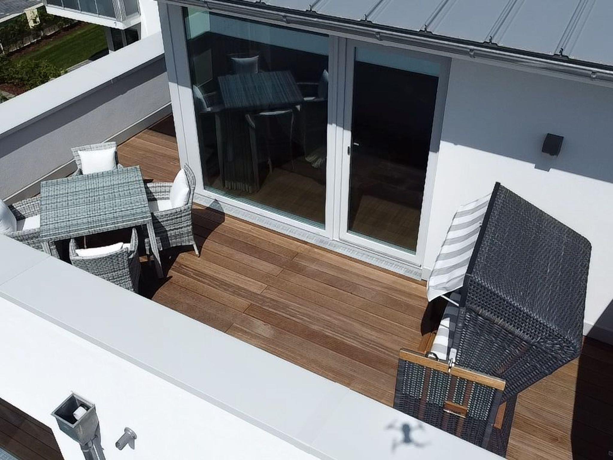 Die Ferienwohnung verfügt über eine 24 qm großen Dachterrasse, auf der Sie im Strandkorb den Sonnenuntergang exklusiv beobachten können. Ein Highlight ist das Etagenbett für Ihre Kinder, welches einer Koje nachempfunden wurde und viel Geborgenheit bietet. Ein Kinderbett inklusive Matratze und ein Hochstuhl stehen für Sie kostenfrei bereit.