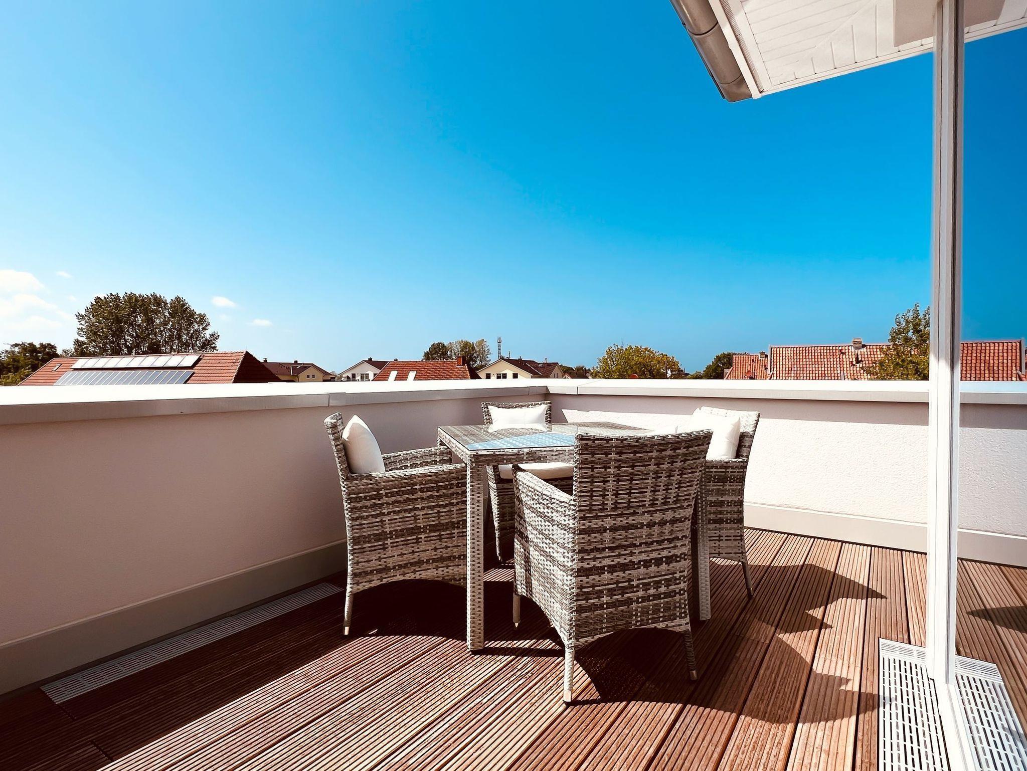 Neben der großen Dachterrasse verfügt die Fewo über ein großzügiges Schlafzimmer mit Safe, einen weiteren Schlafraum mit Kojenbett, ein Wohn- und Esszimmer mit offener Einbauküche sowie ein Bad mit ebenerdiger Dusche.