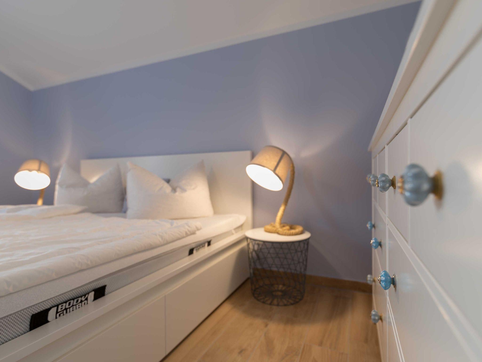 Die beiden Schlafzimmer emfangen Sie mit je einem bequemen 1,80 m Doppelbett (zwei Einzelmatratzen), einer Kommode bzw. einem Kleiderschrank und eigenem Zugang zur großen Dachterrasse. Alle Wohnräume sind mit Fußbodenheizung ausgerüstet und können bei Bedarf abgedunkelt werden.