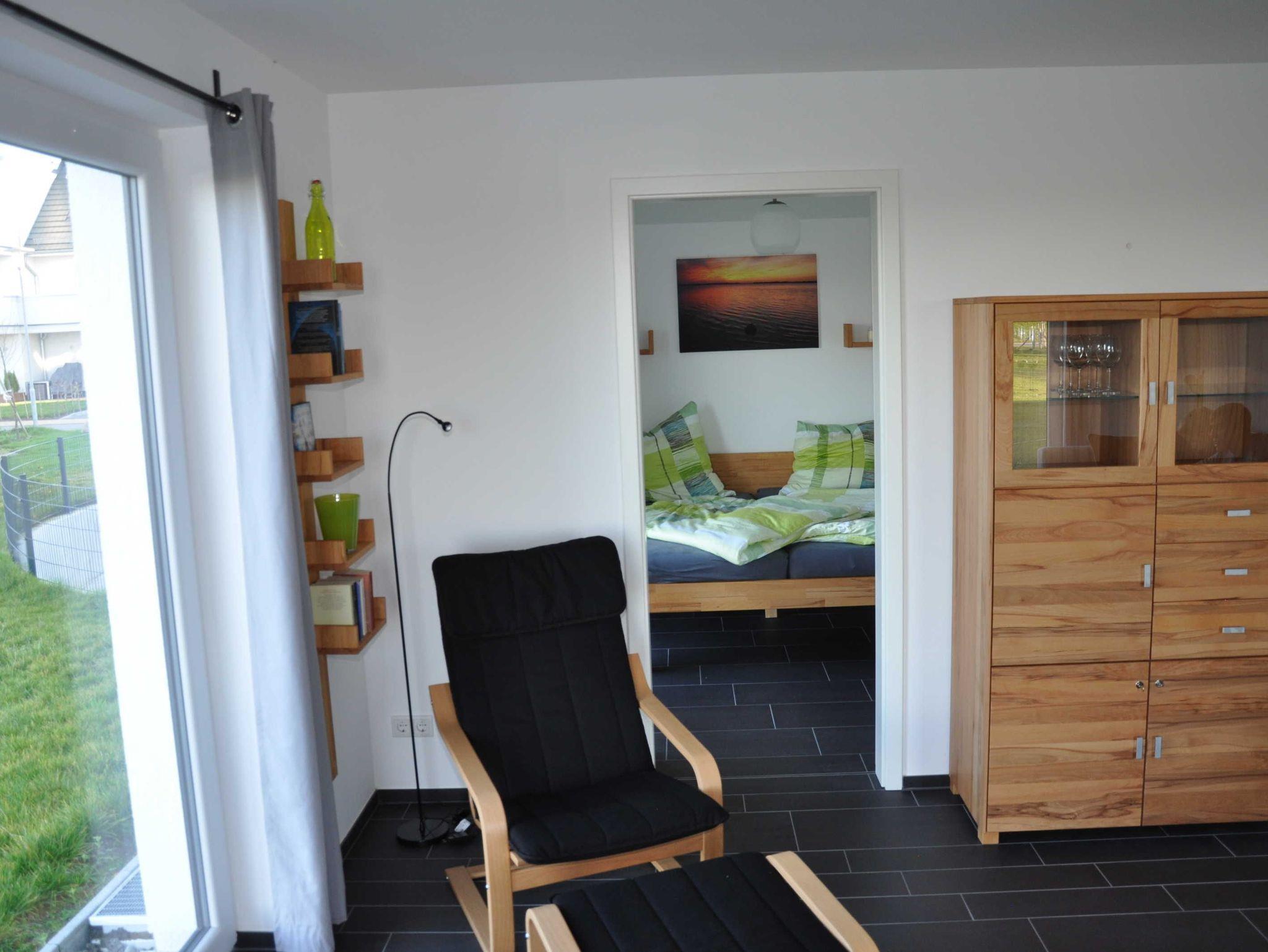 Die Wohnung bietet Ihren Gästen ein Schlafzimmer mit einem komfortablen Doppelbett (getrennte Matratzen) und ein großes Wohnzimmer mit einer bequemen Schlafcouch. Hier finden zwei weitere Personen bequem Platz. Die Ferienwohnung ist stilvoll eingerichtet. Für bunte Unterhaltung sorgen ein LED-TV und eine Stereoanlage. In der offenen Küche befindet sich eine komplett eingerichtete Einbauküche mit Backofen, Ceranfeld, Kühlschrank inklusive Gefrierfach, Geschirrspüler, Mikrowelle, Wasserkocher, Kaffeemaschine und Toaster. Das Bad mit Tageslicht verfügt über eine Dusche, eine große Spiegelfront, einen Föhn und mehrere Abstellmöglichkeiten. In der kompletten Wohnung ist eine Fußbodenheizung installiert und von jedem Zimmer aus können Sie nach außen auf die Terrasse gelangen. Starten Sie Ihren Tag mit frischen Brötchen und den Klängen der umliegenden Natur.
